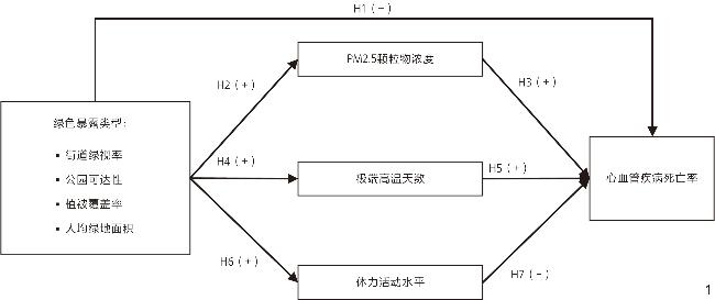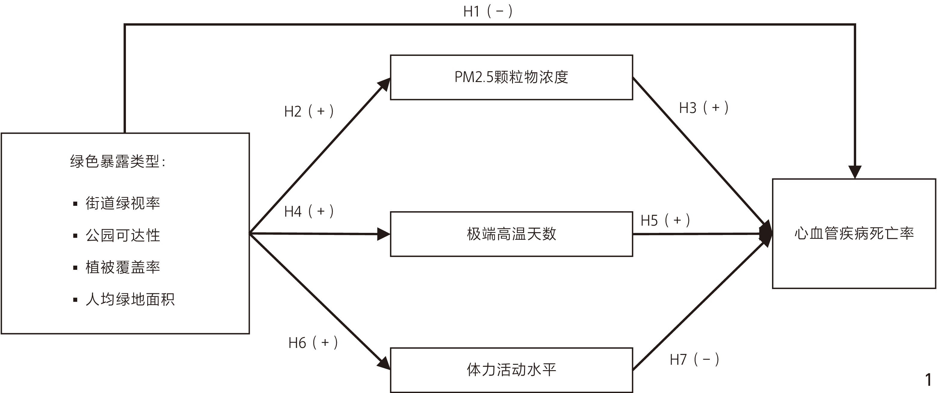 [Methods] This research uses the partial least squares structural equation modeling (PLS-SEM) to analyze how different types of green exposure (vegetation cover, park accessibility, street green visibility, and park area per capita) influence cardiovascular disease mortality in 212 communities in Shanghai, China. The model incorporates three key mediating factors: Air pollution (measured by PM2.5 concentration), extreme high temperature, and physical activity level. Through this approach, the research examines both the direct and indirect effects of vegetation coverage, park accessibility, street greenery, and per capita park area on CVDs mortality. The research draws on diverse data sources to ensure robust analysis: CVDs mortality data provided by the Shanghai Municipal Center for Disease Control and Prevention, PM2.5 concentration data retrieved from MODIS satellite imaging, temperature data sourced from Google Earth Engine, and LBS (location based services) data serving as the basis for estimating physical activity levels. This comprehensive dataset allows for an in-depth exploration of the pathways through which green exposure influences cardiovascular health in an urban context.