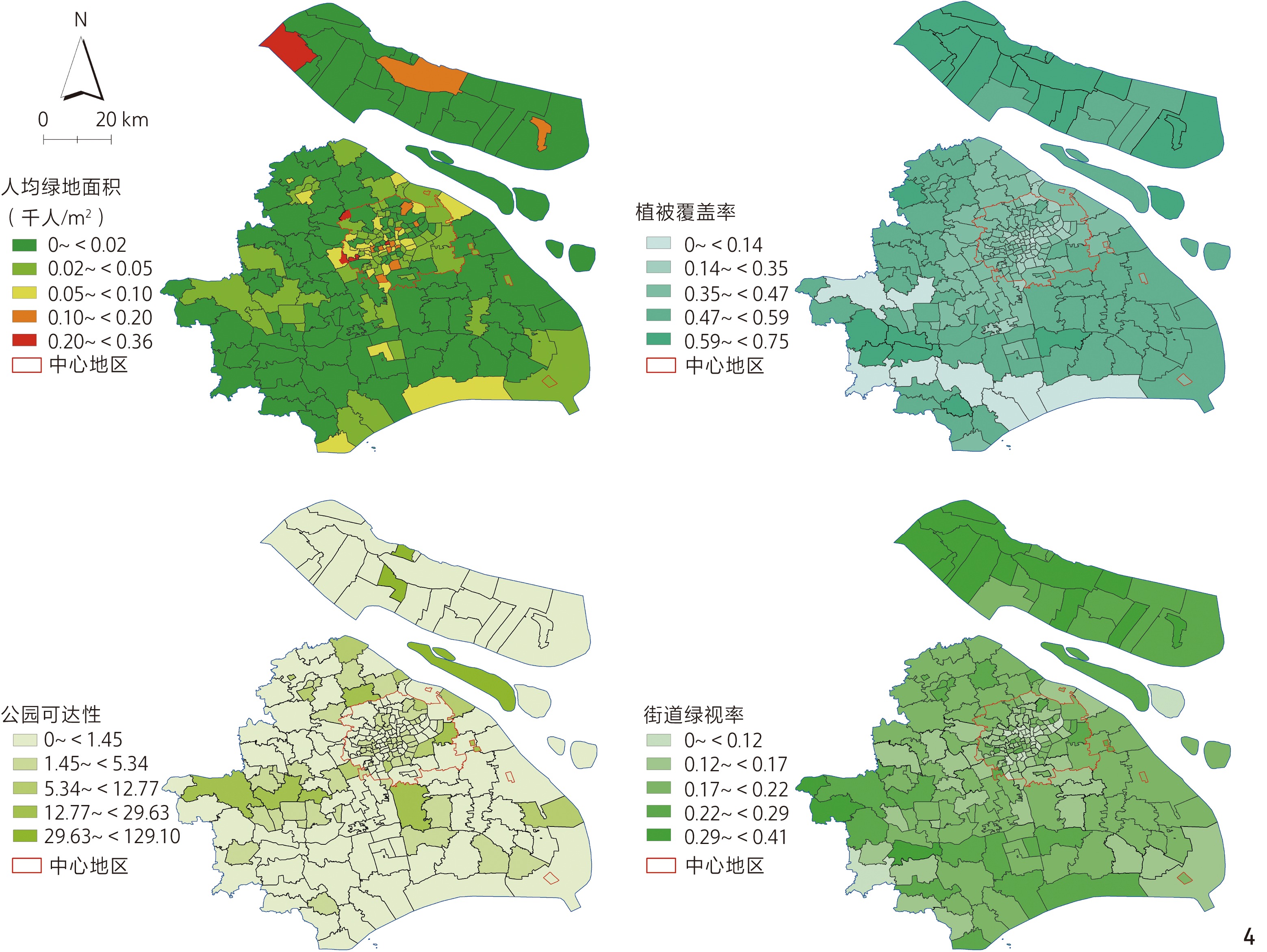 | 公园可达性 | 考虑设施的数量、空间分布和每个街道的人口需求,使用改进高斯两步移动搜索法计算[27-28] | 免费、对外开放的城市公园(面积>1 000 m2)的2020年百度地图AOI、道路数据 | 2.895(10.685) | |