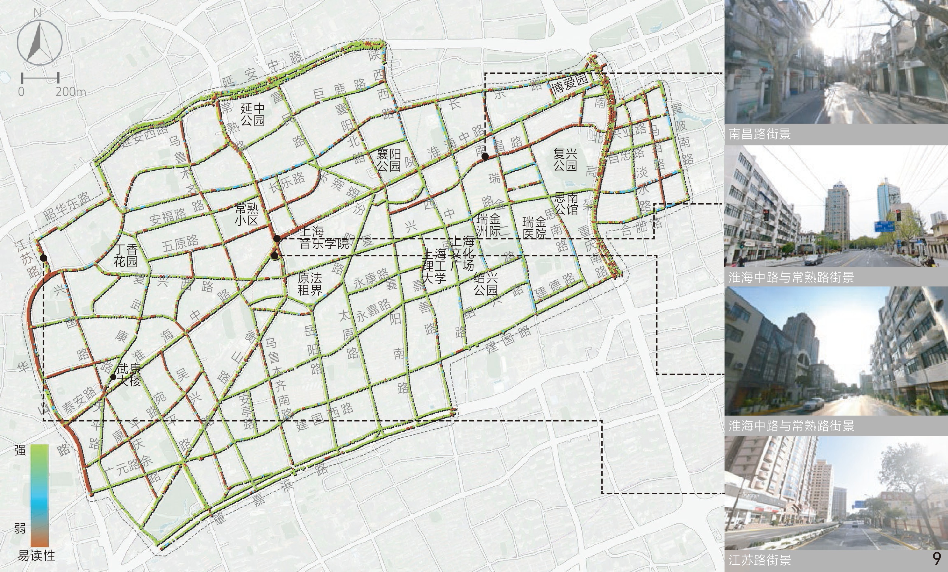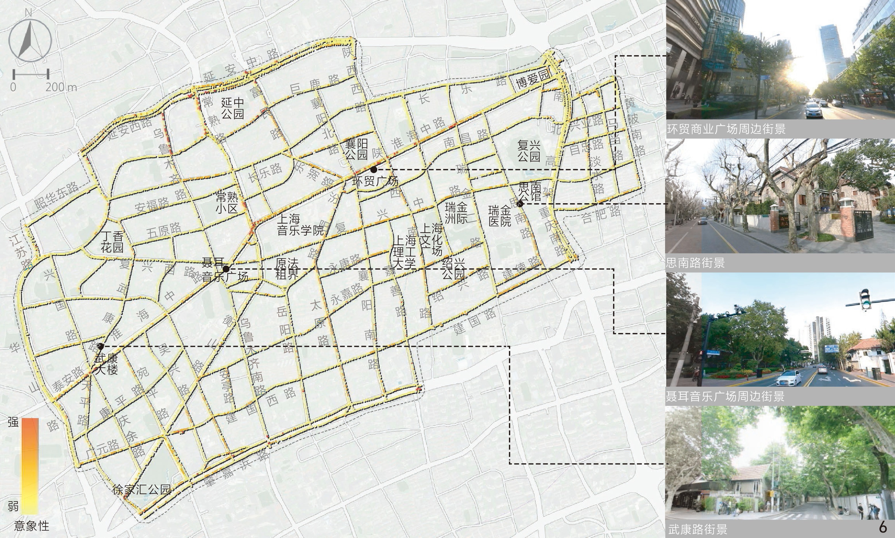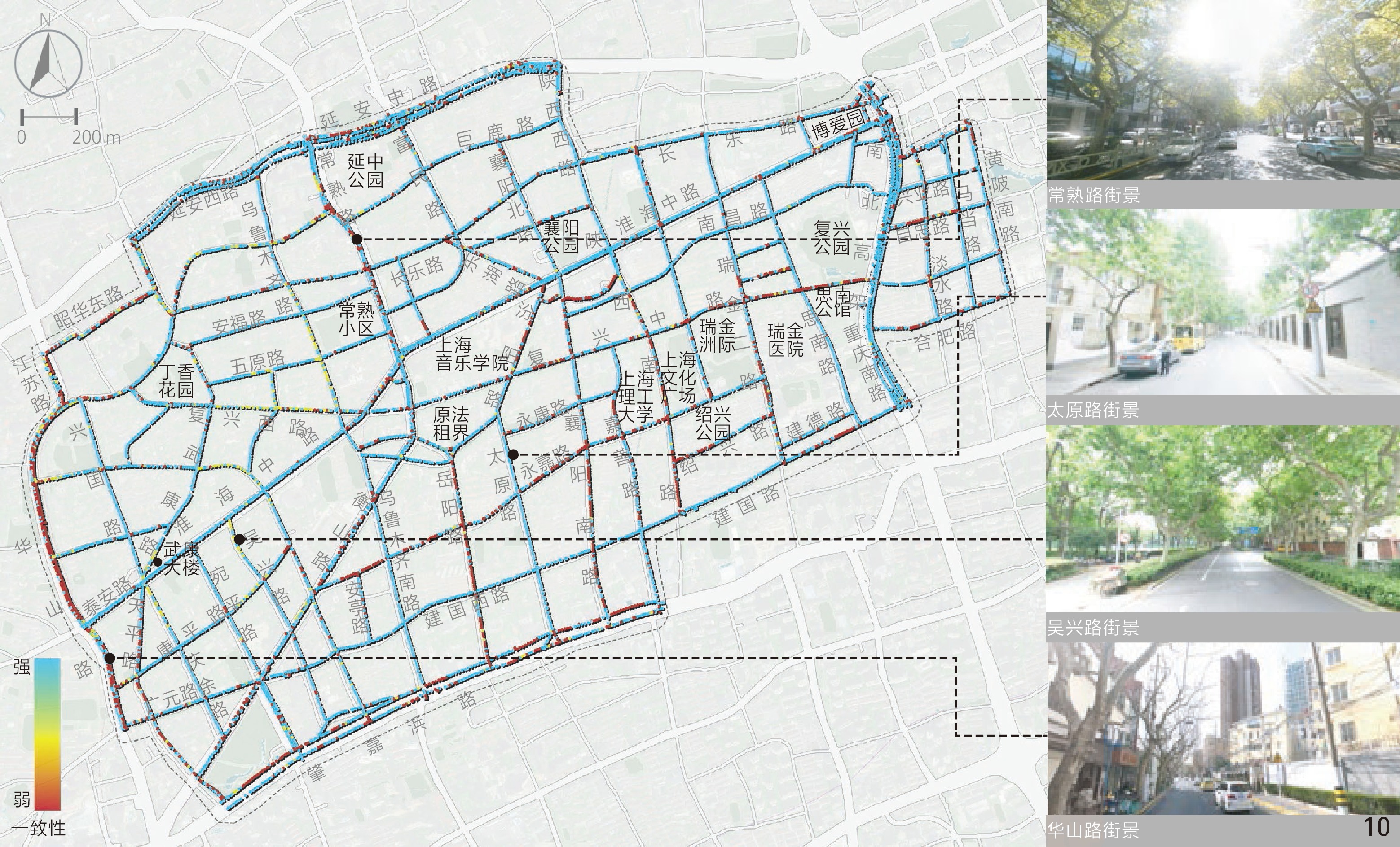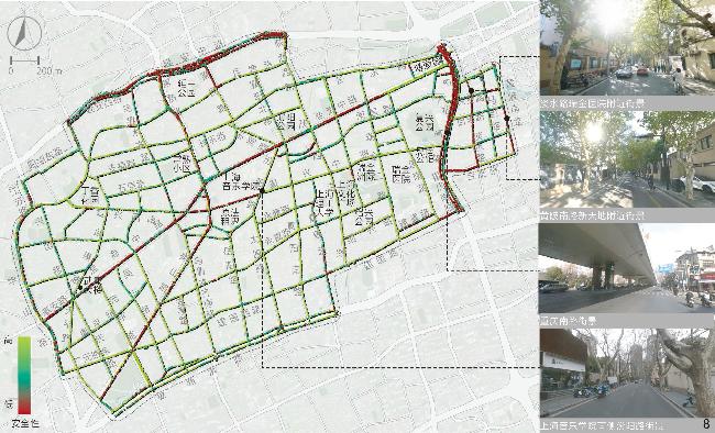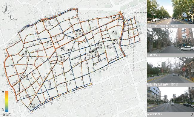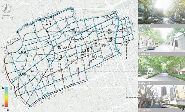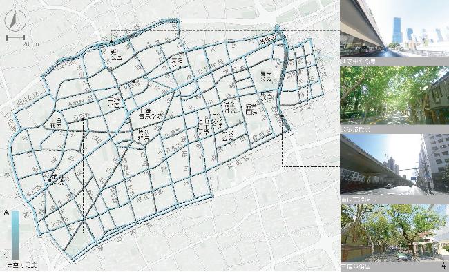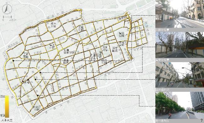 [Results] Results suggest that in the aspect of physical locality, the indicators of enclosing degree, green visibility and sky visibility are consistent in spatial distribution. Specifically, the distribution of sky visibility is basically opposite to green visibility, while enclosing degree is similarly distributed with sky visibility. In general, the enclosing degree of the Area is rated moderate, while the green visibility and sky visibility of streetscape are rated at a medium to low level. Streetscape in the northern and western parts of the Area is relatively open compared with other parts and the highest green visibility is observed in streets around Xujiahui Park located in the southwestern part of the Area. In the social aspect, safety is rated good overall, but the human scale is rated moderate and the imageability level is low. Streetscape with appropriate human scale is safer than others, which may be due to the fact that both the two human scale and safety characteristics can positively influence the comfort of perception. Overall, safety and human scale characteristics are poor in the central part of the Area around Shanghai Conservatory of Music, the intersection betwwen Huaihai Middle Road and Fuxing Middle Road, as well as Yan’an Middle Road in the north and Chongqing South Road in the east of the Area. Besides, the streetscape imageability of the Area is only rated high where unique landmarks exist. In the historic aspect, legibility of the Area appears to be better in the southern part while rated poorest in the central part and western boundary of the Area, especially in Jiangsu Road and Nanchang Road close to the north side of the Fuxing Park. Among the characteristics in relation to aesthetic aspect, visual diversity, coherence and permeability show no direct or indirect correlation with each other in spatial distribution. The visual diversity and coherence of streetscape are rated good in the research area, but the permeability of streetscape is less satisfied. The visual diversity of streetscape at the intersection between Changshu Road and Huaihai Middle Road and along Jianguo West Road in the south is poor, and the permeability is also quite poor. In addition, the roads with low traffic hierarchy such as branches and alleys are generally rated better than those with high traffic hierarchy in terms of human scale, coherence and permeability.