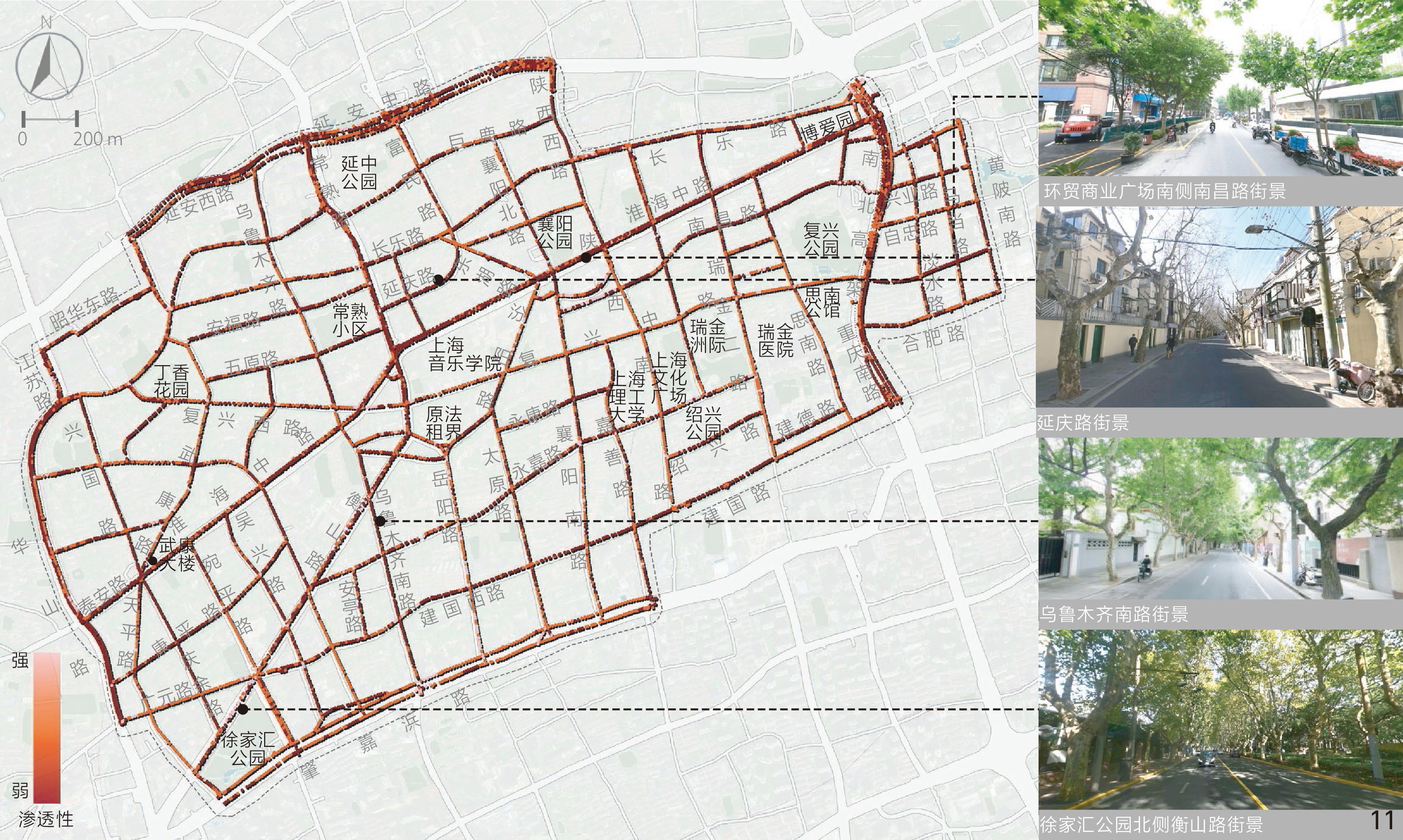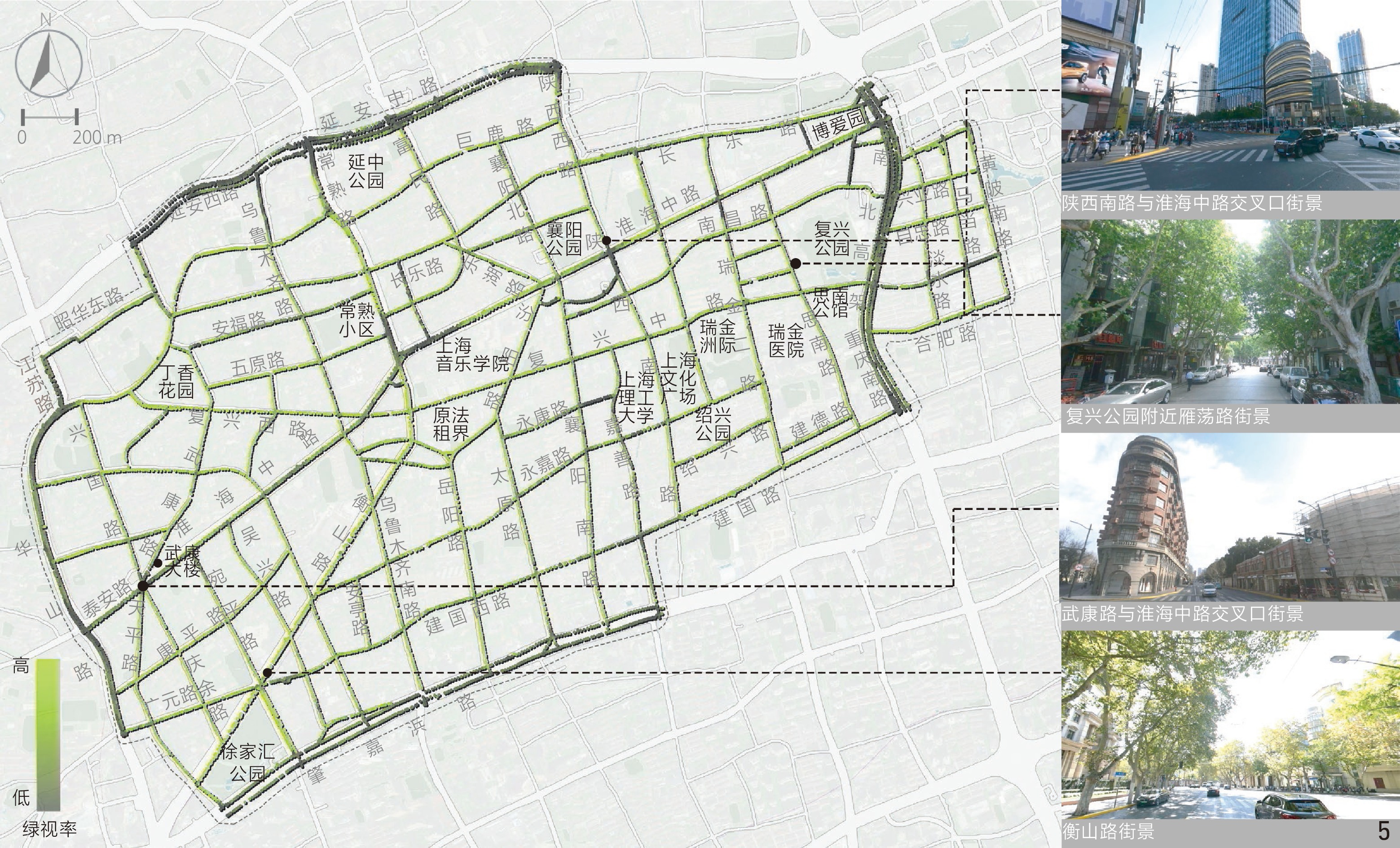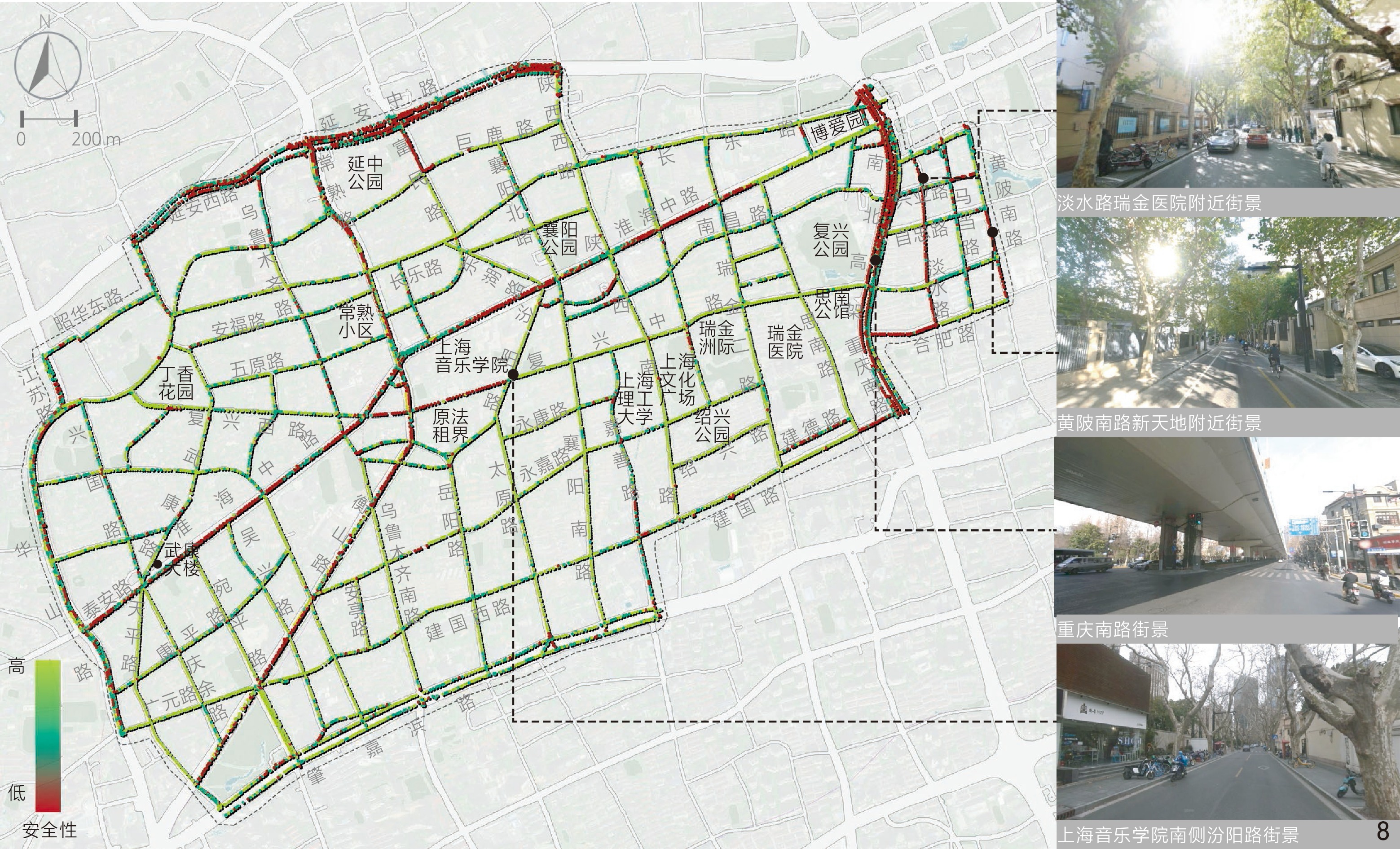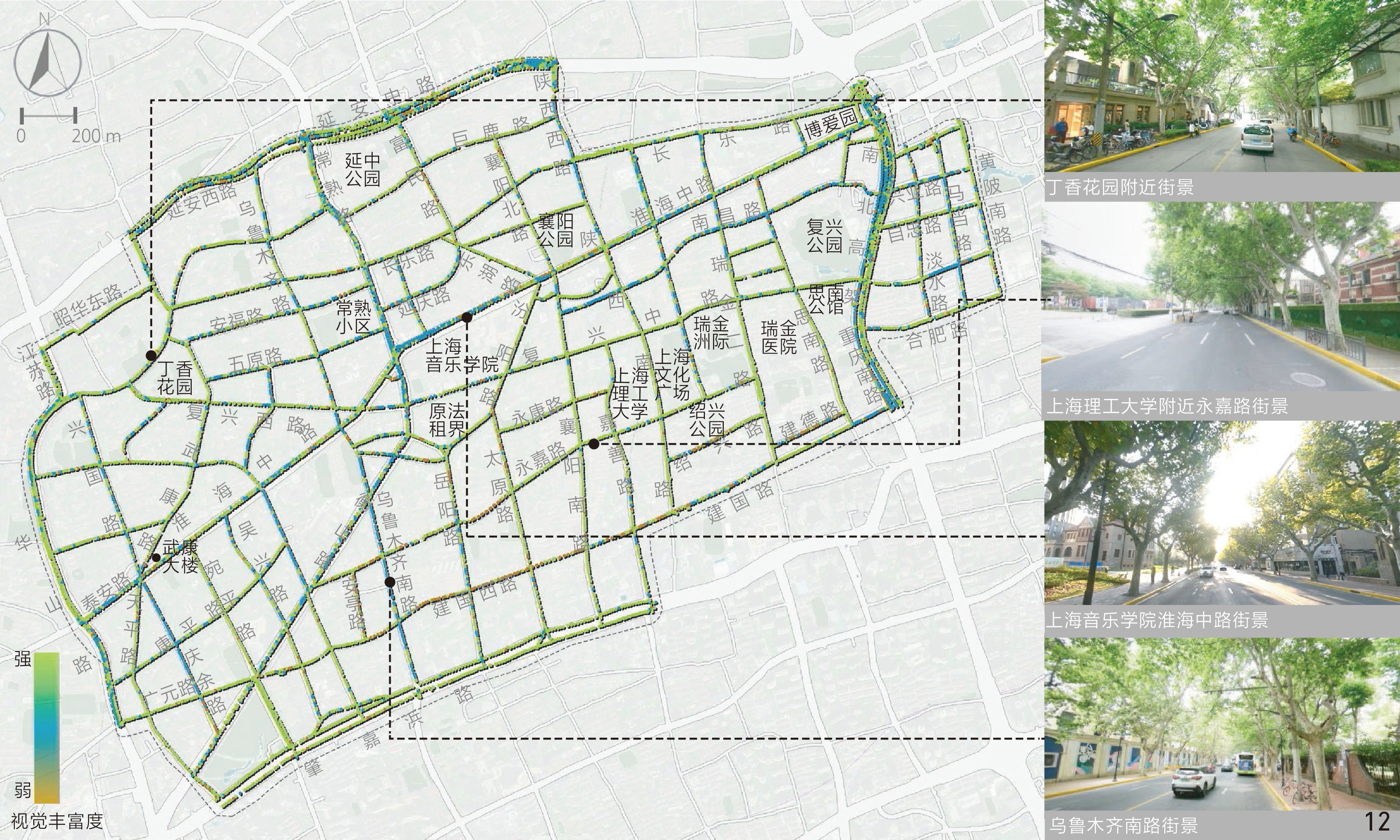 [Results] Results suggest that in the aspect of physical locality, the indicators of enclosing degree, green visibility and sky visibility are consistent in spatial distribution. Specifically, the distribution of sky visibility is basically opposite to green visibility, while enclosing degree is similarly distributed with sky visibility. In general, the enclosing degree of the Area is rated moderate, while the green visibility and sky visibility of streetscape are rated at a medium to low level. Streetscape in the northern and western parts of the Area is relatively open compared with other parts and the highest green visibility is observed in streets around Xujiahui Park located in the southwestern part of the Area. In the social aspect, safety is rated good overall, but the human scale is rated moderate and the imageability level is low. Streetscape with appropriate human scale is safer than others, which may be due to the fact that both the two human scale and safety characteristics can positively influence the comfort of perception. Overall, safety and human scale characteristics are poor in the central part of the Area around Shanghai Conservatory of Music, the intersection betwwen Huaihai Middle Road and Fuxing Middle Road, as well as Yan’an Middle Road in the north and Chongqing South Road in the east of the Area. Besides, the streetscape imageability of the Area is only rated high where unique landmarks exist. In the historic aspect, legibility of the Area appears to be better in the southern part while rated poorest in the central part and western boundary of the Area, especially in Jiangsu Road and Nanchang Road close to the north side of the Fuxing Park. Among the characteristics in relation to aesthetic aspect, visual diversity, coherence and permeability show no direct or indirect correlation with each other in spatial distribution. The visual diversity and coherence of streetscape are rated good in the research area, but the permeability of streetscape is less satisfied. The visual diversity of streetscape at the intersection between Changshu Road and Huaihai Middle Road and along Jianguo West Road in the south is poor, and the permeability is also quite poor. In addition, the roads with low traffic hierarchy such as branches and alleys are generally rated better than those with high traffic hierarchy in terms of human scale, coherence and permeability.