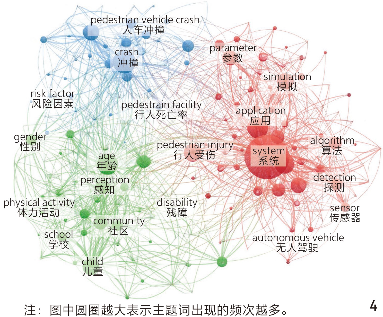 图4 基于WoS检索的步行安全主题词知识图谱Fig. 4 Knowledge graph of title terms on walking safety based on WoS retrieval |