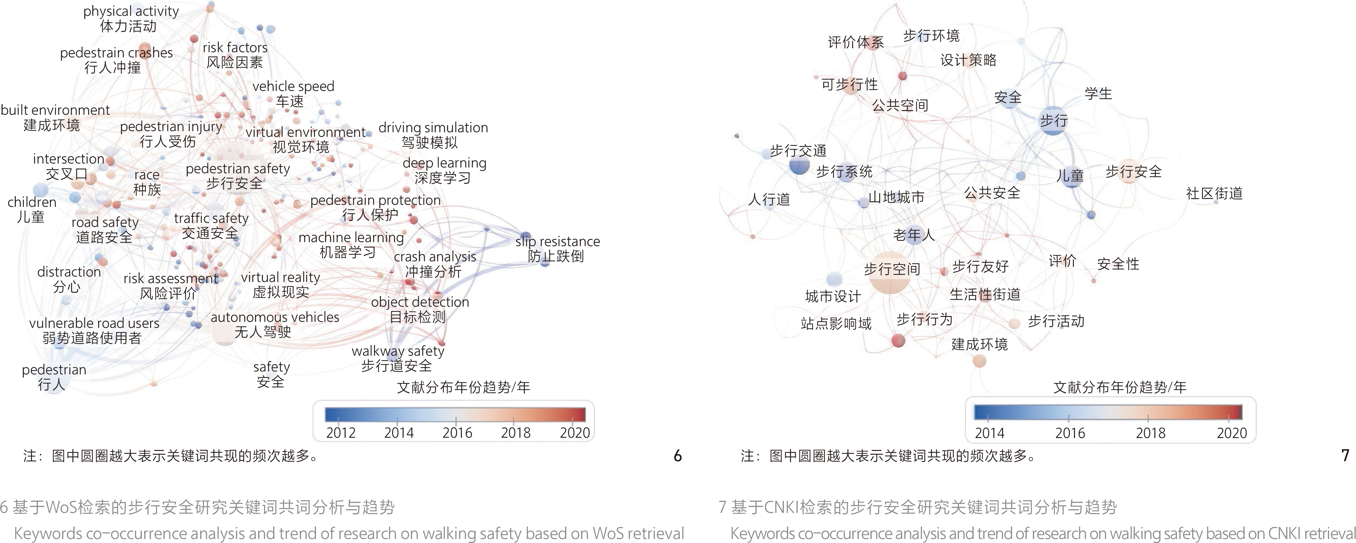 [Results] Firstly, from the perspective of literature distribution, a large number of works of scholars in such fields as traffic engineering, public health and sociology have been cited in literature on walking safety, reflecting that pedestrians’ activity safety, traffic safety and security needs are important directions to promote the research on walking safety. At present, the research on walking safety in developed countries is more active and fruitful. The advanced urbanization process and prominent social contradictions make developed countries and regions more capable of investing energy and funds in walking safety research, exploring the safety issues faced by vulnerable road users, and deepening the degree of research refinement. Secondly, from the perspective of research evolution, the research has the following findings. 1) The analysis results of highly cited literature concerns show that walking safety and walkers’ safety perception dominate the development direction of relevant research. 2) Based on WoS database, the analysis of theme words shows that taking accident analysis as the core, taking pedestrian characteristics as the perspective and taking new technology as the guidance are the three major topics in the field of walking safety research. New data and technologies support the analysis of core environmental factors influencing walking safety. 3) Based on CNKI database, the analysis of keywords shows that domestic research focuses on the spatial quality of walking environment and the special needs of vulnerable walkers, and it is urgent to establish a walking safety environment evaluation system in China. In addition, the keyword analysis also shows that the impact of built environment on pedestrian safety accidents and pedestrian safety perception has become a focus of attention. Thirdly, from the perspective of research hotspot, it can be seen form the three dimensions of activity safety, traffic safety and security that, different levels of environmental elements such as neighborhoods, streets and intersections, have important influence on walking safety. In recent years, the extensive application of quantitative analysis and data calculation methods has brought new ideas and technologies to the research. Especially in the field of data mining regarding urban form and walkers’ psychological perception, new technologies are helpful for in-depth analysis of the influence of built environment factors on walking safety. Finally, the research trend of walking safety is reflected in three aspects: Research object, content and method. Research object has expanded from collision accident to walkers’ psychological perception, and researchers increasingly pay attention to the influence of the safety quality of walking environment on pedestrian psychology. As the urban built environment is facing more and more complex conditions, the research focus extends from the analysis of individual collision accidents to the comprehensive urban environment construction. Research methods have also been developed from single-specialty technical analysis to multi-dimensional integrated research, which promotes the comprehensive application of research methods from such fields as environmental psychology, traffic safety and road engineering in the research on walking safety.