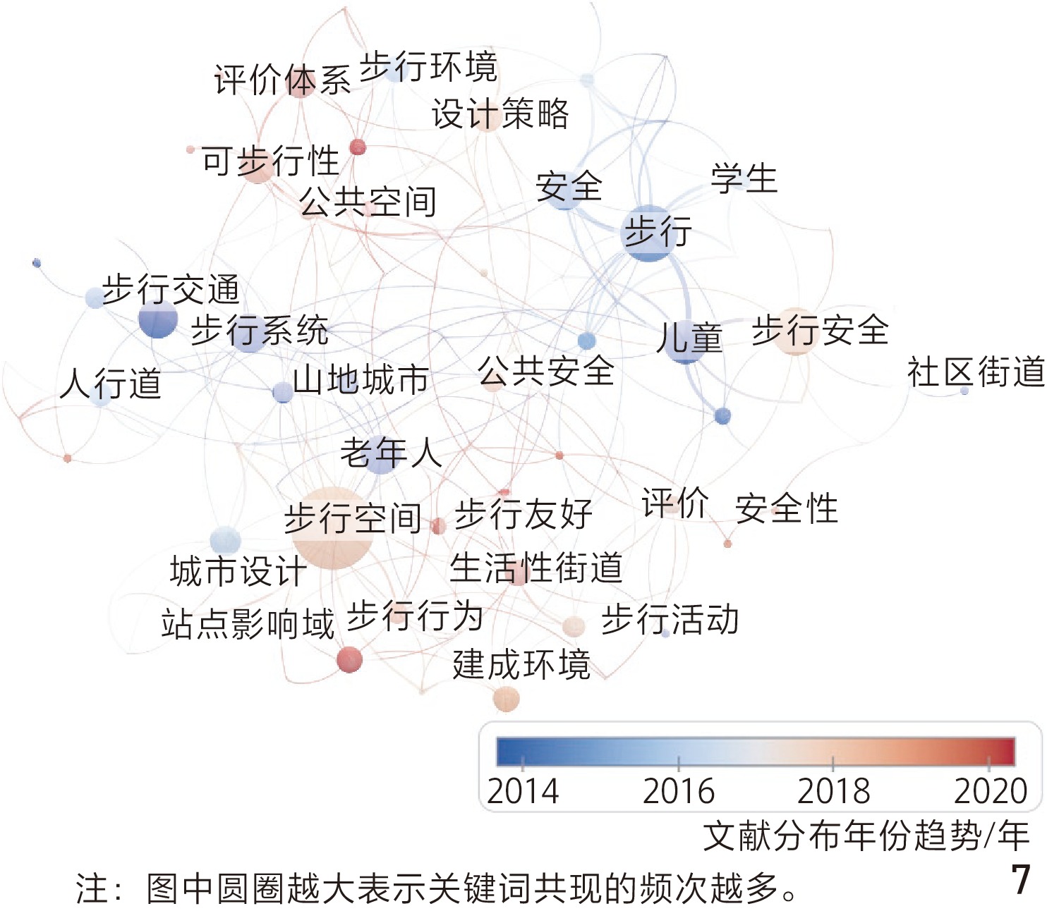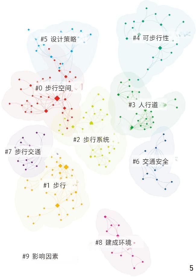 图5 基于CNKI检索的步行安全关键词聚类图谱Fig. 5 Clustering graph of keywords on walking safety based on CNKI retrieval |