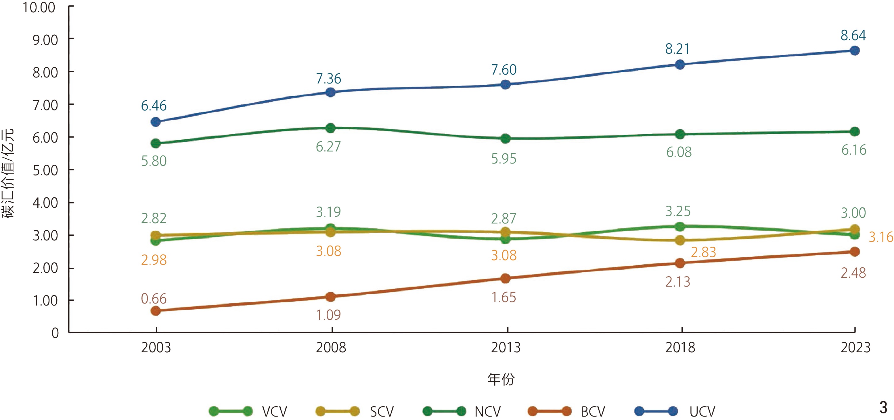 | VCV/ 亿元 | 地均VCV/ 元·hm-2 | SCV/ 亿元 | 地均SCV/ 元·hm-2 | BCV/ 亿元 | 地均BCV/ 元·hm-2 | UCV/ 亿元 | 地均UCV/ 元·hm-2 | ||||