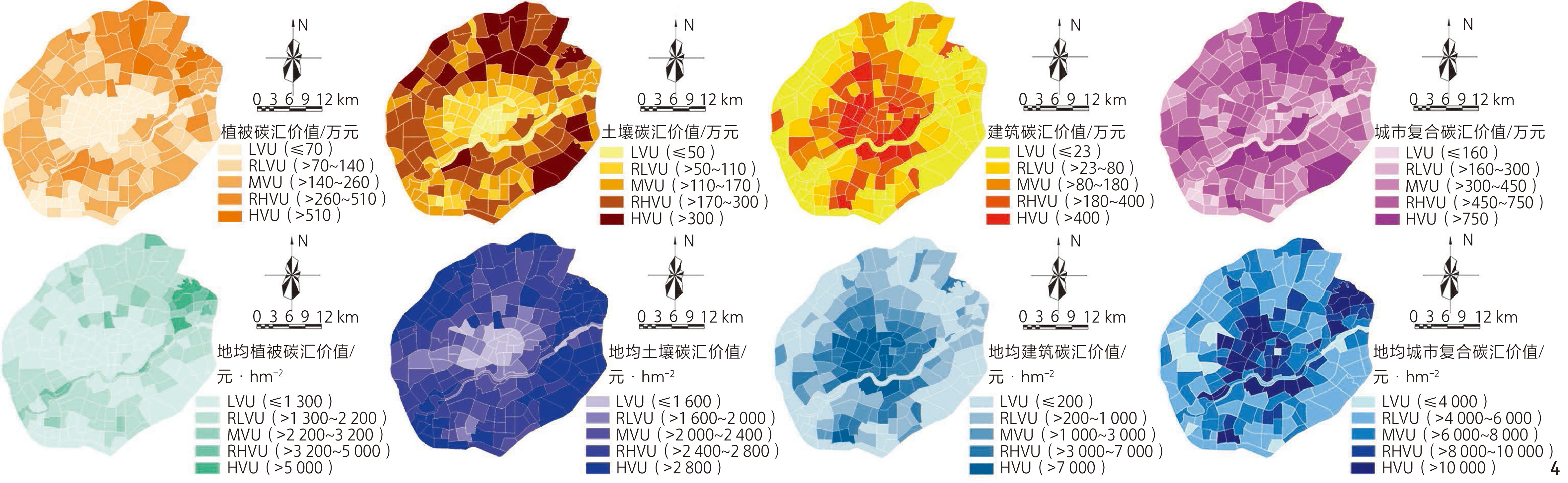 | 注:地均碳汇价值为单位土地面积某类型碳汇要素的碳汇价值,即该类型碳汇价值除以控规单元的面积。 | |||