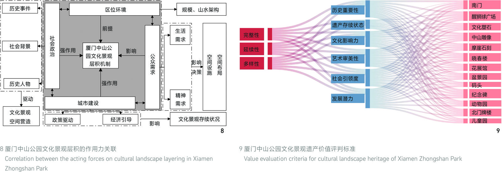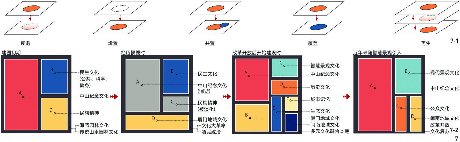 [Objective] Expanding the coverage of territorial spatial planning to the whole territory and all elements provides an opportunity for the protection and development of historical heritage. The evolution of the cultural landscape of urban historical parks, an urban cultural heritage and an important territorial space, is a medium for the transformation, continuation and reconstruction of the modern city. Under the value orientation of the heritage protection system, strengthening the spatial connection and temporal order among heritage resources can cope with the dilemma of spatial homogenization and fragmentation of the cultural landscape. [Methods] This research takes Xiamen Zhongshan Park (the “Park”) as an example for the interpretation and value assessment of the historical layering process. It constructs a cultural landscape heritage layering model of Xiamen Zhongshan Park by combining ancient literature and the spatial interpretation of ancient maps, and employing the historic urban landscape (HUL) method. By systematically analyzing the characters of the cultural landscape, the distribution patterns of the kernel density of cultural landscape, the layering pattern, and the dynamic superposition of cultural connotations in different periods, the research analyzes the dynamics of the layering evolution of the Park’s cultural landscape. Through expert scoring, the historical importance and cultural influence, artistic aesthetics, social leadership, development potential, and heritage survival status of the cultural landscape heritage of Xiamen Zhongshan Park are assessed, and the value attributes (mainly ontological and reuse values) of such cultural landscape heritage are interpreted by constructing an assessment system. [Results] This research shows that the layering evolution of cultural landscape in Xiamen Zhongshan Park went through five periods. The initial construction in the germination period formed a preliminary cultural landscape layering space of memorial, natural and landscape scenery sources, as well as special gardens, with cultural scenery sources distributed in a concentrated pattern across the northern, central, and southern areas of the Park. During the destruction period, the development of Xiamen Zhongshan Park stagnated due to the strong force of political power. During the recovery period, the purpose of park construction was to restore the original appearance and maintain the original functions on the basis of adding public facilities of commemorative significance, in an attempt to enhance the Park’s landscape and educational nature. During the recession period, with only some natural and landscape scenery sources remaining, showing a layering state of accumulation in the north and disappearance in the south. During the revival period, the memorial scenery sources, scenic buildings, and special gardens showed a uniform distribution of layering. The spatial functions of cultural landscapes are diversified, forming a multi-integrated cultural landscape layering state. By combing the characters of cultural landscape and the kernel density of cultural landscape distribution in different periods of the Park, the cultural landscape information of multiple periods is superimposed to generate a layering slicing map and a cultural connotation evolution map of the map. According to the results of the layering interpretation, five layering modes of recession, augmentation, juxtaposition, coverage, and regeneration of Xiamen Zhongshan Park are refined, and multiple layering modes are superimposed on each other in the continuous and dynamic evolution of the Park from the modern era to the present day. By retracing the evolution of the Park’s cultural landscape, the driving factors affecting the layering evolution of the Park’s cultural landscape are extracted. The location environment determines the Park’s landscape architecture, forming the initial state of the cultural landscape layering, the public’s demand influences the creation of space in the Park with the change of the times and thus affects the layering evolution, and the urban construction and social politics play a strong role in the layering of cultural landscape through relevant historical, economic, and political elements. In addition, the historical importance, cultural influence, artistic aesthetics, social leadership, and development potential of the Park’s scenic spots are significantly higher than their heritage survival status, which is related to the transformation of the elements in the cultural landscape layering model of Xiamen Zhongshan Park. In view of this, it is necessary to link the natural and cultural heritage resources in the Park, establish a systematic framework for interpreting the value of heritage, and revitalize the styles and features of historical landscapes. [Conclusion] This research examines Xiamen Zhongshan Park as a living cultural landscape heritage, and explores the processes, patterns, and mechanisms of cultural landscape heritage superposition across different periods from a dynamic evolutionary perspective. By taking a holistic view of the Park’s heritage value and evolution, this research aims to establish an assessment system for assessing the values and identifying its defining characteristics of the Park’s cultural landscape heritage. The findings seek to inform strategies for the scientific management, comprehensive protection, and sustainable development of urban historical parks. Xiamen Zhongshan Park is not only a historical cultural artifact but also a symbol of urban heritage and modern identity. Analyzing the mechanisms of cultural landscape characterization and value assessment from the perspective of temporal accumulation offers a comprehensive approach to preserving value continuity and supporting the organic renewal of this historic park, bridging territorial spatial planning with heritage preservation.