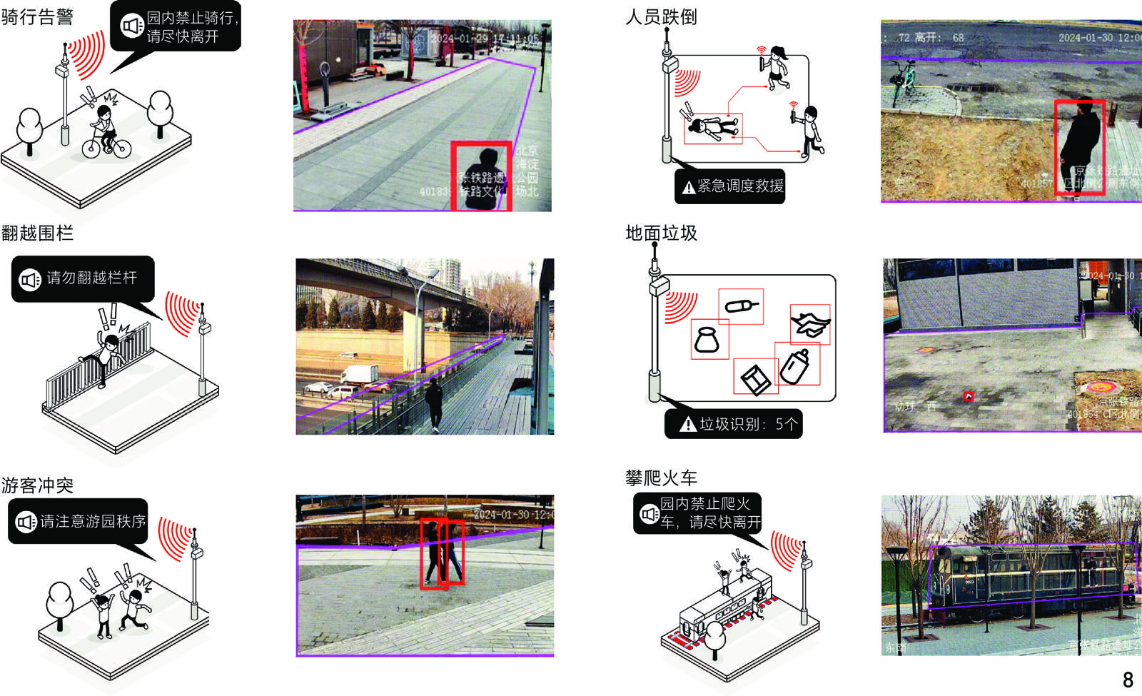 | 智慧管理 功能 | 安全 哨兵 | 保洁 哨兵 | 客流 哨兵 | 广播 哨兵 | 照明 哨兵 | 分期 功能 |