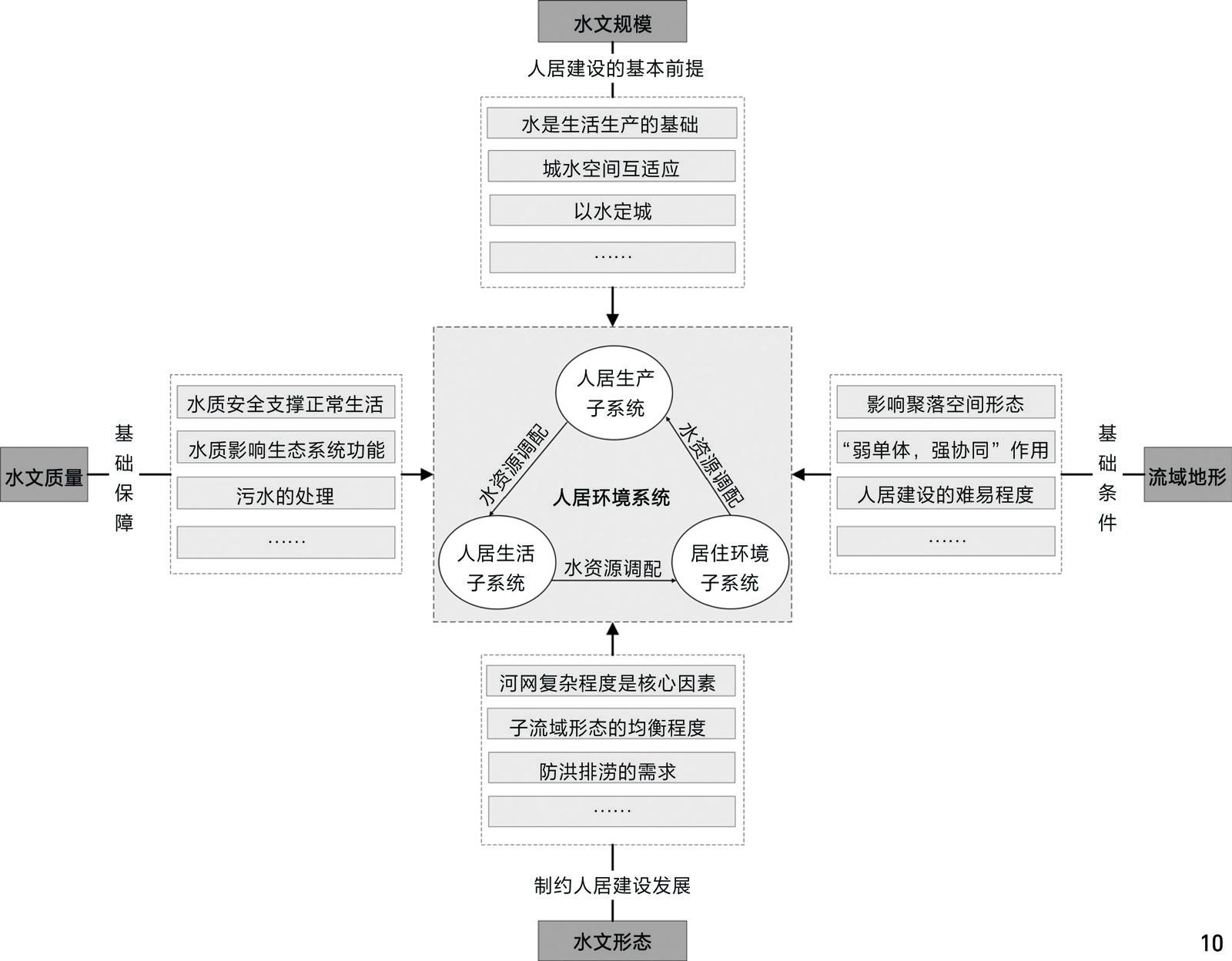 [Objective] The Kuye River Basin (the “Basin”) is one of the typical basins in the arid and semi-arid areas in the middle reaches of the Yellow River. Under the human settlement development mode driven by the energy industry, the water supply shortage, serious soil erosion, incoordination between urban space and water space, and water resources pollution in the Basin are becoming increasingly prominent. From living by water and grass of early human beings to today’s “Four Determinations Based on Water”, the complex relationship between people and water is an important clue for the formation and development of human civilization, and the harmonious relationship between people and water in river basins is an important basis for achieving sustainable development. Exploring the complex relationship between human settlement environment and hydrological environment in the Kuye River Basin from the perspective of human – water relationship is helpful to guide the harmonious symbiotic development of human settlement environment and hydrological environment in the Basin, and then promote the high-quality development of human settlement environment in the Basin. [Methods] The evaluation system for the quality of human settlement environments in sub-basins has been established, with the weight of each index factor determined using the entropy method. This approach aims to elucidate the spatial characteristics of human settlement environment quality within the sub-basins of the Kuye River Basin. Utilizing ArcSWAT 2012 software, hydrological simulations are conducted for the Kuye River Basin. Input data includes DEM (digital elevation model) data, soil type data, and meteorological information specific to the basin, enabling the simulation and acquisition of hydrological factors such as sub-basin boundary and river network grade. Geographical detector is a method employed to identify spatial differentiation and uncover its underlying driving forces. By selecting optimal parameters, geographical detector is utilized to examine influencing factors on the quality of human settlement environment in the Basin from various perspectives: scale, quality, and form of the hydrological environment. The primary factors influencing spatial differentiation in the quality of human settlement environment are analyzed based on results obtained from both single-factor detection and interactive detection methods. [Results] The spatial differentiation in the quality of human settlement environment in the Kuye River Basin is characterized by “local core agglomeration, and descending in all directions along the main river channel”, and the potential of optimizing the quality of human settlement environment in each sub-basin is very different. The shape and development degree of river network are the core factors influencing the human settlement environment in river basin. The quality of human settlement environment in river basin can be optimized by adjusting the density and length – width ratio of river network. The coupling relationship between scale, quality and source and sink of water resources is the main factor influencing the quality of human settlement environment in a basin. The systematic balance of scale, quality and source and sink of water resources should be considered in the development of human settlements in a basin to avoid the deterioration of water resources caused by excessive interference in a certain aspect. The roundness and length – width ratio of a basin are the secondary factors influencing the human settlement environment in the basin. The balanced and concentrated sub-basins are conducive to the formation of abundant water resources and efficient settlement spatial structure. Basin terrain is an important factor influencing the human settlement environment in a basin, and the impact mode on the quality of the human settlement environment in a basin is “weak monomer, strong synergy”. The terrain factors need to cooperate with river network form, water resource scale and other factors to play a role. [Conclusion] 1) There exists significant spatial differentiation in the quality of human settlement environment in the Kuye River Basin. 2) The quality of human settlement environment in the basin is the result of long-term coupling of multiple factors such as hydrological scale, hydrological form, hydrological quality and watershed topography. 3) There is a complex interaction between the human settlement environment and the hydrological environment in the basin. The quality of human settlement environment in the basin should be improved and optimized based on the harmonious relationship between human and water, and the relationship between human and water in the basin should be optimized from multiple aspects, such as the optimization of water resource supply and demand, the regional planning of water resources, the coordinated balance of water resources within the human settlement environment and the coupling of human and water space, so as to promote the high-quality development of the human settlement environment in the Basin. With sub-basin as the basic unit, the optimization strategy of human settlement environment is determined according to local conditions.