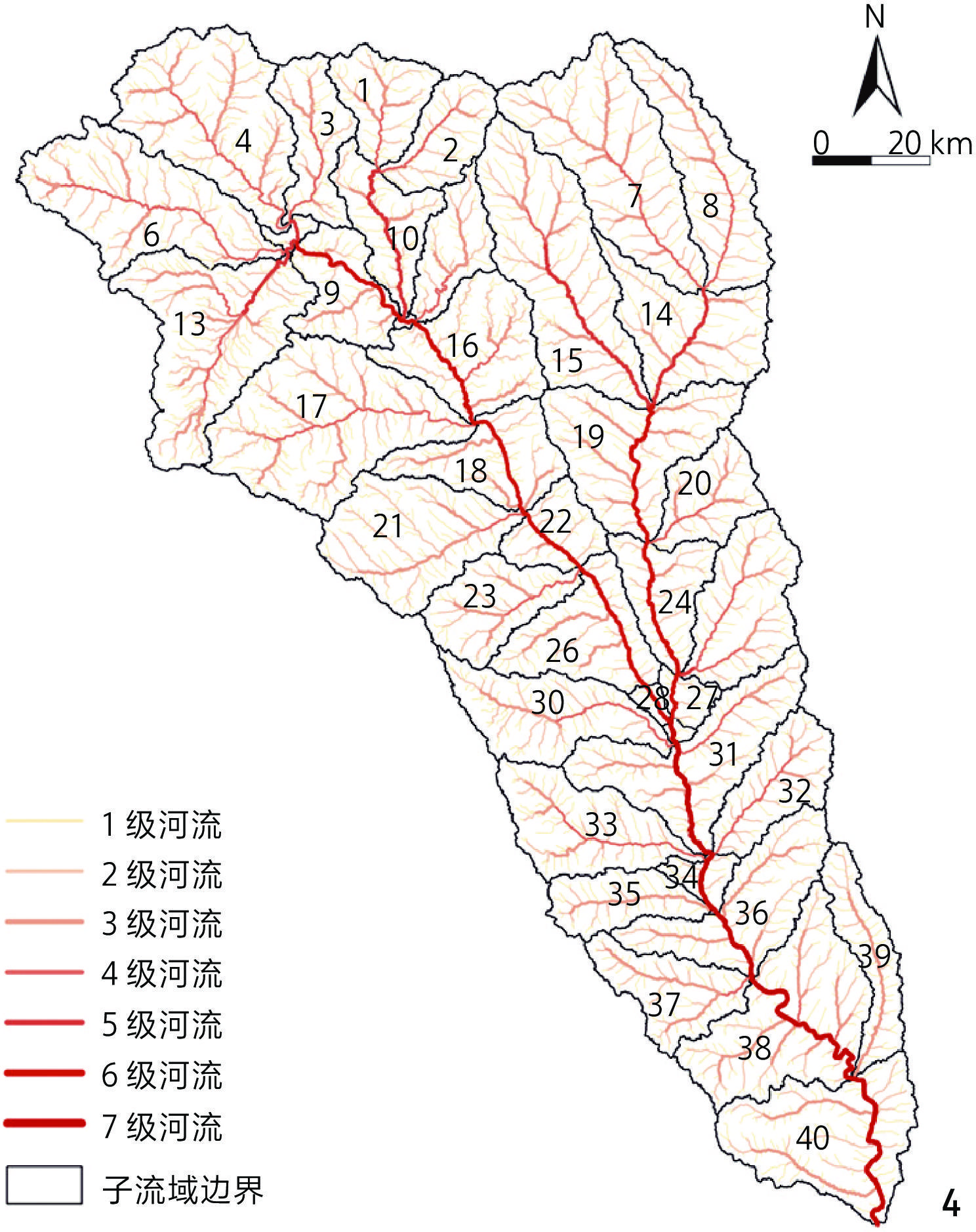 | 分枝比(X12) | 分枝比为某等级河流数目与更高一级河流数目的比值,流域内一般有多个不同等级的河流,单个河流的分枝比不能反映整个流域的河流分支程度。该领域学者一般以${\text{ω}} $与${\rm{lg}}N_{\text{ω}} $线性拟合(横坐标为${\text{ω}} $,纵坐标为${\rm{lg}}N_{\text{ω}} $)所得到回归直线斜率绝对值的反对数表示分枝比($ {R}_{\mathrm{b}} $),其中${\text{ω}} $为河流级别序号,$N_{\text{ω}} $为第${\text{ω}} $级河流的数目 | ||