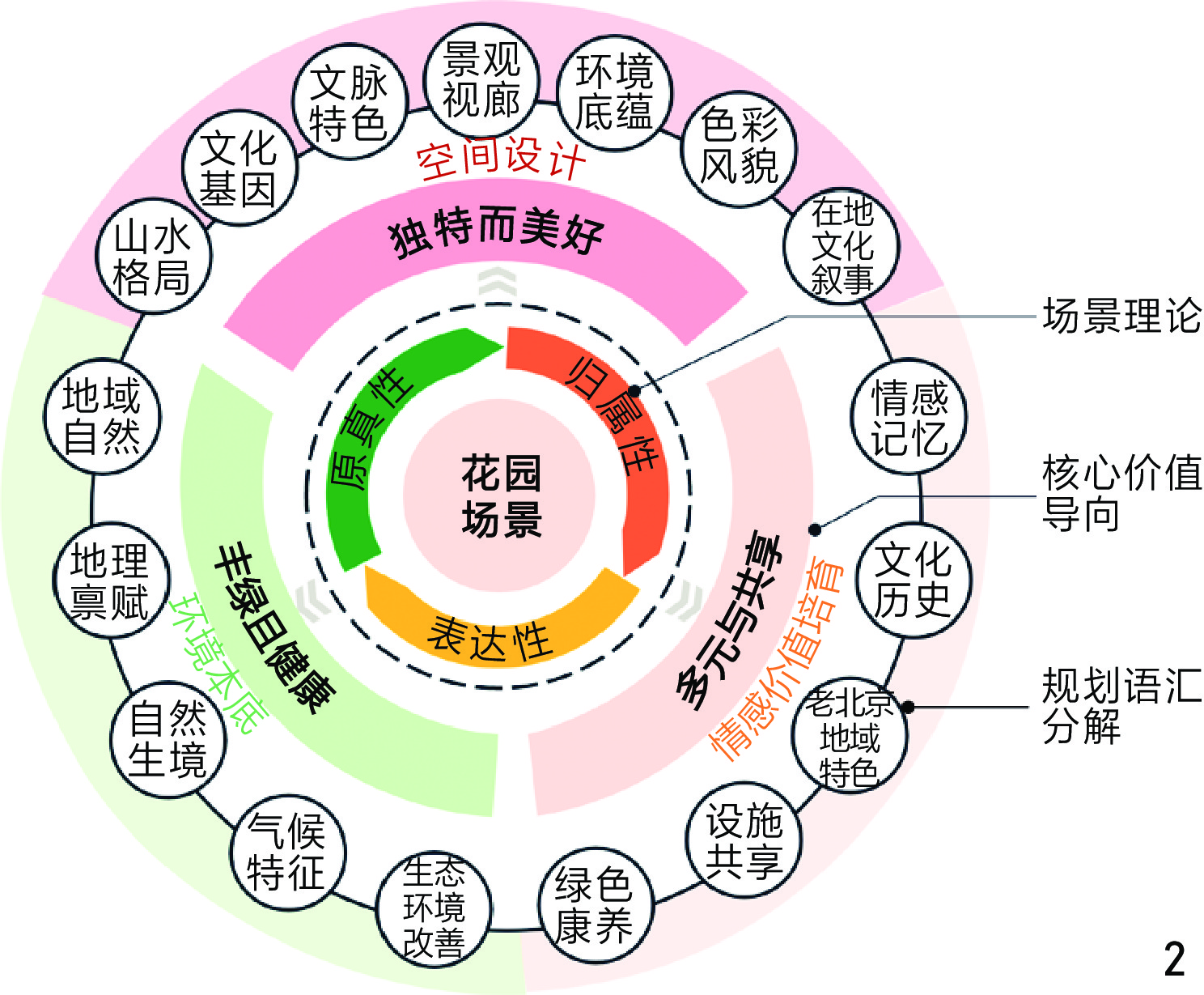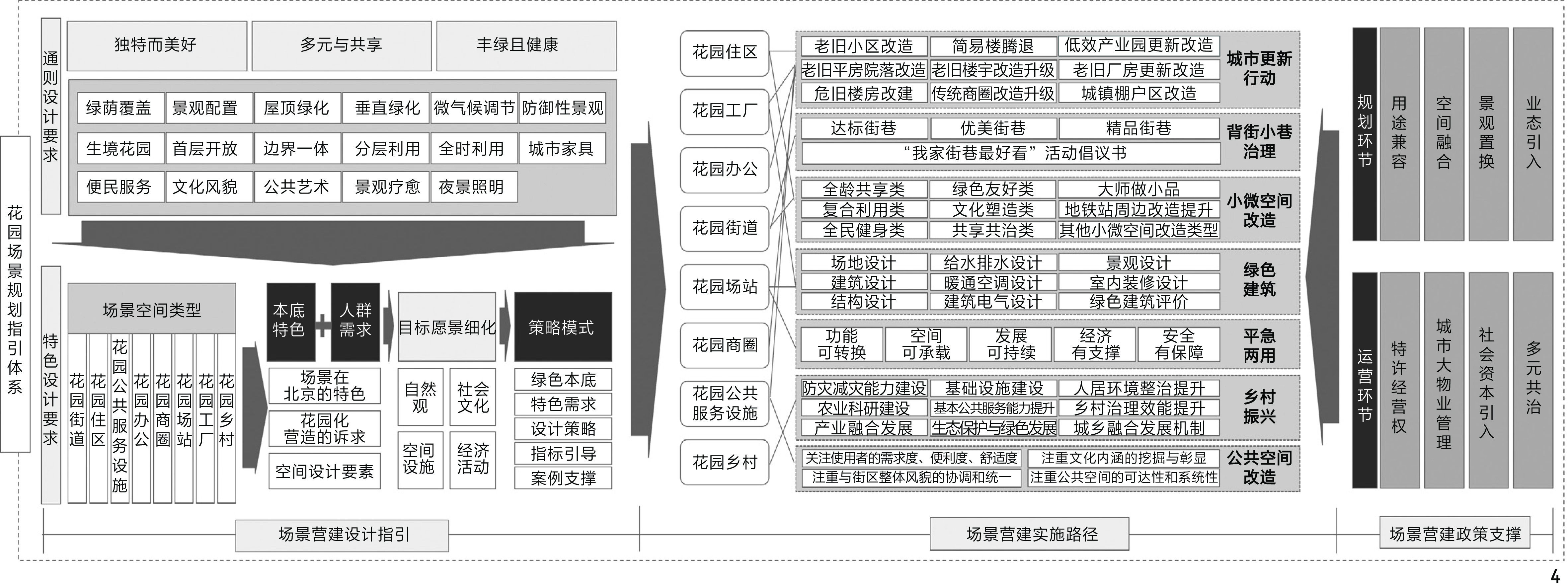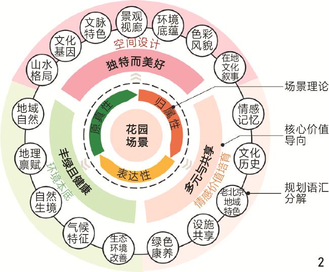 [Objective] This research aims to explore the systematic application pathway of the theory of scenes in the construction of Beijing Garden City. Addressing current deficiencies in Beijing’s green space development, such as insufficient integration of greenery perception and function, lack of distinctive character, low ecological efficiency of urban spaces, and inadequate scene operation capabilities, the research constructs a human-oriented garden scene construction framework for Beijing, grounded in the theory of scenes and oriented towards planning practice. The core objectives are to facilitate the transformation of Beijing’s urban spaces from a singular “garden landscape” model, primarily focusing on parks and green spaces, towards a comprehensive “garden scene” model that covers the entire urban area and integrates diverse functions. This transformation seeks to enhance citizens’ sense of well-being and belonging, ultimately achieving the high-quality development goal of harmonious coexistence between humans and nature.