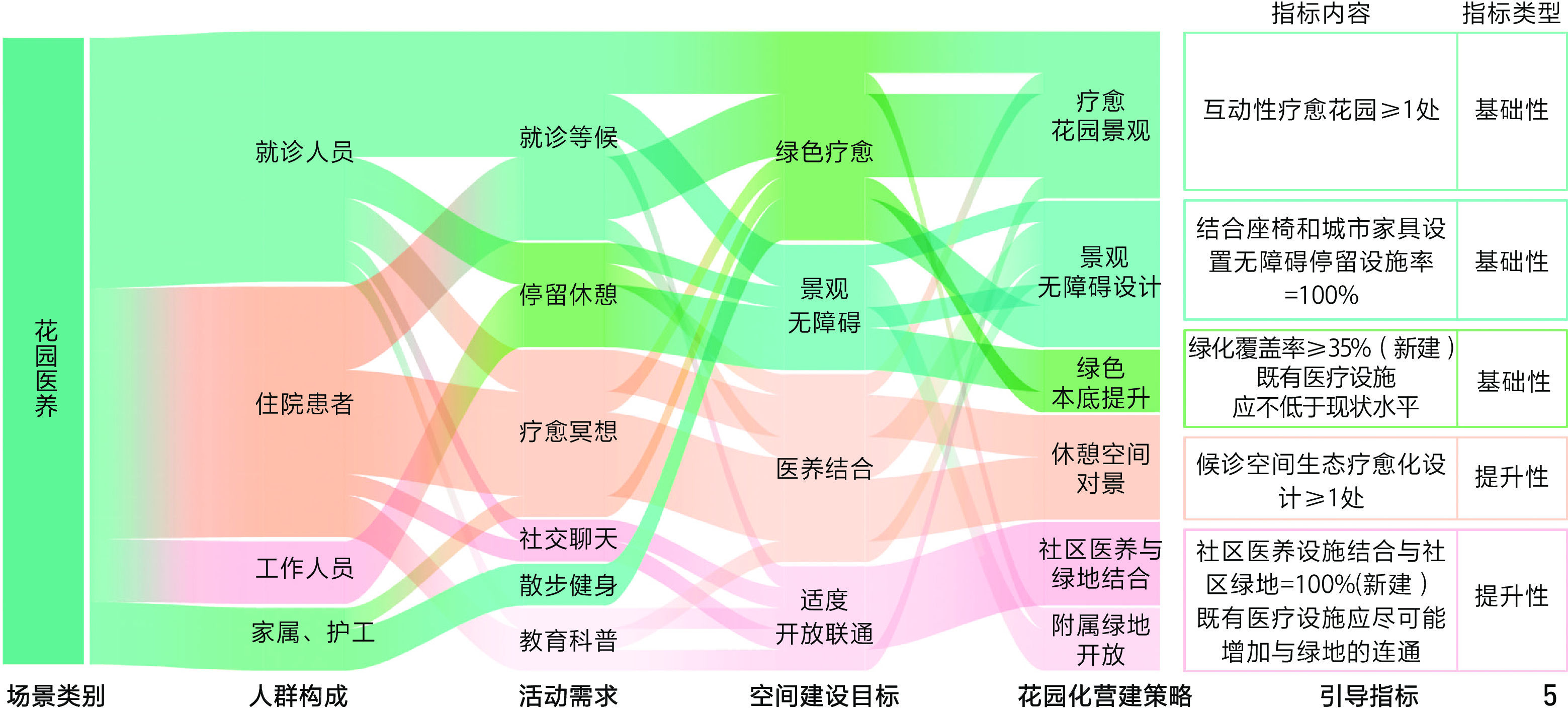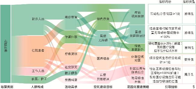 | 景观疗愈 | 自然疗愈生境:营造康复花园等,促进医院就诊空间与疗愈生境的紧密结合; 文旅康养体验:依托自然资源,开发森林养生、滨水休闲、温泉疗愈等文旅活动; 无障碍景观步道:绿植引导缓坡,沿步道设置无障碍坡道、扶手及座椅 | |