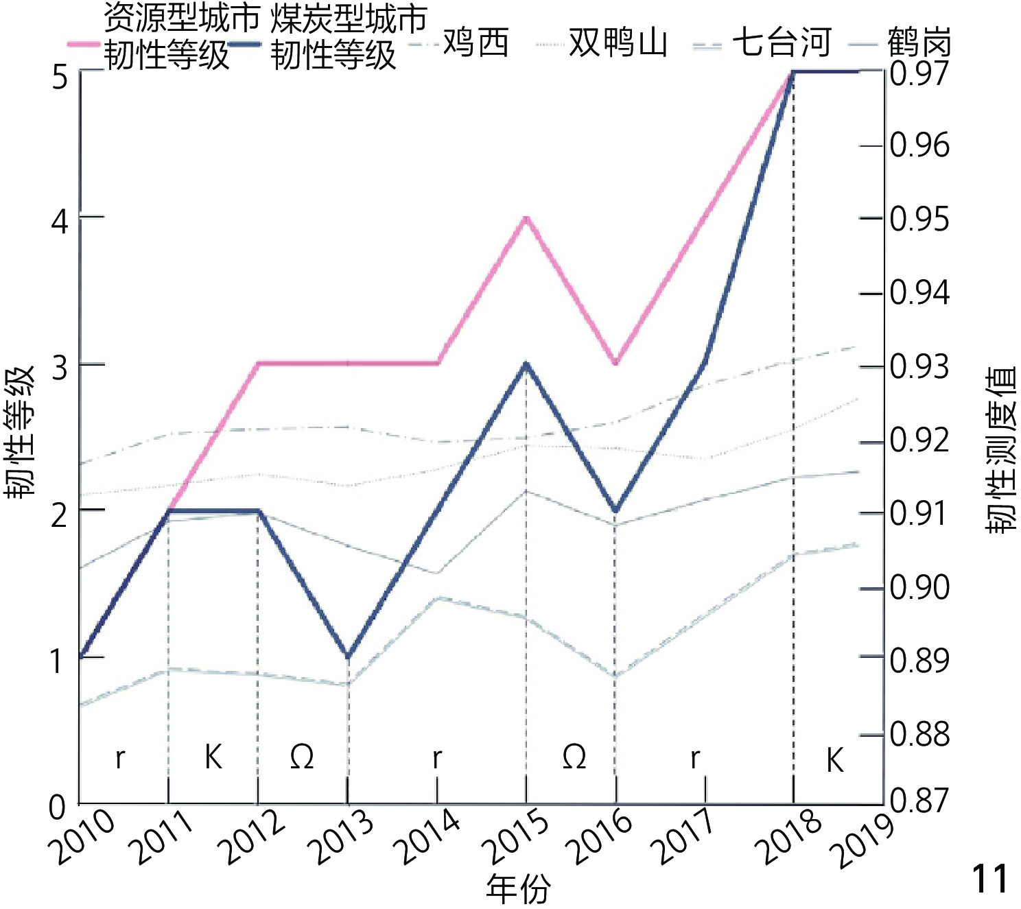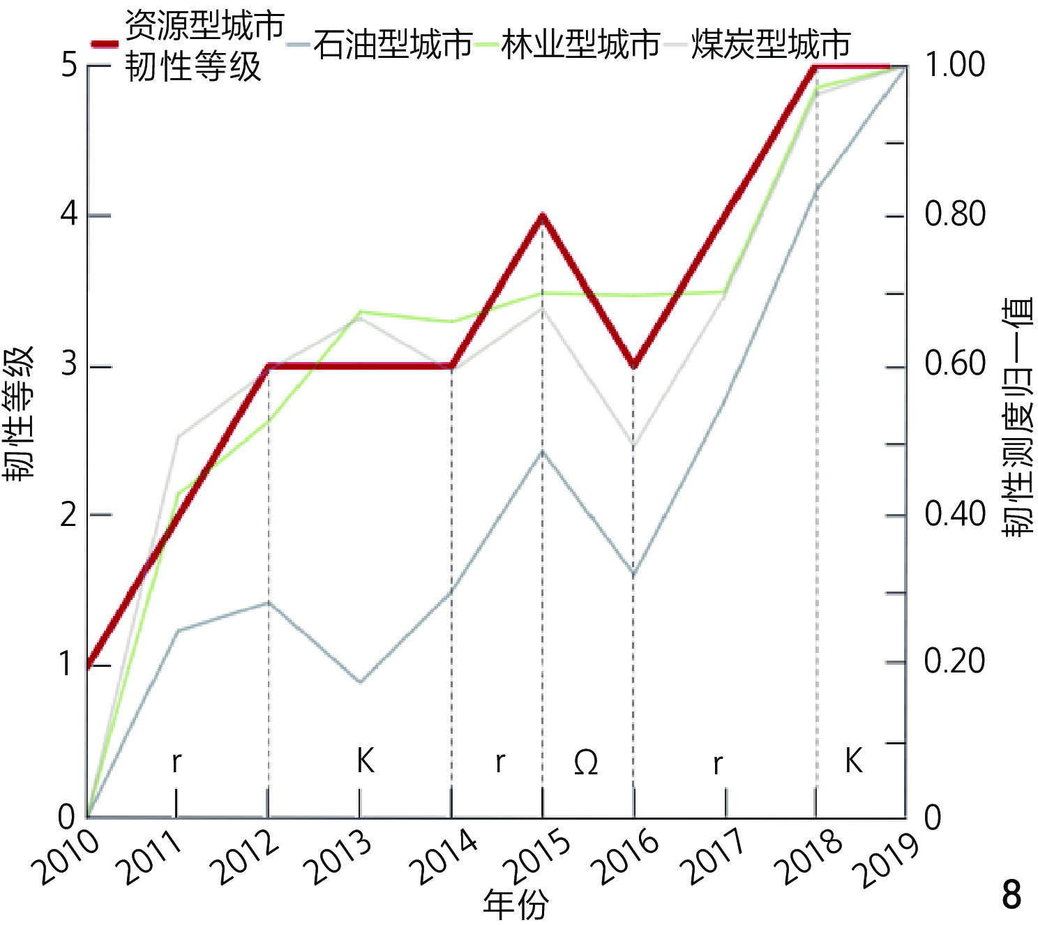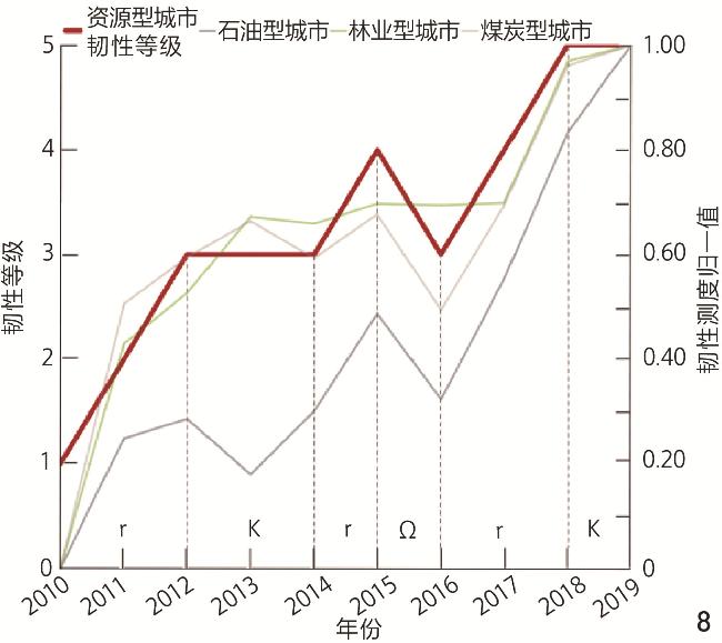 [Results] The findings reveal distinct hierarchical differentiation among various types of resource-based cities in Heilongjiang Province. 1) In terms of resilience measurement outcomes, overall resilience shows an upward trend with a temporary decline in 2016, attributed to external economic shocks. The spatial distribution of resilience exhibits a stepwise increase from north to south, reflecting geographic disparities in industrial structure and policy implementation. 2) In terms of resilience evolution characteristics, petroleum-based cities shows stepwise growth with fluctuations, influenced by global petroleum price volatility and domestic policy adjustments. Forestry-based cities show steady stepwise growth, driven by sustainable forestry practices and ecological compensation policies. Coal-based cities show significant volatility alongside upward trends, linked to cyclical coal market dynamics and green transition pressures. All cities have skipped the reorganization phase (α), transitioning directly from release phase (Ω) to exploitation phase (r), resulting in fragmented cycles dominated by national Five-Year Plans and policy interventions.