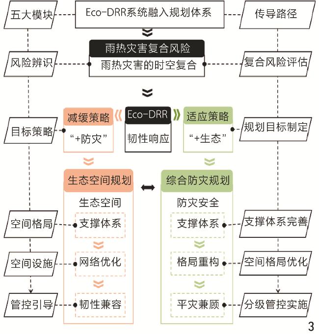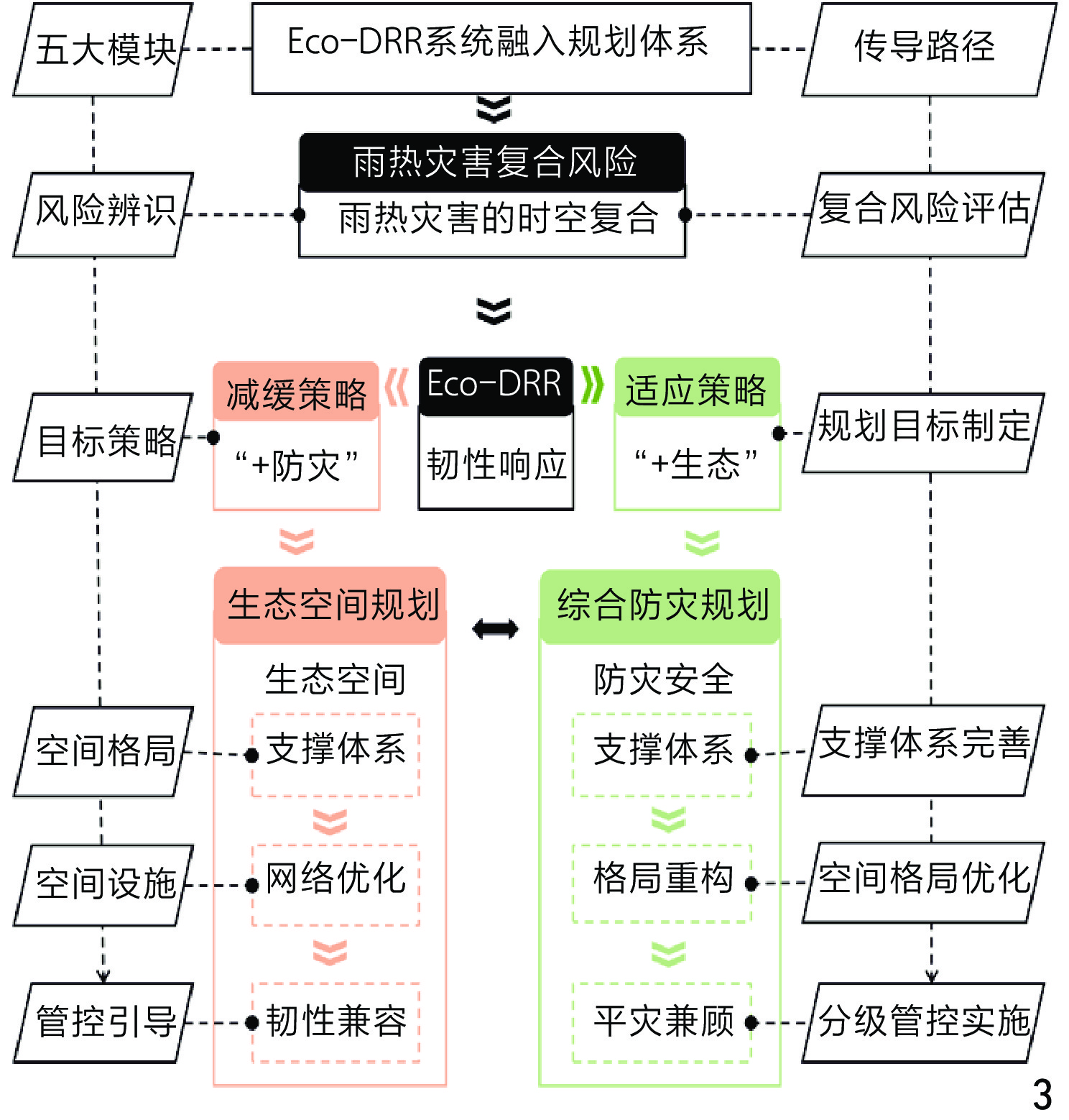 | 雨热复合型 | 雨热风险协同缓解 | 融入海绵与降温功能兼容的Eco-DRR空间指标 | 以存量盘活和功能复合为主,形成集约型空间格局 | 实施生态修复,常态功能向灾时防御功能转换 |