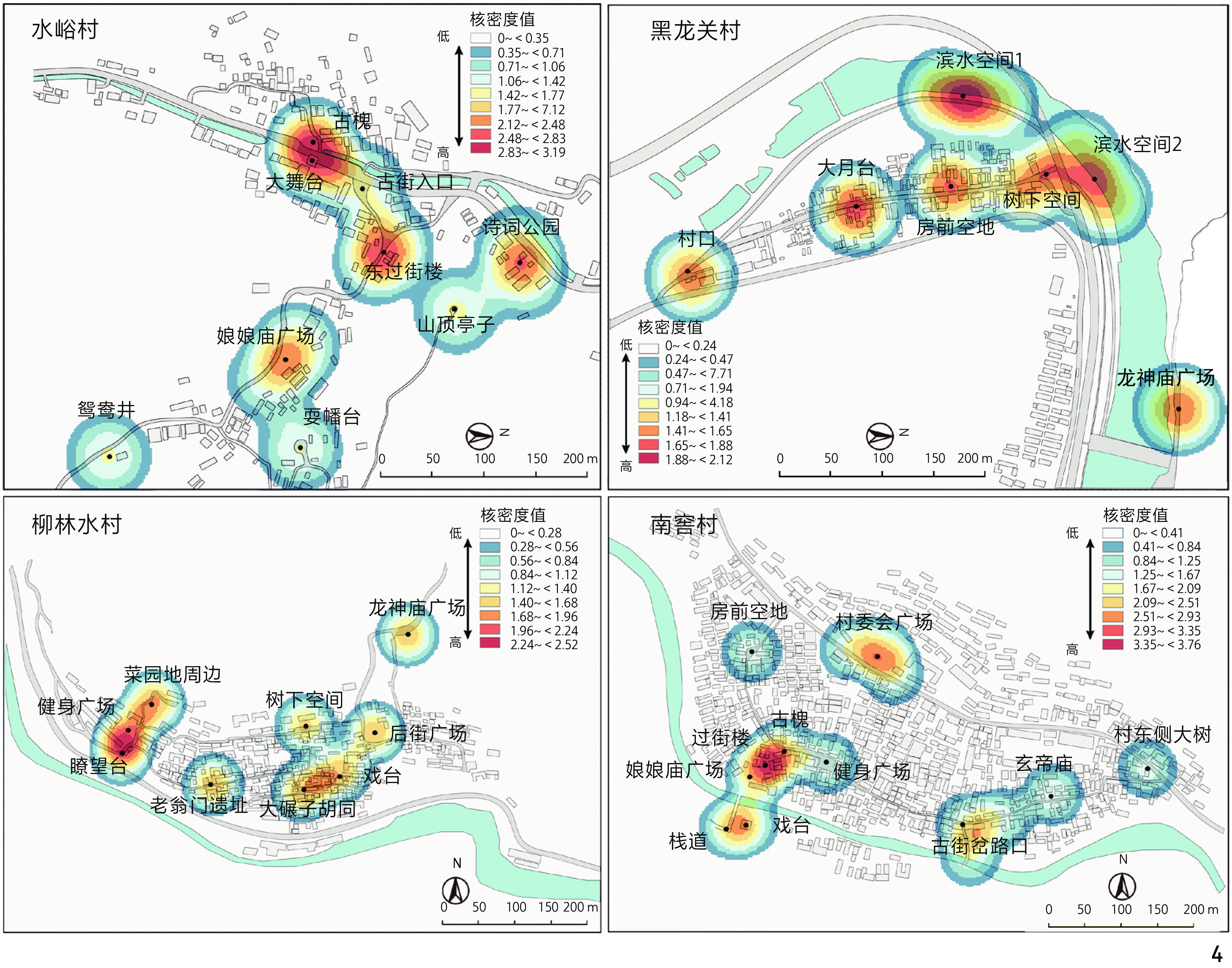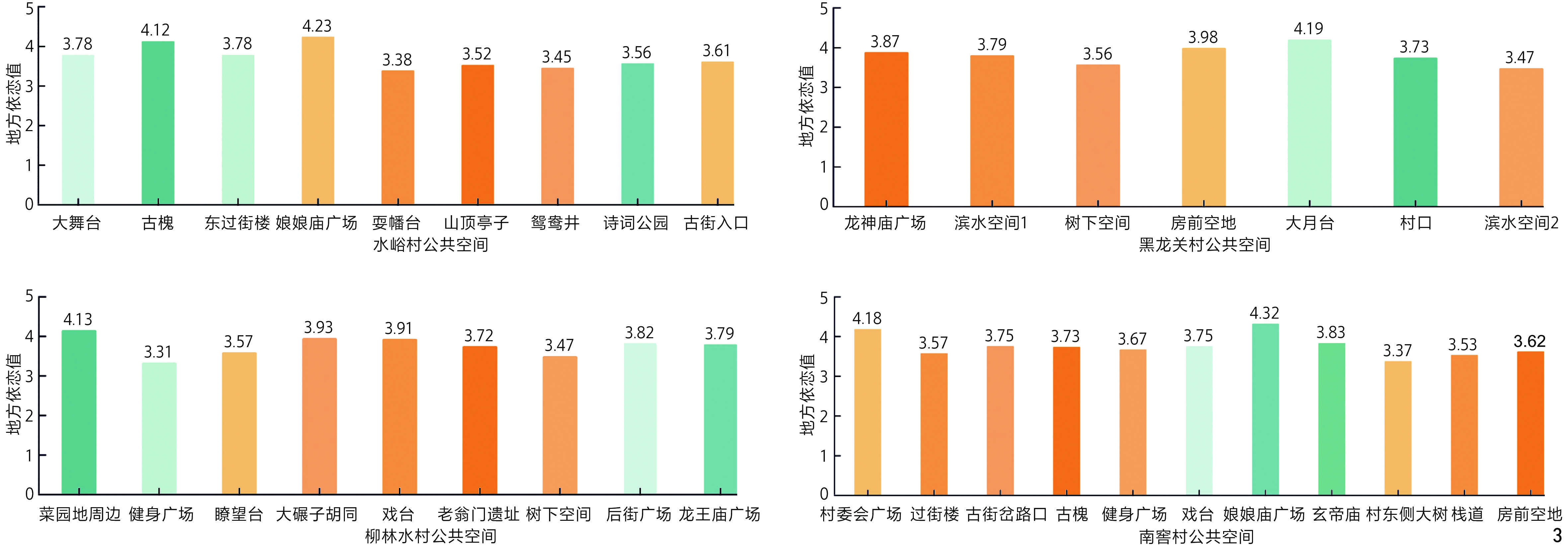 [Results] The results indicate that the top three sites with the highest average place attachment scores in Nanjiao Village are the Goddess Temple Square (4.32), the Village Committee Square (4.18), and the Xuandi Temple (3.83). In Heilongguan Village, the highest scores are recorded for the Dayue Platform (4.19), the Open Space in Front of Houses (3.98), and the Dragon God Temple Square (3.87). In Shuiyu Village, the top sites include the Goddess Temple Square (4.23), the Ancient Sophora Tree (4.12), the Grand Stage (3.78), and the East Street Gate Tower (3.78). Finally, in Liulinshui Village, the highest scores are associated with the Area Around the Vegetable Plots (4.13), the Big Millstone Alley (3.93), and the Opera Stage (3.91). In terms of the spatial distribution characteristics of the strength of local attachment, the local attachment of the left-behind elderly shows the “multi-center” distribution characteristics of strong intermittency and high local concentration, and the high value areas of local attachment are mainly concentrated in the spiritual and cultural spaces with rich connotation and daily life spaces that are convenient and easy to reach. Regarding the influence mechanism of rural public space characteristics on the place attachment of the left-behind elderly, on the whole, the cultural and spatial characteristics of rural public space constitute the core dimensions of place dependence and place identity, followed by the influence of artificial characteristics, while the influence of natural characteristics on the place attachment of the left-behind elderly is relatively limited, and only the greening coverage positively contributes to the place dependence by enhancing the ecological comfort of public space, but has no direct influence on the place identity. In terms of specific characteristic indicators, a total of 10 public space characteristic factors significantly affect the place dependence of the left-behind elderly, among which accessibility, activity participation, vegetation coverage and building density are the key factors positively affecting the place dependence of the left-behind elderly, while the negative interference index and the degree of spatial enclosure are the key factors negatively affecting the place dependence of the left-behind elderly. There are eight influencing factors of place identity, among which the degree of neighborhood affinity, the degree of preservation of historical relics, the degree of participation in activities and building density have a greater positive influence on place identity, and the degree of colorfulness has a significant negative influence on place identity.
