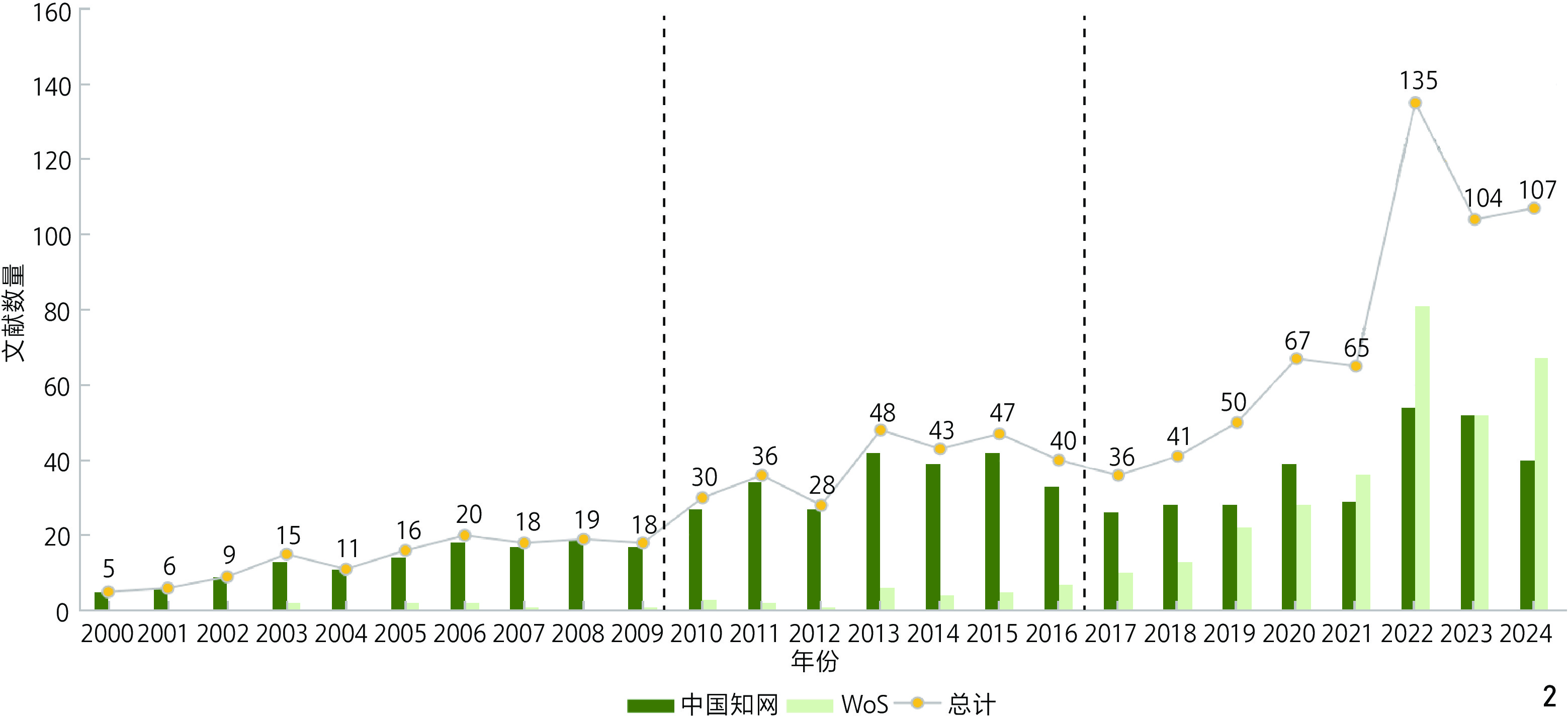 [Methods] The China National Knowledge Infrastructure (CNKI) and Web of Science Core Collection are taken as data sources, journal article is determined as literature type, and the retrieval time is set from January 1st 2000 to December 31th 2024 based on the characteristics of the publication period. The advanced search formula for the subject terms of Chinese AND English literature is TS=(“recreation*” OR “leisure” OR “tour*” OR “entertain*”) AND (“green space*” OR “park*”) AND (“layout” OR “planning” OR “design*”). After eliminating the items irrelevant to the research topic, 687 Chinese and 345 English literature articles are ultimately selected as the research object. CiteSpace 6.2.R6 is utilized to conduct visual analysis of the selected articles, supplemented by traditional literature review methods and inductive comparative analysis. This approach systematically examines the evolutionary stages, research hotspots, and trend characteristics of URGS layout research, aiming to advance a forward-looking layout framework.