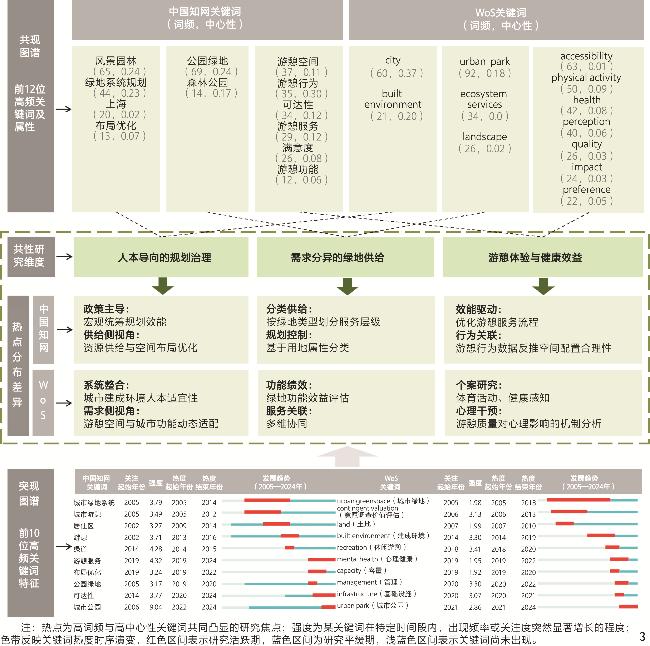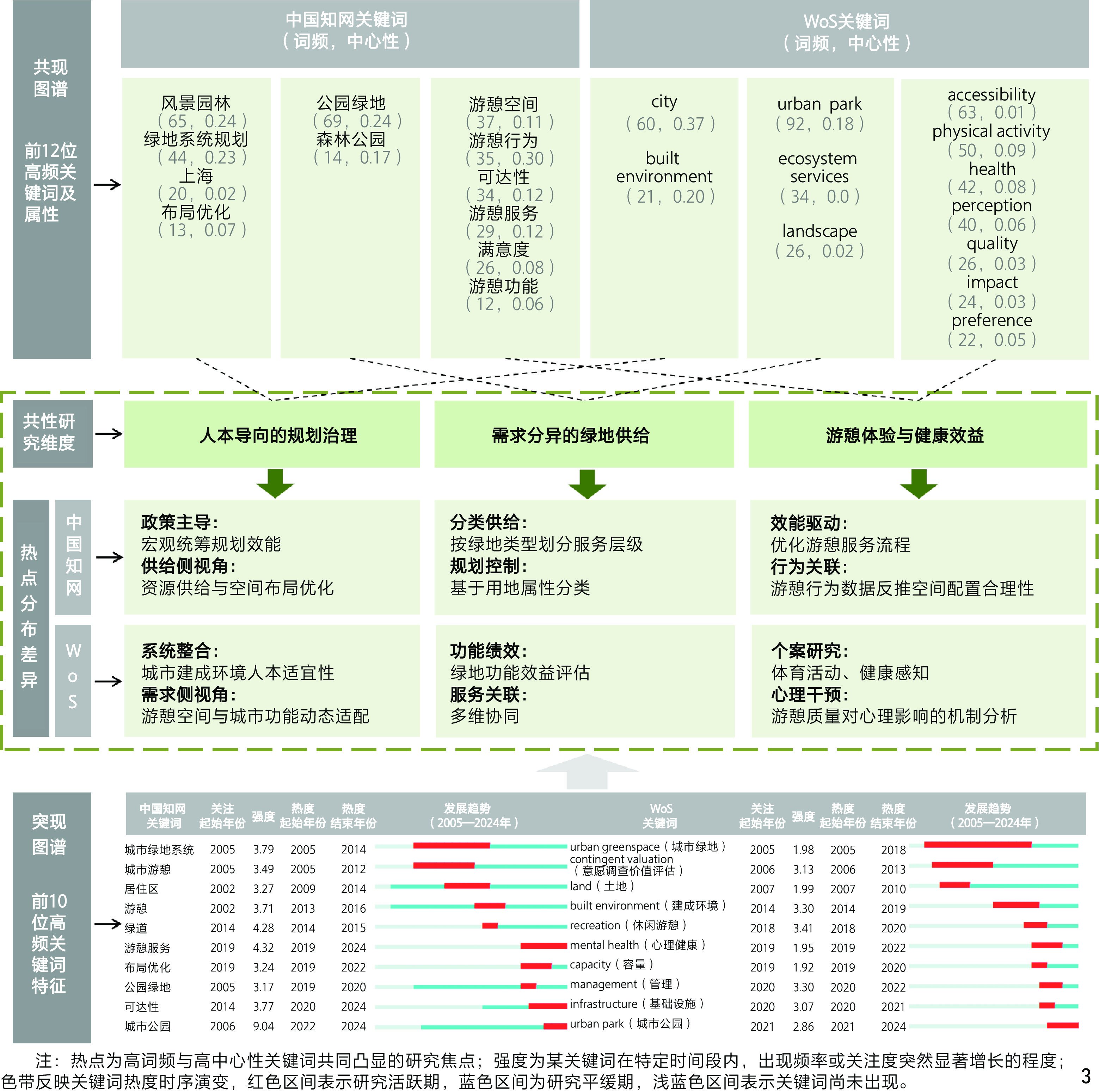 [Results] 1) Evolutionary stages: Research on URGS layout in China has progressed from planning control to spatial governance. From 2000 to 2009, it was the period of rough demand identification – initial exploration, with more attention paid to the configuration of recreational functions and scale estimation around the supply side. From 2010 to 2016, it was the period of coarse demand response – fluctuating growth, promoting the transformation of China’s URGS layout towards “social equity – demand response”. From 2017 to 2024, it was the period of refined and rapid development in demand, catering to diverse recreational demands. 2) Research hotspots: Common dimensions encompass human-oriented planning and governance, demand-differentiated green space provision, and recreational experience – health co-benefits. However, Chinese literature research prioritizes macro-level planning and supply-side refinement, while English literature emphasizes meso & micro-scale empirical studies and demand-side drivers. 3) Development trends: While both Chinese and English research converge on green space layout based on socio-spatial and spatiotemporal behavioral differentiation for demand identification, their divergences persist in primary research focus, depth of interdisciplinary integration, and intensity of policy-coupling. 4) Theoretical system: A “theoretical system framework for URGS layout that responds to human-oriented demands” has been constructed, covering a multi-dimensional hierarchical classification system based on the “time – space – demand” principle; based on the principle of “differential justice”, the traditional classification of green spaces has been broken and a “recreational circle” layout system adapting to urban functional spaces has been constructed; an evaluation-optimization system employing digital intelligence technologies for supply-demand matching has been constructed to advance optimally regulated connotative development.