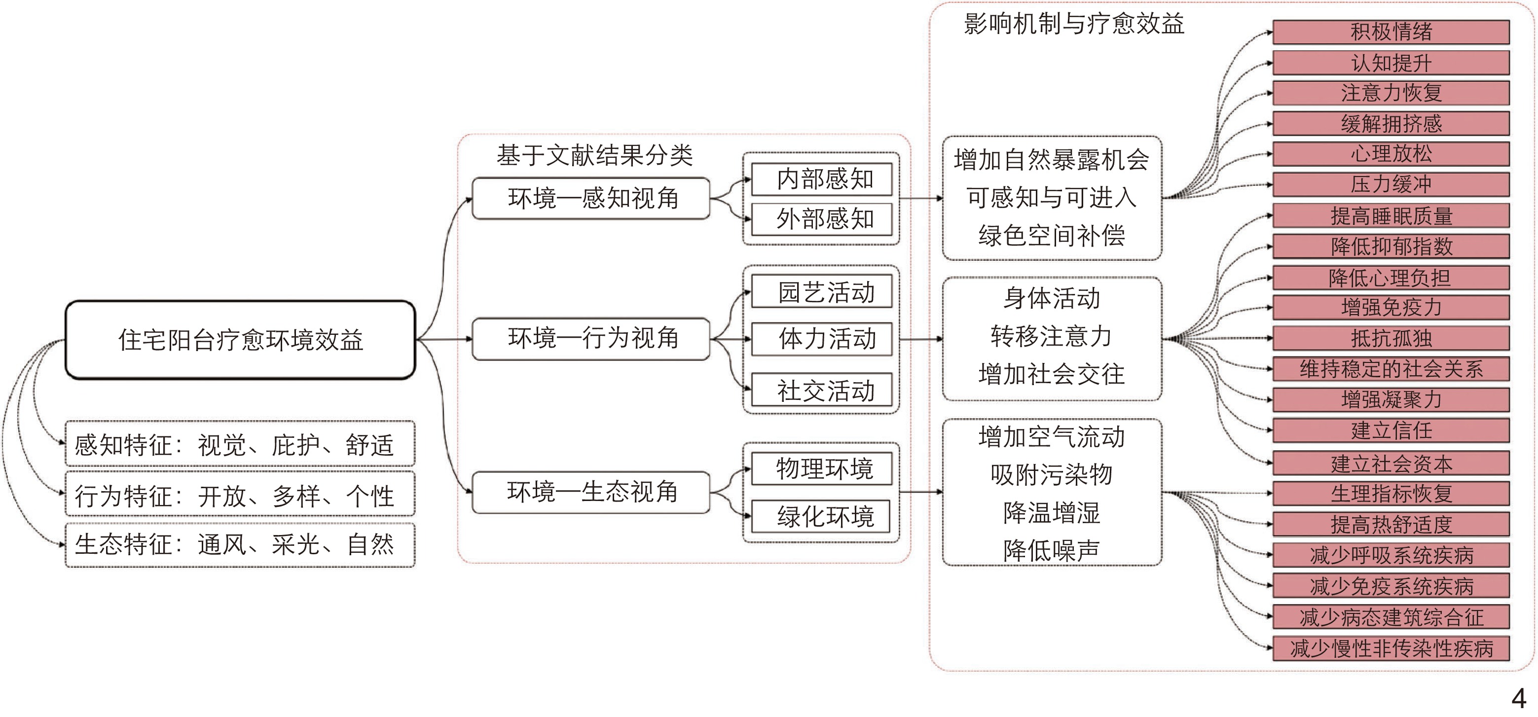 [Objective] Residential balcony, as an important healing space in family life, is gradually becoming a new topic of research in the field of habitat environment. Residential balcony plays an important role in improving environmental quality, promoting physical and mental health, and achieving physical and mental recovery. Clarifying the progress and development trend of the research on balcony environment and forming a systematic understanding of the healing benefits of balcony environment are of great theoretical and practical significance to enhance the quality of living environment, promote health and well-being, and accelerate physical and mental recovery. [Methods] From the perspective of the research on healing benefits of balcony environment, this research screens a total of 211 English literature and 35 Chinese literature from the Web of Science core collection database and the China Knowledge Network (CNKI) database as data sources for research analysis. The research is based on a review of relevant research hotspots, contents and methods at home and abroad, and a review of the current status, trends, limitations and shortcomings of current research. [Results] The researches on healing benefits of balcony environment can be divided into three areas. From the “environment − perception” perspective, the research explores the healing effects of balcony environment perception in promoting positive emotions, enhancing cognitive abilities, restoring attention, and relieving stress. From the “environment − activity” perspective, the research explores the physical and mental healing effects of gardening and the physical and social activities sustained by balcony in strengthening immunity, reducing psychological burden, maintaining stable social relationships, and building social capital. From the “environment − ecology” perspective, the research explores the healing effects of the combination of the physical environment and greening of balcony, finding that the physical environment of balcony can help strengthen natural ventilation and thermal comfort, while balcony greening can help adsorb harmful substances and maintain carbon and oxygen balance, thus improving the quality of living environment, and promoting physiological indicators of recovery and other functional health aspects. The research on healing benefits of balcony environment has realized the transition from unitary physical environment to perceptual experience and then to multiple integration and unification of physical participation, mainly seeking the in-depth analysis of the relationship between environment and physical and mental health. In recent years, the focus of research has also shifted from the health promotion role of physical environment to the physical and mental healing benefits of balcony environment. Accordingly, research perspective has also undergone a shift from subjective perception to humanistic perspective of physical and mental engagement. The promotion and development of emerging technologies are driving a transformation in research methods toward technical precision, which is expected to provide more precise methods and possibilities for evidence-based research on the healing benefits of balcony environment. Based on the analysis of current research status and practical needs, future research on healing benefits of balcony environment should focus on the following aspects: 1) Pay attention to the healing benefits and causality of the interaction between people and balcony environment. Combining with new human factor technology, high-quality physiological and psychological data can be obtained to identify and describe the behavioral reactions and physical and mental conditions of different people interacting with the balcony environment, and objectively demonstrate the causal relationship of balcony healing benefits. 2) Pay attention to the healing elements and influencing mechanism of balcony environment. The main contents include defining the influencing factors, weights and action mechanisms that affect the healing benefits, obtaining the key influencing factors, and realizing the fine measurement of the influence weights of spatial factors. 3) Pay attention to the configuration and comprehensive utilization of balcony space. It mainly includes understanding residents’ utilization status, utilization frequency and space demand of balcony. The space allocation required by ideal healing balcony environment should be further discussed in combination with the conclusion of empirical research, so as to improve the living quality, boost the diversified and comprehensive utilization of balcony and promote the health and well-being of residents. [Conclusion] As a potential health resource in high-density urban living environment, residential balcony is an important part of evaluating urban living quality and realizing healthy life. However, the main problem faced by the current research on the healing benefits of balcony environment is the lack of research combing and discrimination, and the failure to form a systematic and valuable research conclusion. At present, it is difficult to effectively guide balcony design in practice and give full play to the healing value of balcony. Therefore, it is necessary to clarify the current progress and development trend of balcony healing research, analyze the existing problems and shortcomings in the current research, and determine future research direction. The theoretical significance of this research is to promote the deepening and refinement of the research on the healing benefits of residential balcony environment, and to expand and enrich the theoretical framework for the research on healing built environment. The practical significance lies in summarizing the existing research conclusions, promoting the practical transformation of theoretical achievements, and providing guidance for the optimization and design of balcony space.