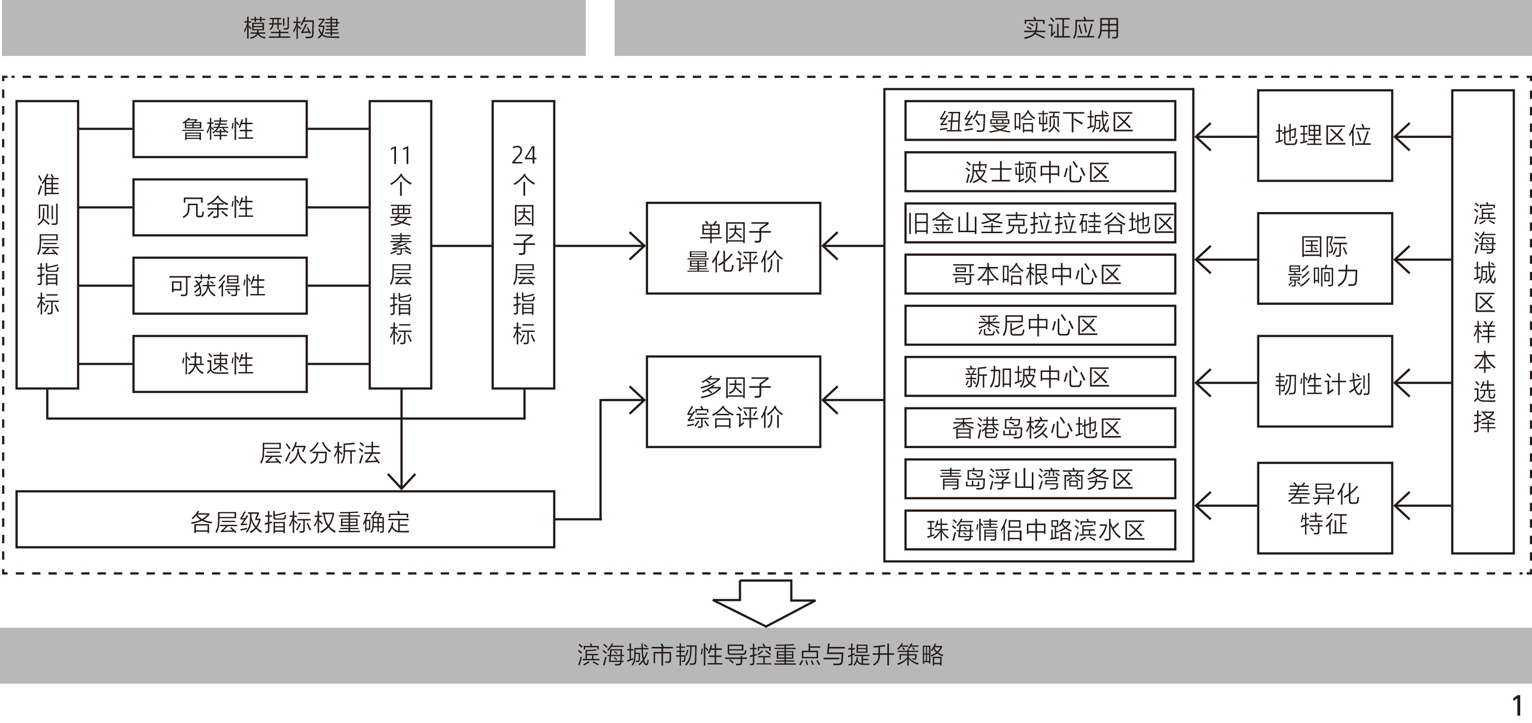 The research uses literature research, empirical research, quantitative analysis and other methods. Based on literature induction and extraction and integration of 4R resilience characteristics, a comprehensive evaluation model with 24 indicators fallen into the four categories of robustness, redundancy, resourcefulness and rapidity is constructed. According to the four principles of typicality, international influence, resilience construction experience and multi-scenario difference, 9 typical coastal city samples at home and abroad are selected in a targeted and differentiated way for a global empirical research. They are the Lower Manhattan of New York City, the central area of Boston, the Silicon Valley area of Santa Clara, the central area of Copenhagen, the central area of Sydney, the central area of Singapore, the core area of Hong Kong Island, the Fushan Bay Business District of Qingdao, and the waterfront area of Zhuhai. Then, this research analyzes how each sample above improves its 4R resilience level through urban spatial form and functional layout.