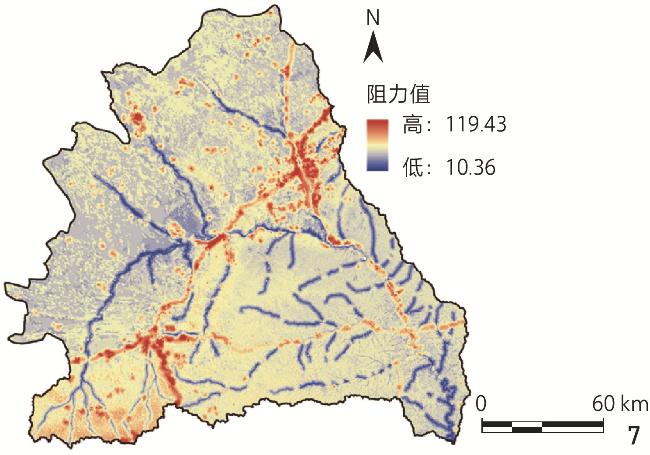 | 生态阻力 | 土地利用类型(0.19) | 城镇建设用地/农村居民点/其他建设用地 | 沙地/盐碱地/裸岩石质地 | 低覆盖度草地/旱地/裸土地 | 灌木林/疏林地/中覆盖度草地/沼泽地/水田/滩地 | 林地/有林地/疏林地/其他林地/高覆盖度草地/天然牧草地/河渠/湖泊/水库坑塘 |