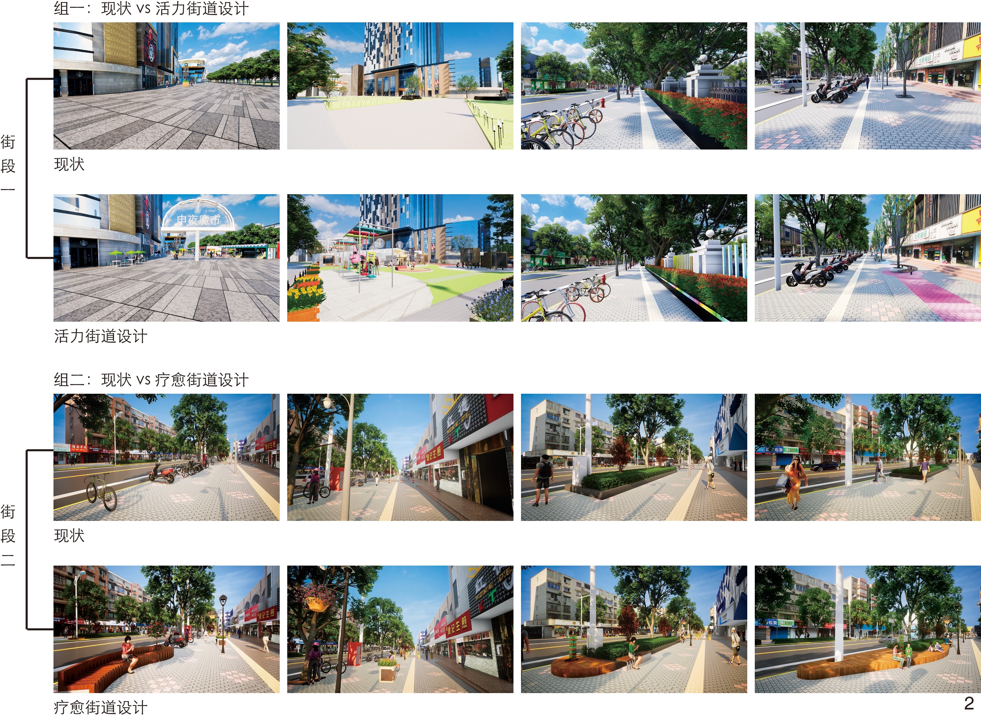 [Methods] The 408 Research Group of Tongji University, in collaboration with the government of Miaohang Town, Baoshan District, Shanghai City, organized a participatory workshop to conduct street micro-renewal designs with the goal of enhancing affective atmospheres. The workshop undertakes the design of two segments of Gongkang Road in Miaohang Town, and sets the design concepts for each segment as “vitality” and “healing” based on the current issues of the segments and the teaching objectives of promoting research-oriented design. To achieve the intended design outcomes, the workshop first conducts thorough data collection, including site information gathering and resident interviews. The collected data is then analyzed to extract key information and identify design issues. Based on the research and analysis results, design proposals are proposed and developed. Finally, the conceptual design is presented in VR to prepare for the evaluation of the design outcomes. During the evaluation phase, stakeholders, mainly residents and community staff, are invited to experience the street environment before and after the design in VR. Using both self-reported emotional questionnaire and physiological indicators such as SCL (skin conductance level) of EDA (electrodermal activity), mHR (mean heart rate), RMSSD (the root mean square of successive differences between normal heartbeats) and HFnorm/LFnorm (ratio of LFnorm to HFnorm) of HRV as measures of emotion, laboratory experiments are conducted to test whether the healing and vitality street designs presented by VR have different effects on participants’ emotions, and to assess whether the designed environment has achieved the desired affective atmosphere.