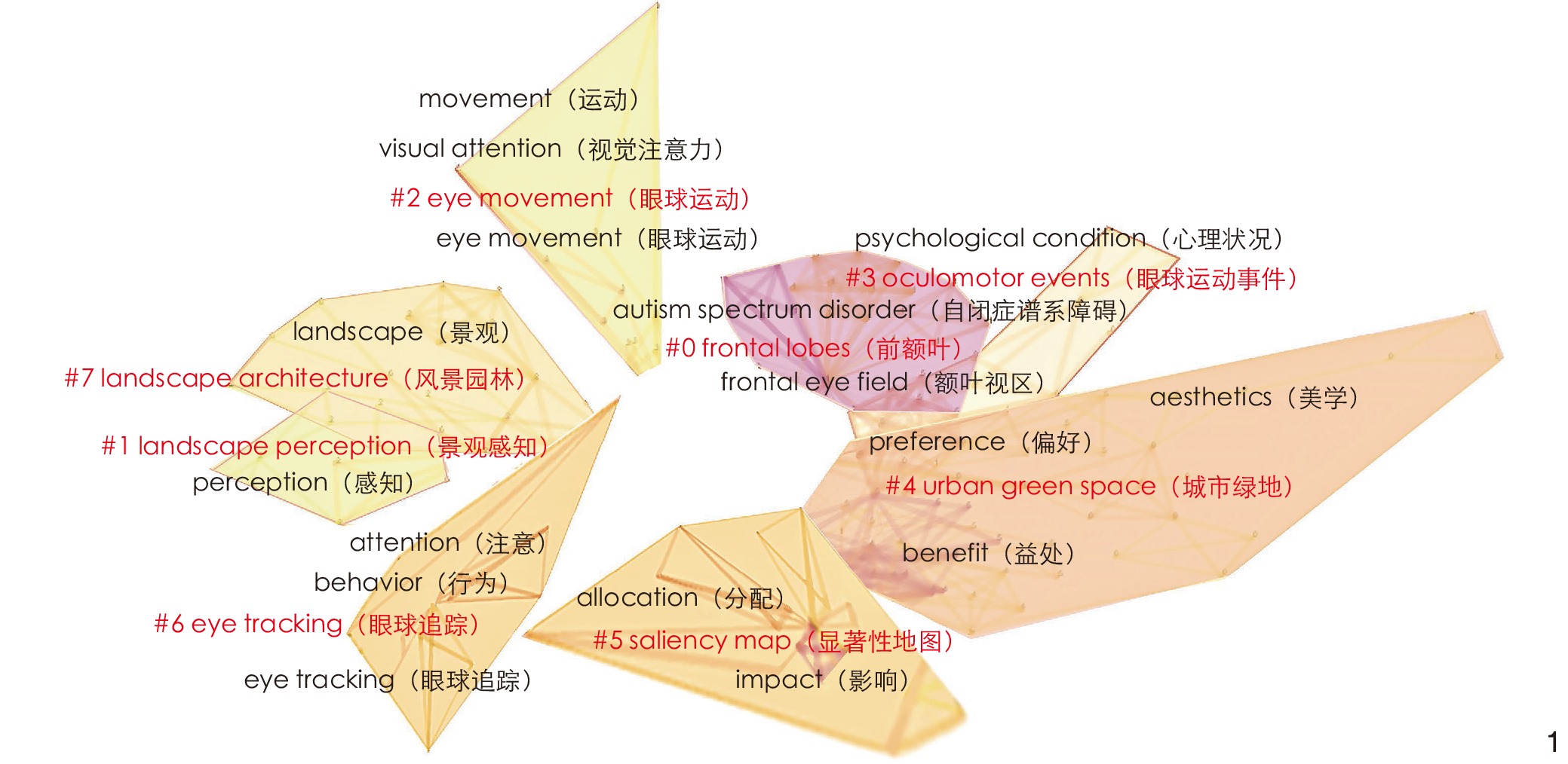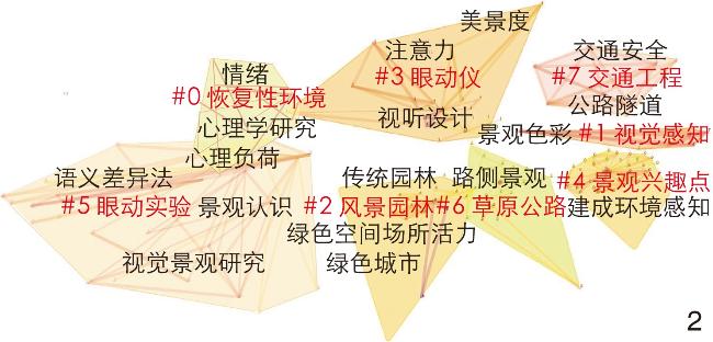 | #0 #1 #2 #3 | 前额叶(frontal lobes) 景观感知(landscape perception) 眼球运动(eye movement) 眼球运动事件(oculomotor events) | 探索(exploration)、影响(impact)、健康(health)、模型(model)、注视时间(fixation duration)、压力强度(stress intensity)、瞳孔反应(pupillary response)、新冠病毒感染(covid-19 pandemic)、额叶视区(frontal eye field)、心理状况(psychological condition)、自闭症谱系障碍(autism spectrum disorder) | 景观感知 |
