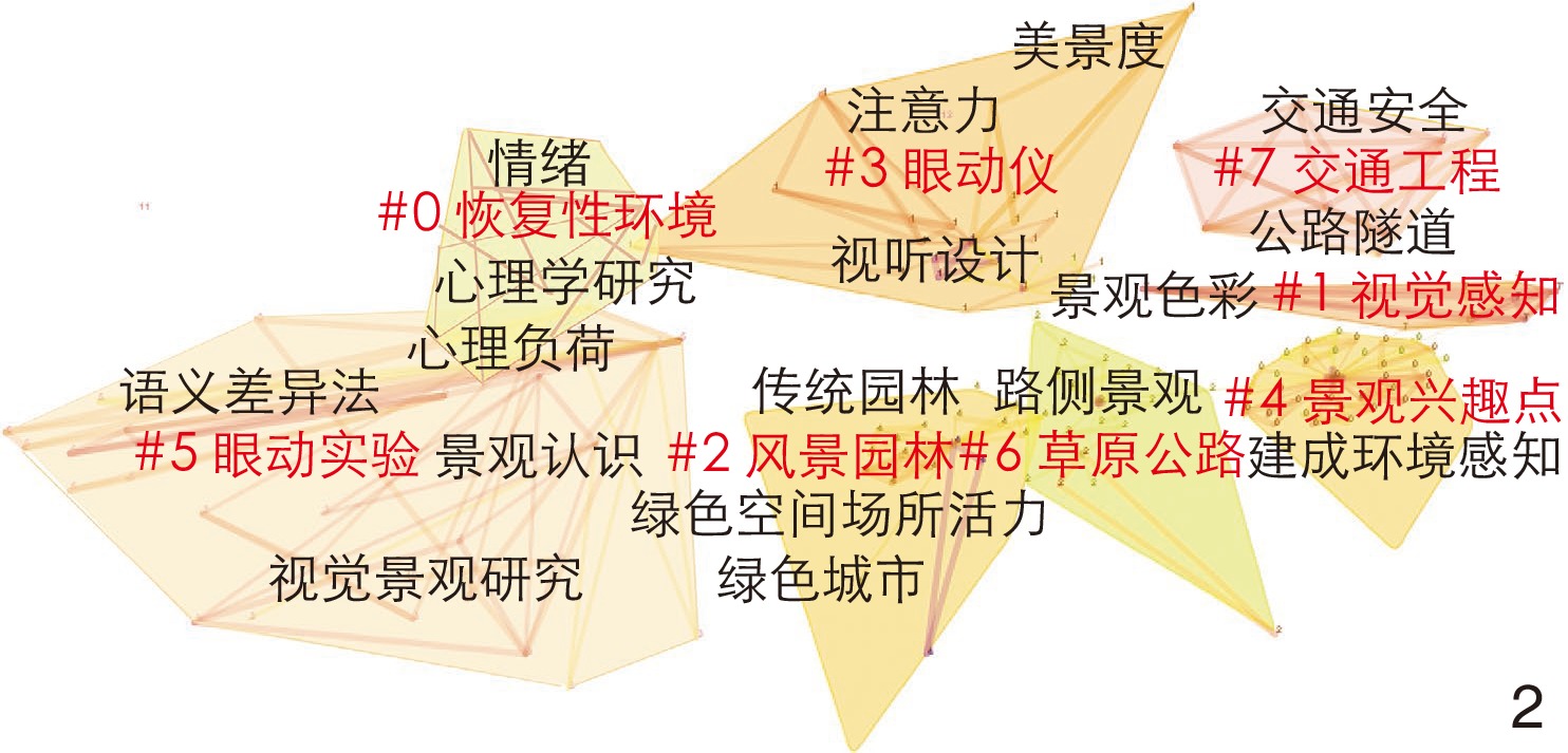 图2 国内眼动追踪技术在风景园林领域的关键词聚类Fig. 2 Keyword clustering for eye tracking technology in the field of landscape architecture in China |