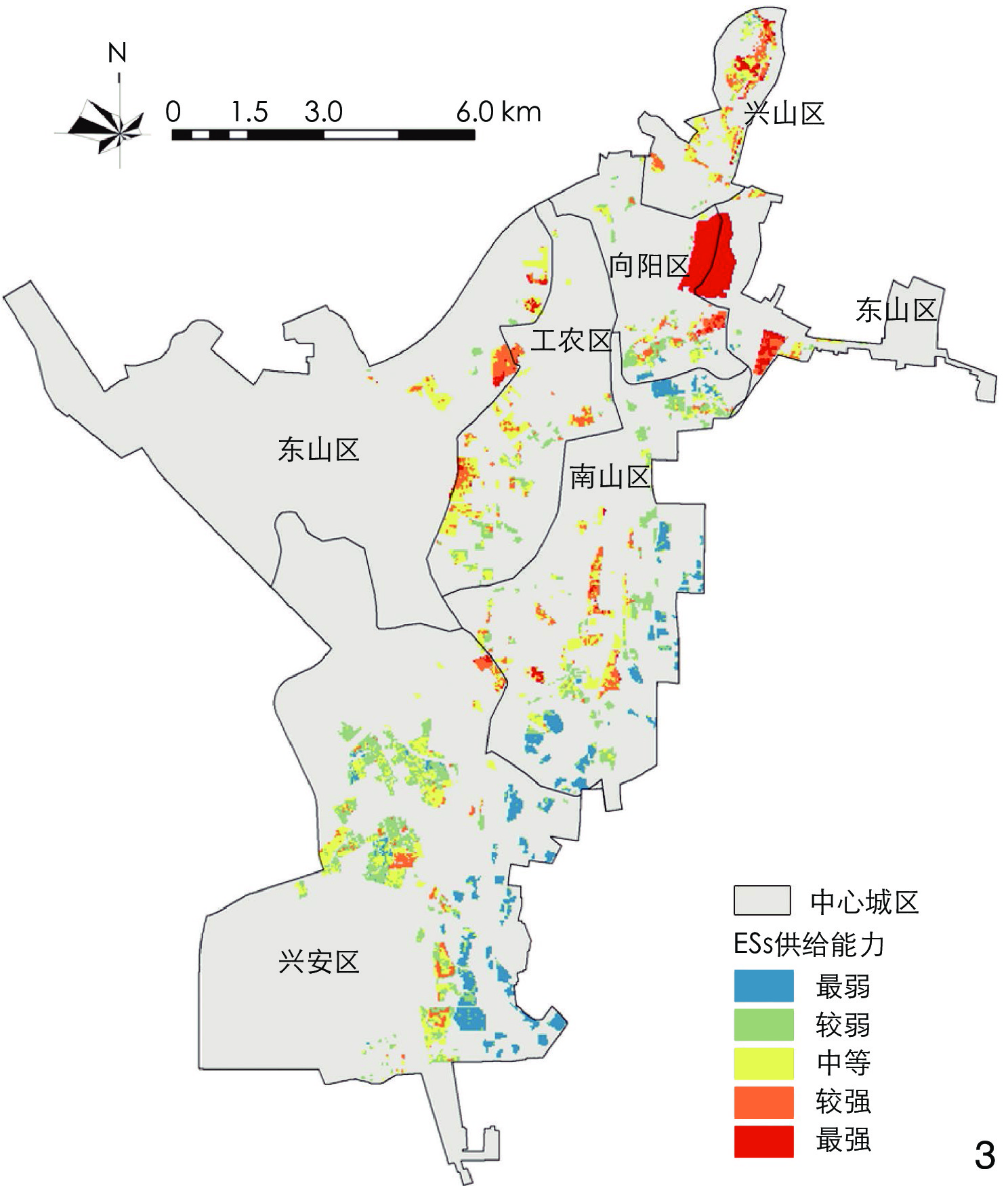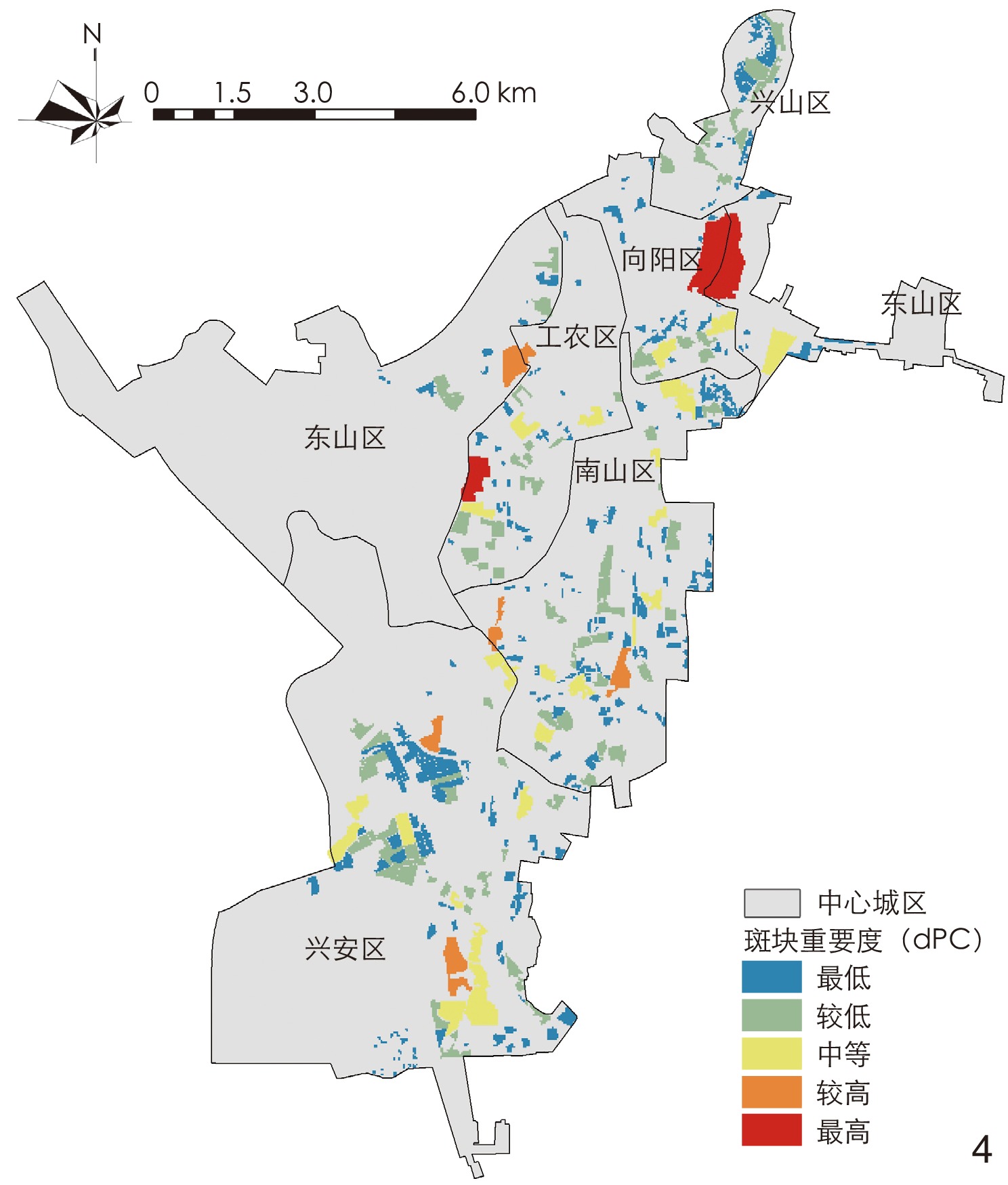 [Results] In terms of functionality, the overall results show a distribution trend of being high in the north and low in the south. Almost all areas with high ecosystem service supply are lands with minimal human activity damage, such as forests and grasslands; meanwhile, areas with low ecosystem service supply are mostly the lands left behind under the most severe impact of human activities. The vacant lands with high ecosystem service supply account for 26.47% of the total. In terms of structure, the overall landscape connectivity of vacant lands in the central urban area of Hegang is not high, with only a few vacant lands being of medium or higher patch importance. Vacant lands with high connectivity are distributed scatteredly in each district, which account for 16.26% of the total. There exists a correlation in spatial distribution between the evaluation results of the renewal potential of the vacant lands and the evaluation results of function and structure in the central urban area of Hegang. The renewal potential of the vacant lands is not high overall. Vacant lands with high potential only account for 22.19% which almost owned large area in each district. The spatial distribution pattern of the potential evaluation with respect to the renewal of urban vacant land into GI is similar to that of the functional evaluation, both showing a pattern of being high in the old urban area and gradually decreasing from urban center to the suburb. Most of the vacant lands in the central urban area of Hegang are of low potential for renewal into GI, with the vacant lands with high potential being distributed scatteredly in each district. There is only one vacant land with the highest renewal potential, located at the junction of Xiangyang District and Dongshan District in the northern part of the central urban area with an area of 105.39 hectares, accounting for 7.87% of the total. Vacant lands with high renewal potential are also quite few, with a total area of 191.88 hectares, accounting for 14.32% of the total.