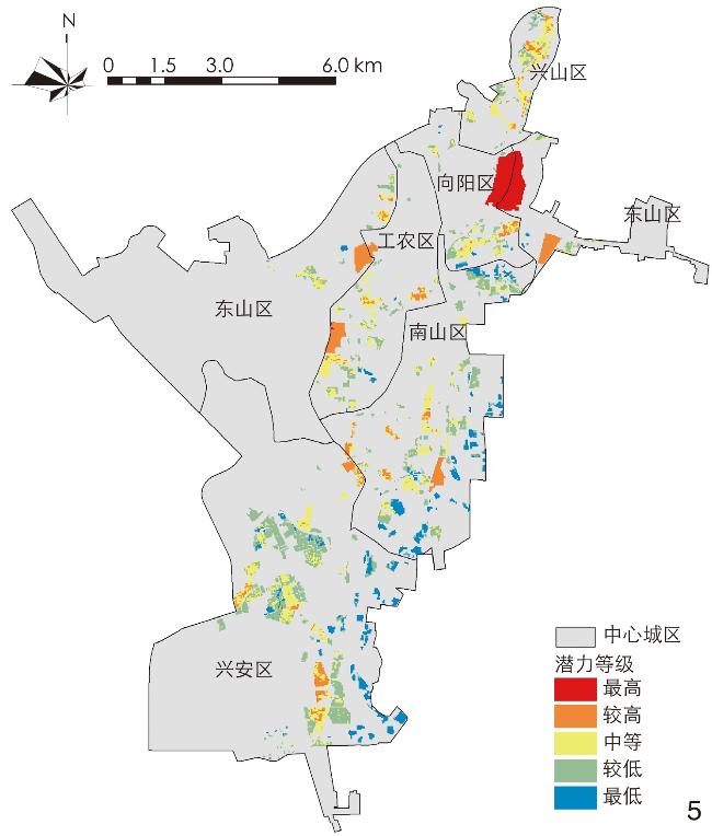 表5 不同潜力等级的城市空地面积及其比例Tab. 5 Areas and proportions of urban vacant lands under different potential levels |