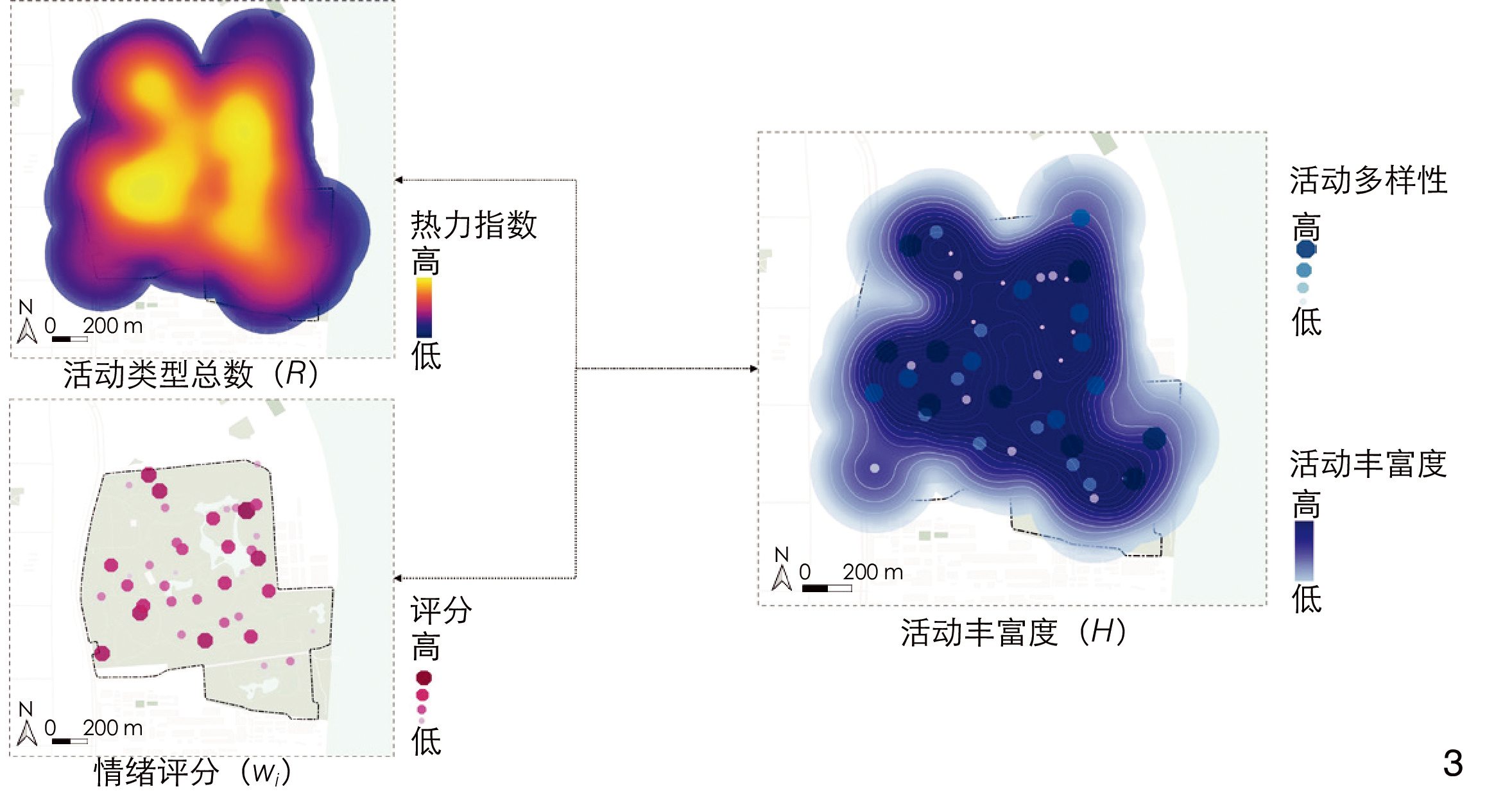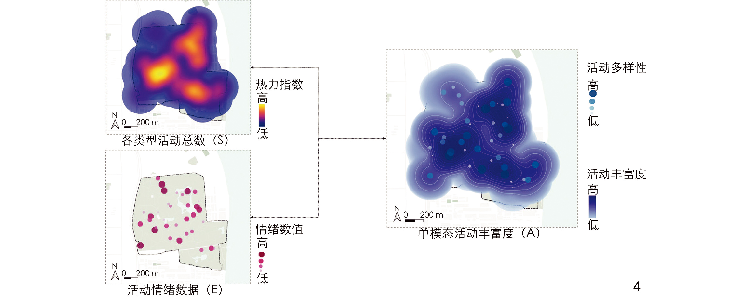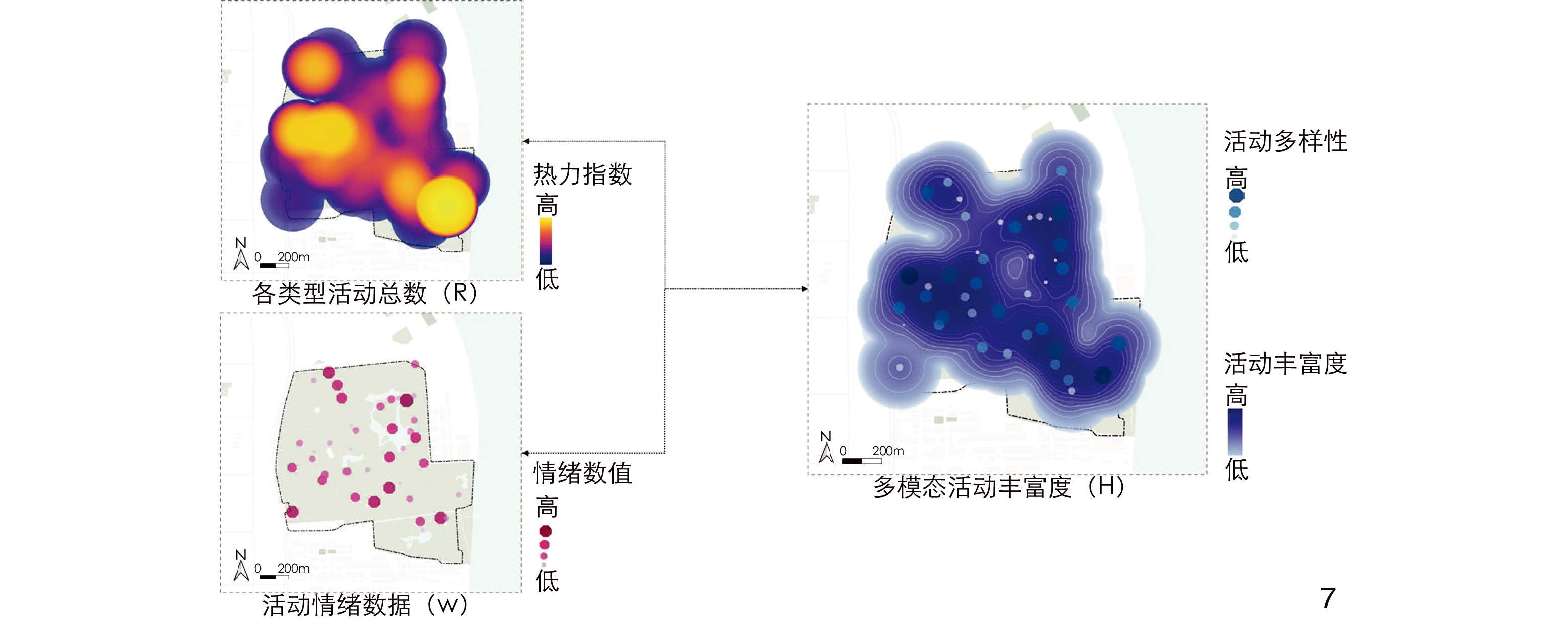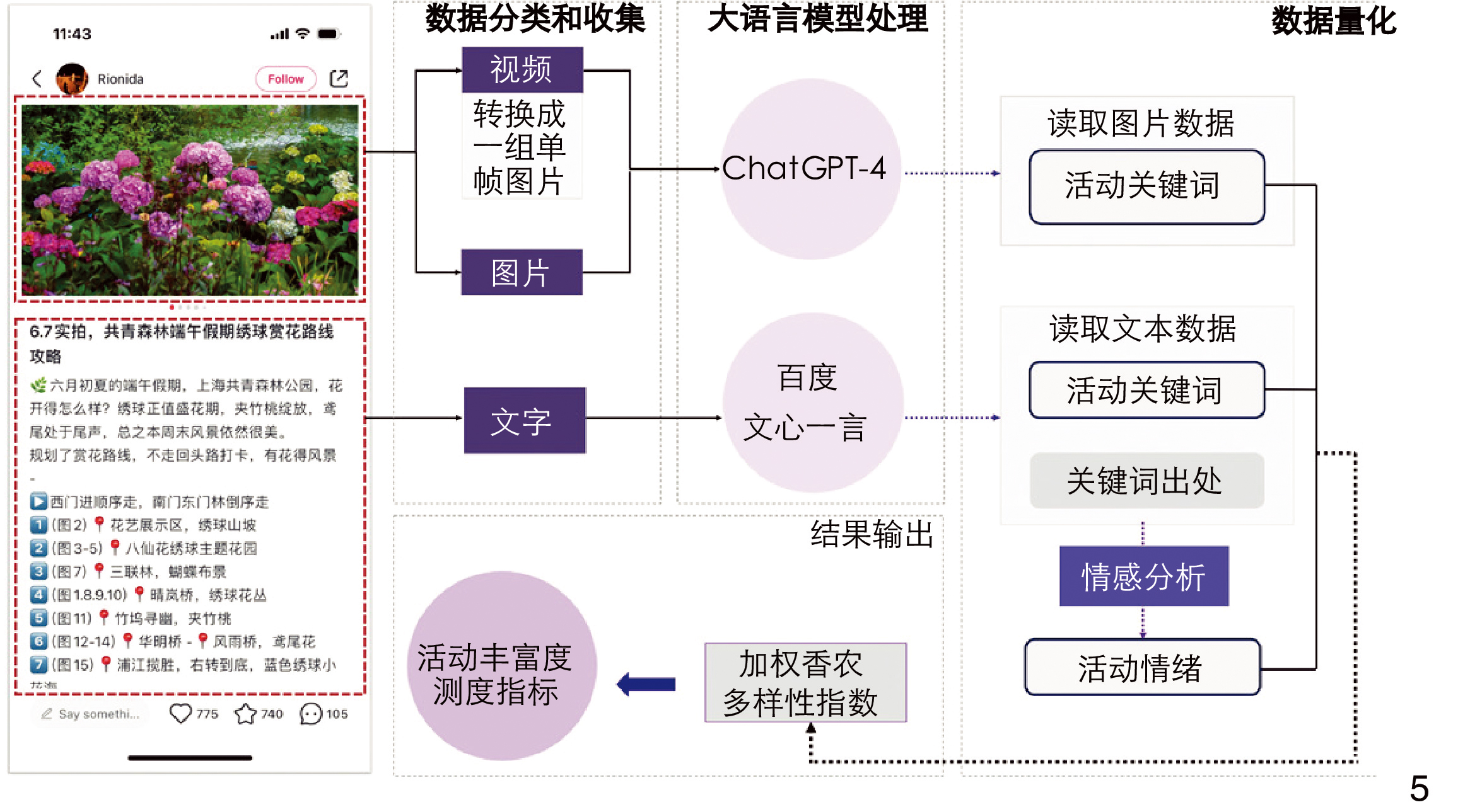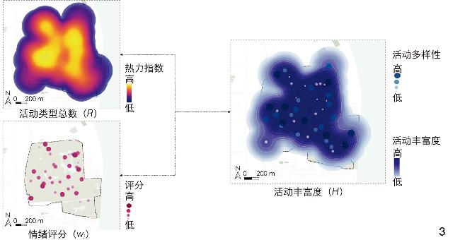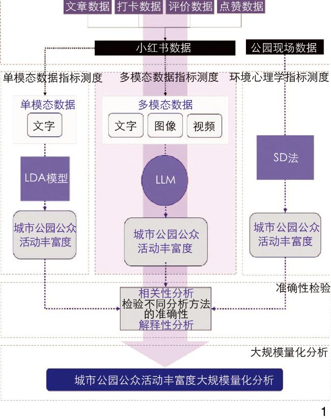 [Methods] Taking Shanghai Gongqing National Forest Park, the most popular and discussed urban park on the social media platform “Xiaohongshu”, as an example, this research employs a combination of classical questionnaire methods, LLM analysis, and traditional classical analysis methods. First, through the design and implementation of a semantic analysis questionnaire, multiple uniform surveys are conducted at the 43 most popular spots in Gongqing National Forest Park to understand public activity preferences and perceptions of different scenes. Descriptive statistical methods are used for analyzing activity intention data. Respondents are presented with images of various park scenes and their locations, and are required to detail their expected activities such as walking, running, or picnicking. The semantic differential (SD) method is used to analyze site perception data. Through statistical analysis of respondents’ ratings on different perception dimensions, a comprehensive perception evaluation of each scene is conducted to help construct quantitative indicators of activity preferences and emotional tendencies. And GIS technology is adopted to visualize public activity richness. Second, for the LLM analysis method, multi-modal data (text, image, video, etc.) from the 43 most popular spots in Gongqing National Forest Park on the Xiaohongshu platform are mined. For text data analysis, the application programming interface (API) of China’s leading LLM, Wenxin Yiyan, was used to extract activity information and calculate sentiment values. This helped identify activities and emotions of “Xiaohongshu” users in the park. For image data analysis, the API of ChatGPT-4 was used to extract activity information. Since LLM can’t directly process videos, the videos were first converted into frames and then analyzed using the same method as for images. The Shannon’s diversity index formula is adopted to calculate activity diversity in combination with the type and quantity of activities extracted from the multi-modal data, based on which a quantitative image of urban park public activity richness is constructed. Third, in the traditional classical analysis method, text data from the multi-modal data (all text portions of “Xiaohongshu” notes) are extracted as original data. The latent dirichlet allocation (LDA) model is adopted for topic modeling analysis, and NLP technology for calculation of sentiment values for each topic. Additionally, the diversity of various activities and sentiment values are combined to construct single-modal data indicators.