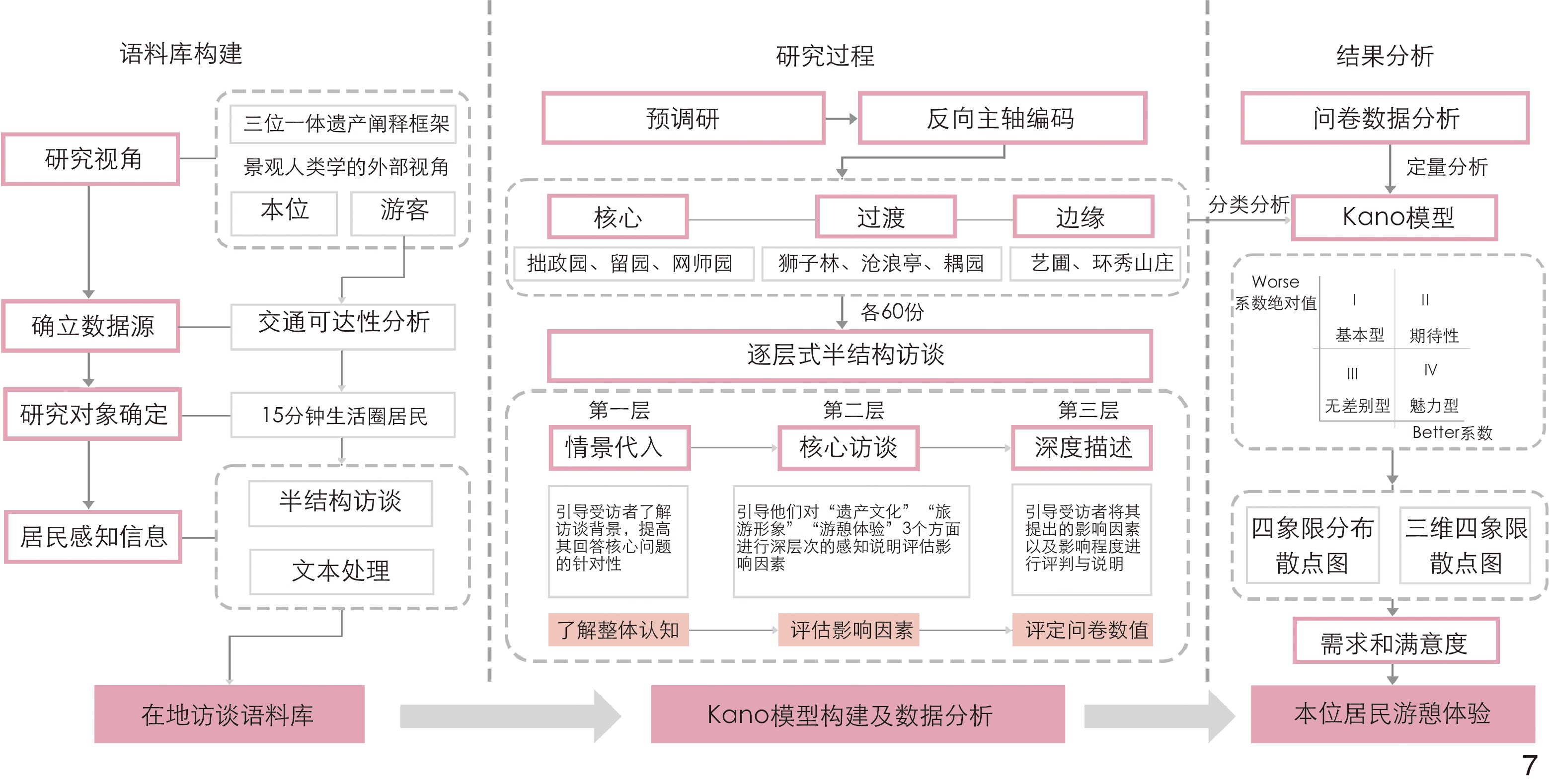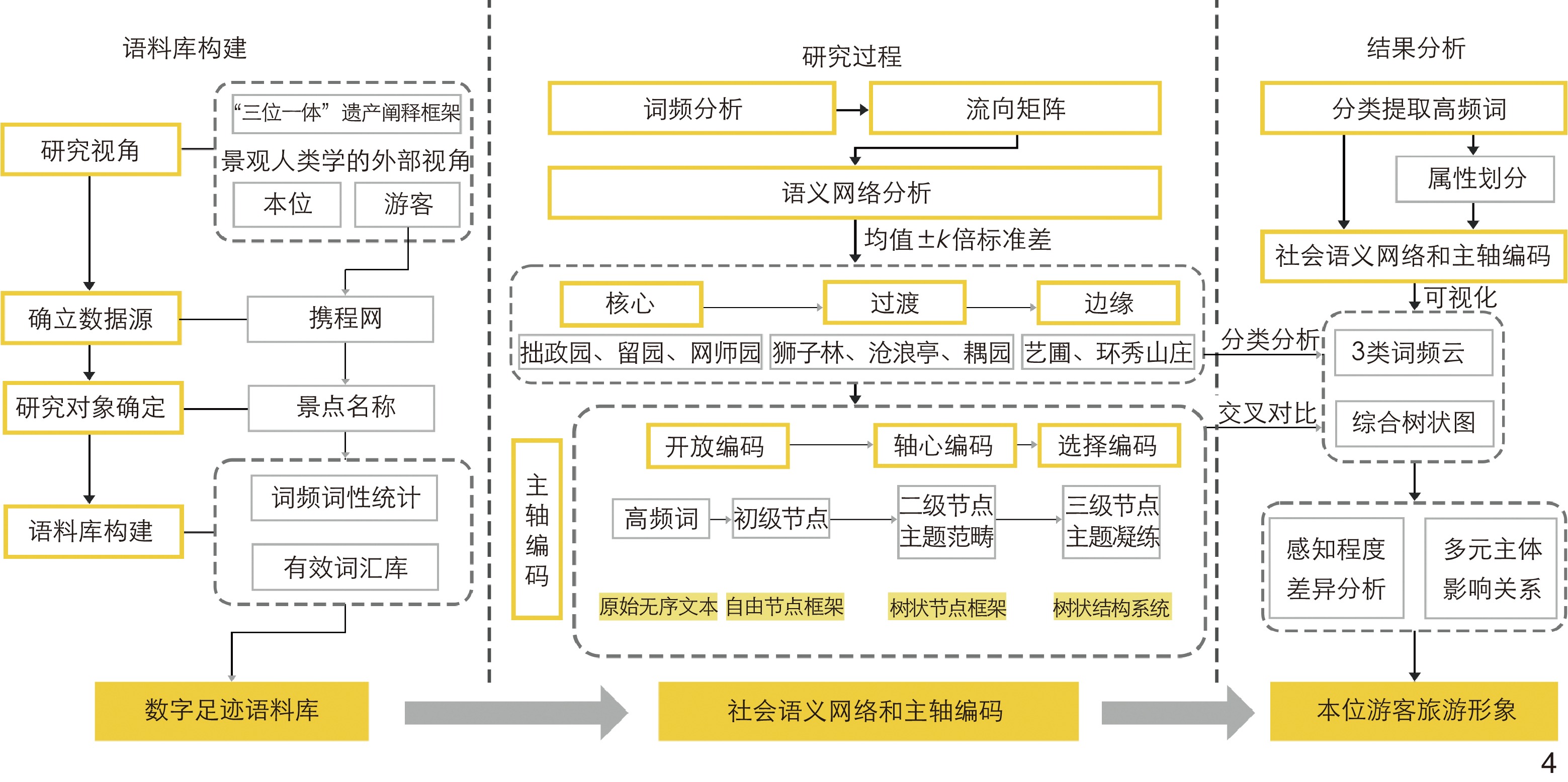 [Methods] Methodologically, the research focuses on three groups: supra-local authorities, tourists, and residents. It analyzes heritage discourse through two dimensions: “space production” by external entities and “place construction” by local society. Official texts are examined using a heritage value framework and word frequency-weighting methods to create a policy-value analysis for the supra-local and higher-level perspectives.Tourist perspectives are analyzed through digital footprint data, categorizing gardens into core, transitional, and peripheral types. Semantic network analysis evaluates heritage cognition. Resident perspectives are studied via garden classification, semi-structured interviews, and coding systems. The Kano model is applied to categorize residents’ heritage cognition into demand attributes, refining the overall interpretive framework.