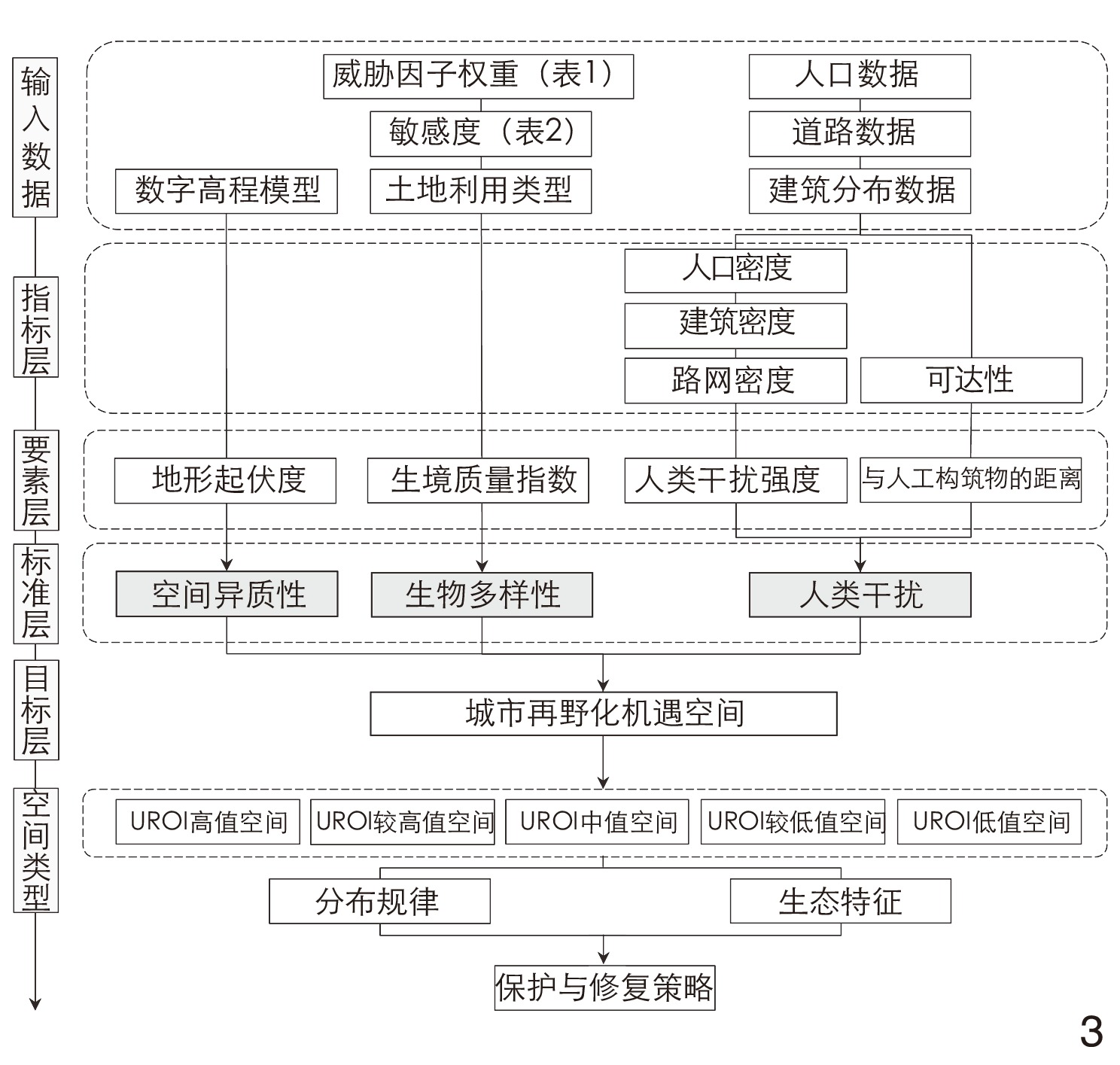 表3 城市再野化机遇空间评价指标权重Tab. 3 Evaluation indicators and weights of UROS |
