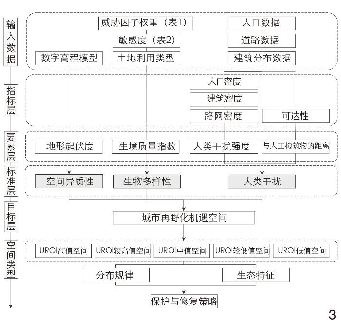 This research introduces the concept of urban rewilding opportunity spaces (UROS) to identify and assess areas suitable for urban rewilding. UROS refers to urban spaces that either already possess wild characteristics in need of protection or have the potential to develop new urban wildness. A comprehensive quantitative and spatial analysis framework is developed to identify UROS within the Direct Administration Zone of Tianfu New Area. This framework integrates multi-source data, including data on land use, topography, population density, buildings, and roads, and employs advanced quantitative methods such as neural network, InVEST model, inverse distance weighting interpolation, and the entropy weight method. These methods are used to extract key influencing factors — spatial heterogeneity, biodiversity, human interference, which are critical for urban rewilding processes. The urban rewilding opportunity index (UROI) is calculated by weighting and summing relevant indicators, and the spatial distribution of UROS is mapped using ArcGIS 10.8.