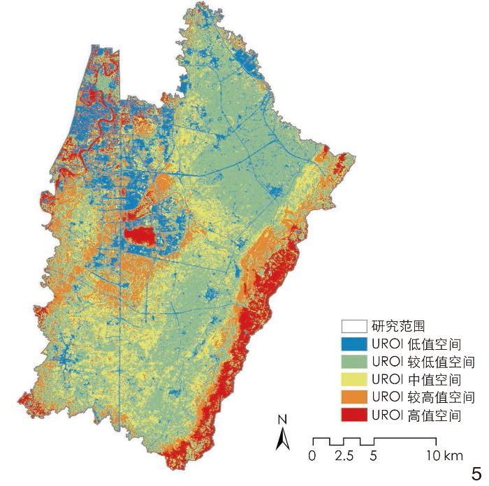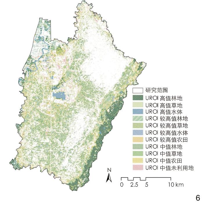 The UROI is classified into five categories using the natural breaks classification method: High (UROI≥0.628), relatively high (0.628>UROI≥0.451), moderate (0.451>UROI≥0.302), relatively low (0.302>UROI≥0.145), and low (UROI<0.145). Areas with UROI≥0.302 are designated as UROS. Areas with high UROI value cover an area of approximately 48.48 km², representing 8.68% of the research area, with 1,932 patches smaller than or equal to 900 m² in area, accounting for 56.26% of these high-value spaces. Areas with relatively high UROI value cover an area of 75.25 km², or 13.47% of the research area, with 5,549 patches under 900 m² in area, comprising 55.54% of this category. Areas with moderate UROI value cover an area of 101.71 km², with 10,986 patches under 900 m² in area, making up 56.67% of this category. The findings indicate that over half of the UROS within the research area are small patches with an area less than or equal to 900 m². Areas with high UROI value are primarily located in regions with minimal human interference, high spatial heterogeneity, and significant spontaneous vegetation, such as Longquan Mountain, the Luxi River corridor, and the ecologically restored Xinglong Lake wetland. Moderate-value UROS, covering a larger area, are typically found at the edges of areas with high or relatively high UROI value or within urban built-up areas, including grasslands, forestlands, wetlands, long-term unused or abandoned lands, and farmlands with semi-natural habitats, which are more susceptible to human impact.
