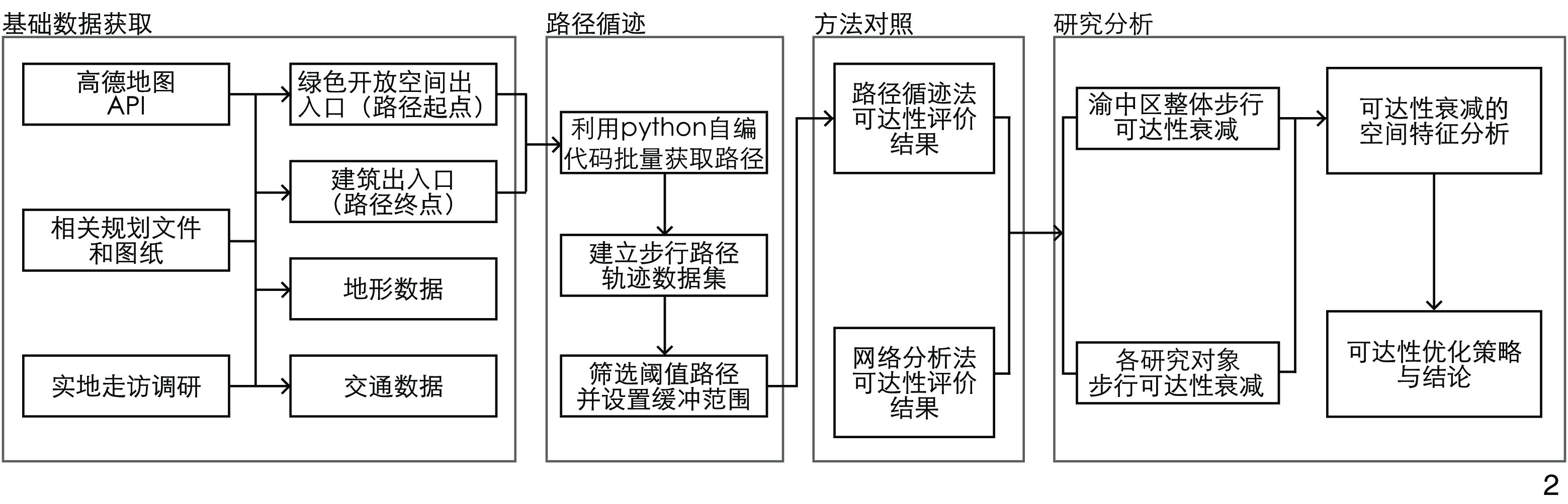 Taking Yuzhong District in Chongqing as an example, this research, based on ArcGIS platform and Amap application programming interface (API), develops a new quantitative accessibility evaluation method termed “path tracking method” with reference to the path buffer method proposed by previous scholars. Then the research compares the evaluation results of the path tracking method and the network analysis method to differentially identify the areas with accessibility attenuation, which helps more clearly and accurately reflect the spatial problems under the influence of mountain conditions. After that, the research discusses the gap between the theoretical and practical use of green open space. Specifically, the path tracking method uses python-based self-programmed code to obtain the walking path trajectory data from the green open space entrance to the building entrance in batches, unify the geographical coordinate system and carry out visual analysis, set the buffer range at both sides and end point of the path as 10 meters and 30 meters respectively, and obtain the accessible range of 5, 10 and 15 minutes.