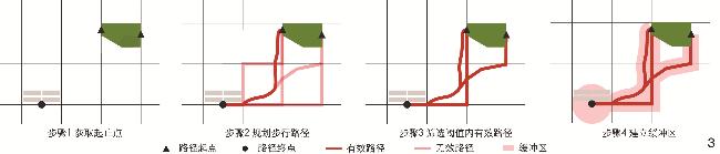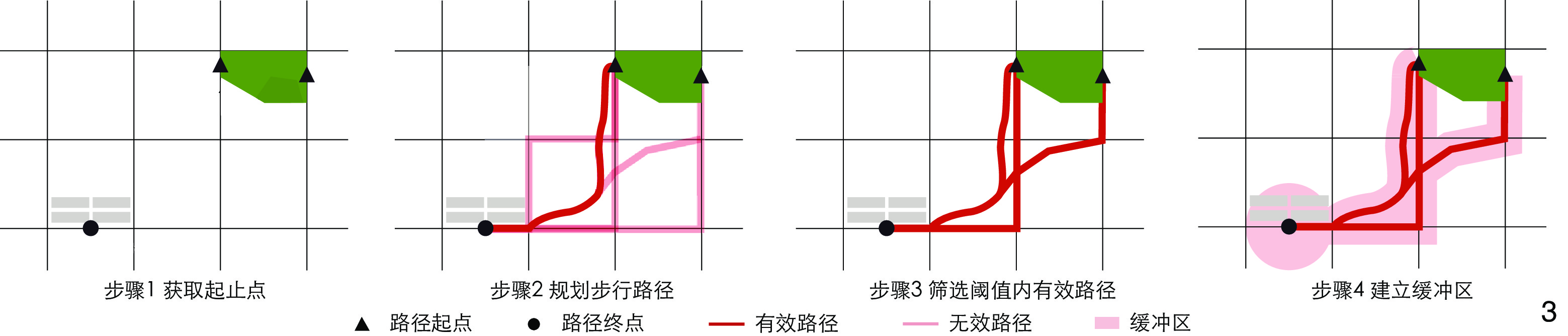 | 路径循迹法 | 从路径出发,更符合实际步行轨迹;绕行过街设施或山体、等待交通信号灯等均产生步行阻力;按实际情况设置路径缓冲,能够适应山地条件下低渗透性的城市形态 | ① | ③ |