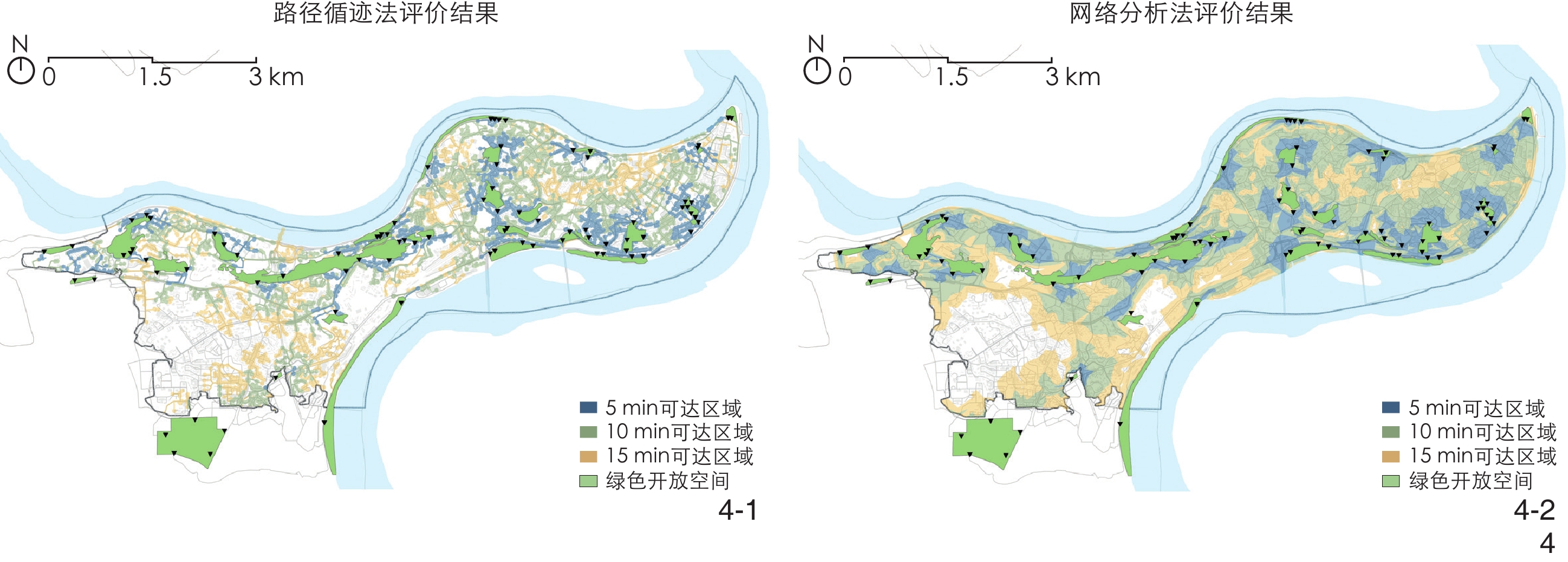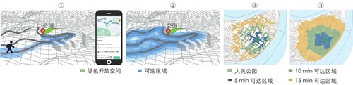 | 网络分析法 | 从路网出发,模拟理论可达范围;以水平方向的时间、距离设置阻抗;不考虑道路两侧的用地性质及渗透性 | ② | ④ |