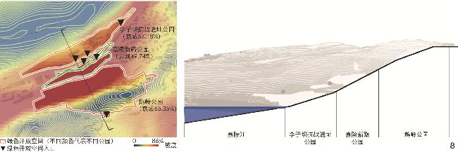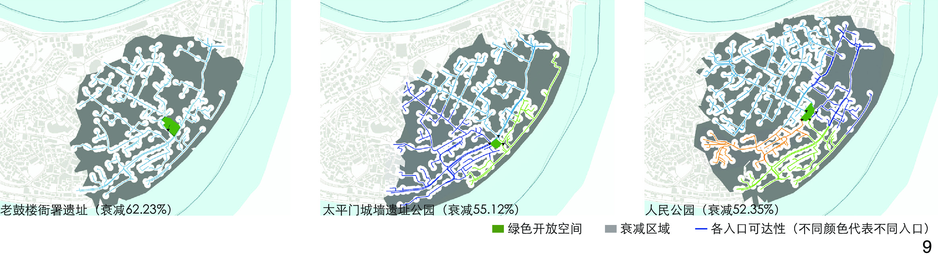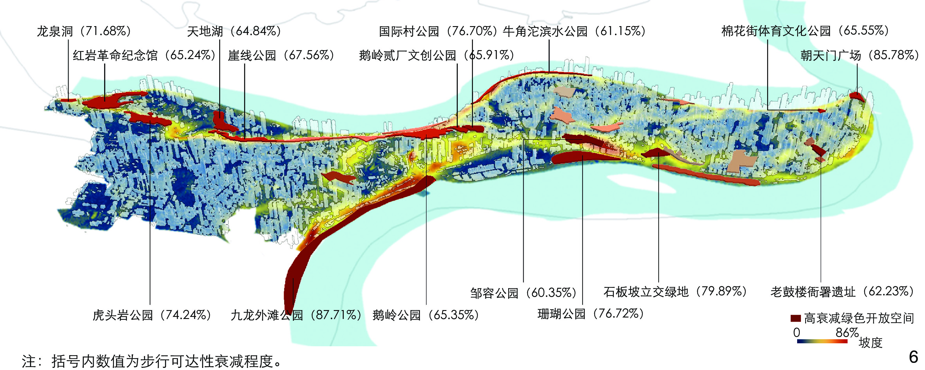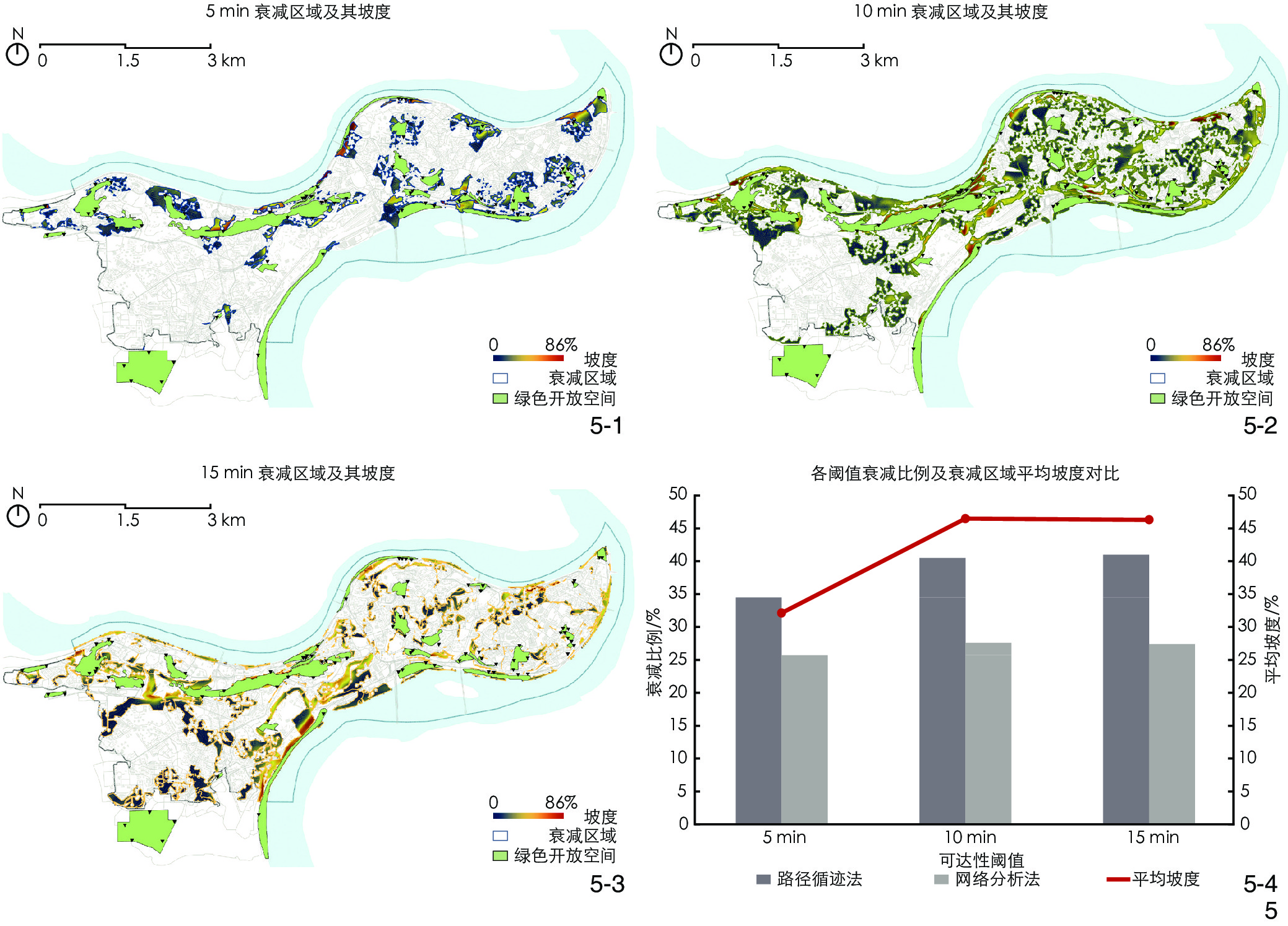 The walkability evaluation results of green open space in Yuzhong District show that: 1) The evaluation results of the two methods reflect similar spatial distribution, that is, there exist large-sized service blind areas in the southwest and the periphery of Yuzhong District; 2) comparing the evaluation results of the two methods, it is found that the walkability of green space in Yuzhong District decreases by 43.19%, and the accessibility attenuation areas within the threshold of 5 minutes, 10 minutes and 15 minutes account for 32.12%, 46.49% and 46.30%, respectively; 3) the longer the actual walking distance, the greater the attenuation of accessibility; the attenuation area within the 5 min threshold is mostly located at the entrance of green open space and complex three-dimensional traffic area, and the attenuation area within the 10/15 min threshold is mostly distributed along the terrain or road trend; the insufficient pedestrian permeability of blocks may also lead to the attenuation of accessibility; 4) the accessibility attenuation varies among different research objects, of which 16 objects have an attenuation degree greater than 60%, and Kowloon Bund Park has the largest attenuation degree with an attenuation ratio of 87.71%; 5) in order to further analyze the correlation between mountain spatial characteristics and accessibility attenuation, the green open spaces are divided into five types according to their geographical locations, among which the hilltop, platform-based and riverside wedge-shaped green open spaces have a higher degree of attenuation; 6) factors affecting the accessibility attenuation of green open space in mountain cities include location factors, environmental factors and ontology factors.