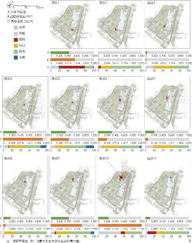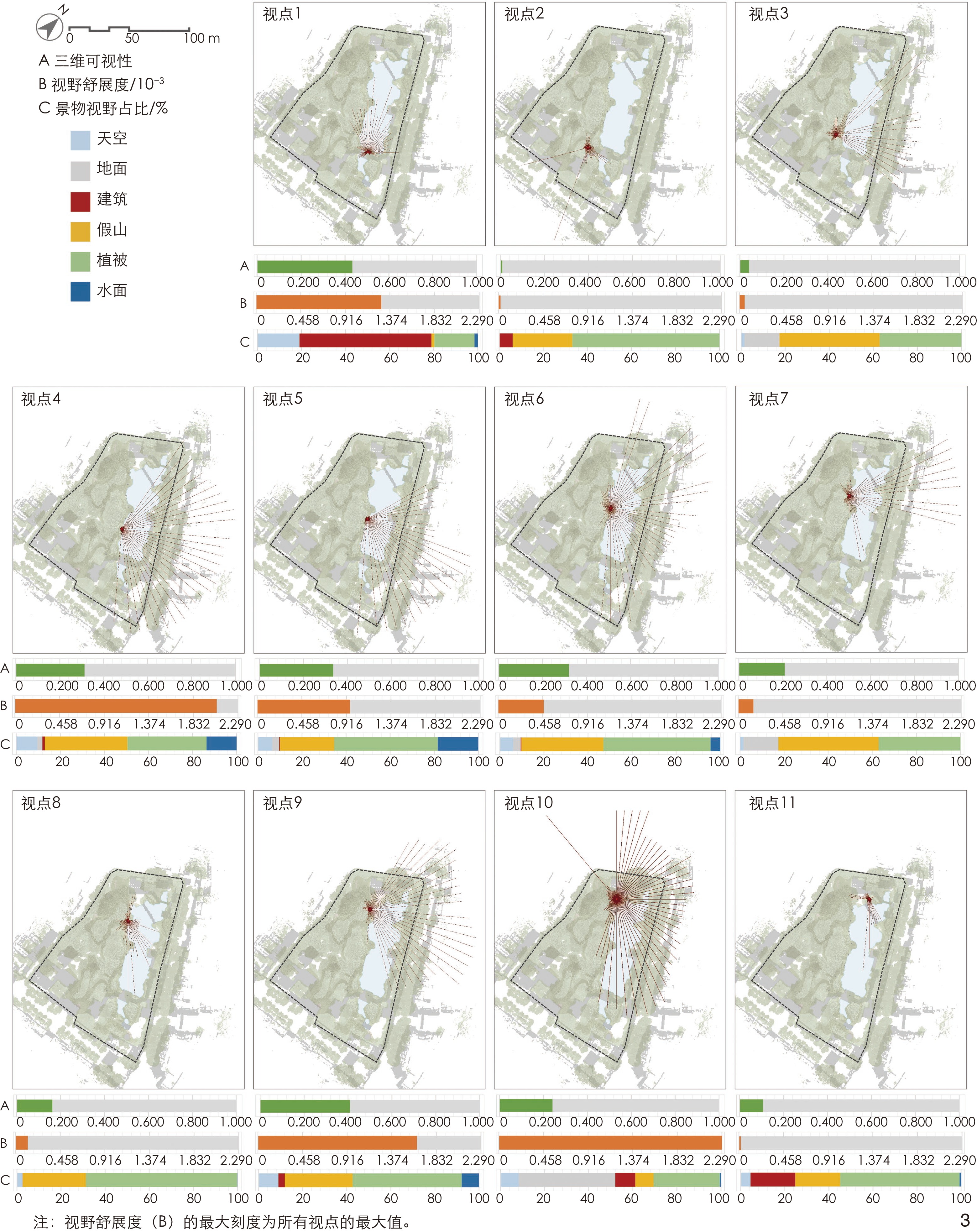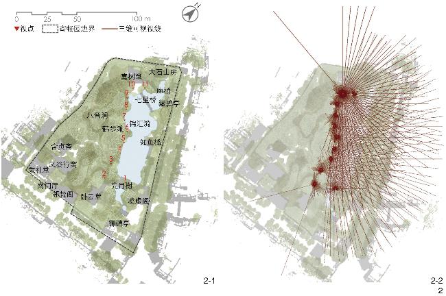 This research’s main findings consist of three parts. 1) 3D visibility calculation results. From the visibility analysis results of 11 viewpoints, it is evident that viewpoints 1, 5, 6, 7, and 10 have a relatively broad visual field, with some line of sight reaching a length of 100 meters. 2) Evaluation results of visual space indicators. The viewpoint with the highest 3D visibility is labeled as viewpoint 1, located at the Xianyuexie water viewing platform, while the one with the minimum 3D visibility is labeled as viewpoint 2. The viewpoint with the highest “visual spread” is viewpoint 10, situated in the plaza at the south of the Jiashutang building, while the one with the minimum “visual spread” is viewpoint 11. Except for viewpoint 1 (dominated by buildings) and viewpoint 10 (dominated by the ground), the highest “feature ratio of visual field” is occupied by vegetation. 3) Interpretation of the calculation results. Firstly, the research interprets the reasons for forming a scenic view from a single viewpoint. “3D visibility” can be used to identify the scale of the visual field in gardens. At the same time, the “feature ratio of visual field” can be employed to analyze the factors contributing to the scale of visual space. Moreover, incorporating the “visual spread” indicator further makes it possible to identify the morphological features of visual space in traditional gardens. Secondly, the research explores route-based visual space transitions. From the perspective of landscape sequence, visitors, starting from the Xianyuexie water viewing platform and passing through Hebutan (a small pond) to reach the Jiashutang building, undergo at least the following spatial perception processes. 1) Xianyuexie – woody path (near Jiushitai): Visitors transition from the lake viewing space beside the Xianyuexie building to the enclosed space surrounded by a group of trees along the path. 2) Woody path – Hebutan: Visitors experience a shift from a relatively enclosed environment to a more open water viewing space. The peak of this water viewing experience occurs near viewpoint 5 (Hebutan), a space with water on three sides. 3) Hebutan – waterside path (near Bayinjian): Visitors’ experience transitions from an open water viewing space to a more enclosed space where the view of the lake is obstructed by plants, enriching the water viewing experience and preventing aesthetic fatigue resulting from continuous exposure to similar spatial environments. 4) Waterside path– Jiashutang: Visitors’ experience evolves from a closed, plant-dominated space to a gradually more open lake viewing space in front of the Jiashutang building, serving as the endpoint of the entire perceptual space sequence on the west side of Jinhuiyi Pond.
