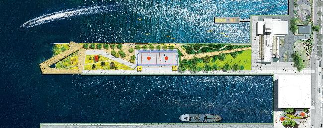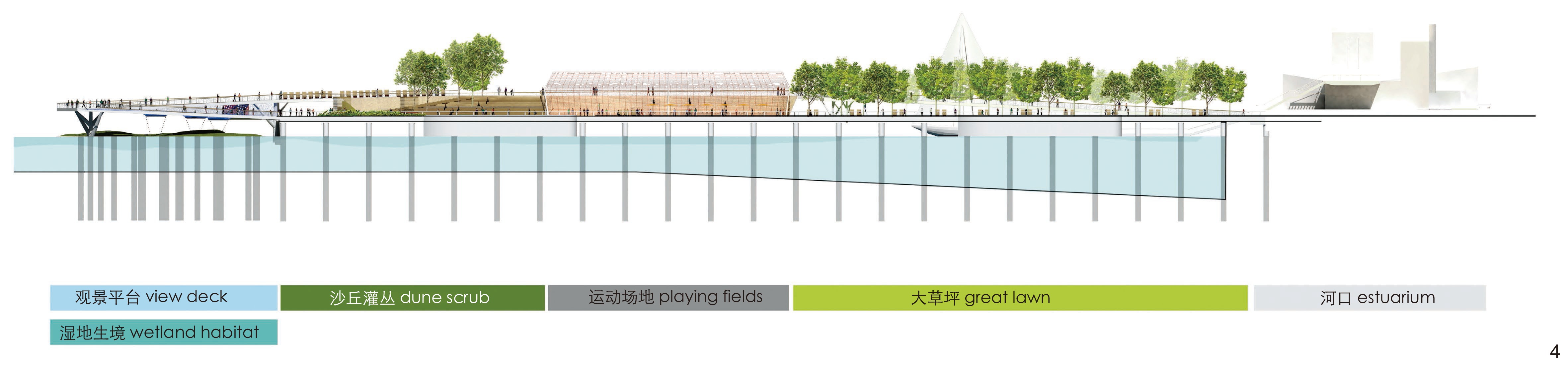 图2 将人们带到河口。码头距离海岸约260 m,经由生态规划的码头拥有灵活的游憩空间,包括运动场和一个可容纳900人的大草坪Fig. 2 Bringing people to the estuary. Reaching 850 feet from shore, the ecologically programmed pier has flexible recreation spaces with a Sport Court and a 900-person capacity Great Lawn |