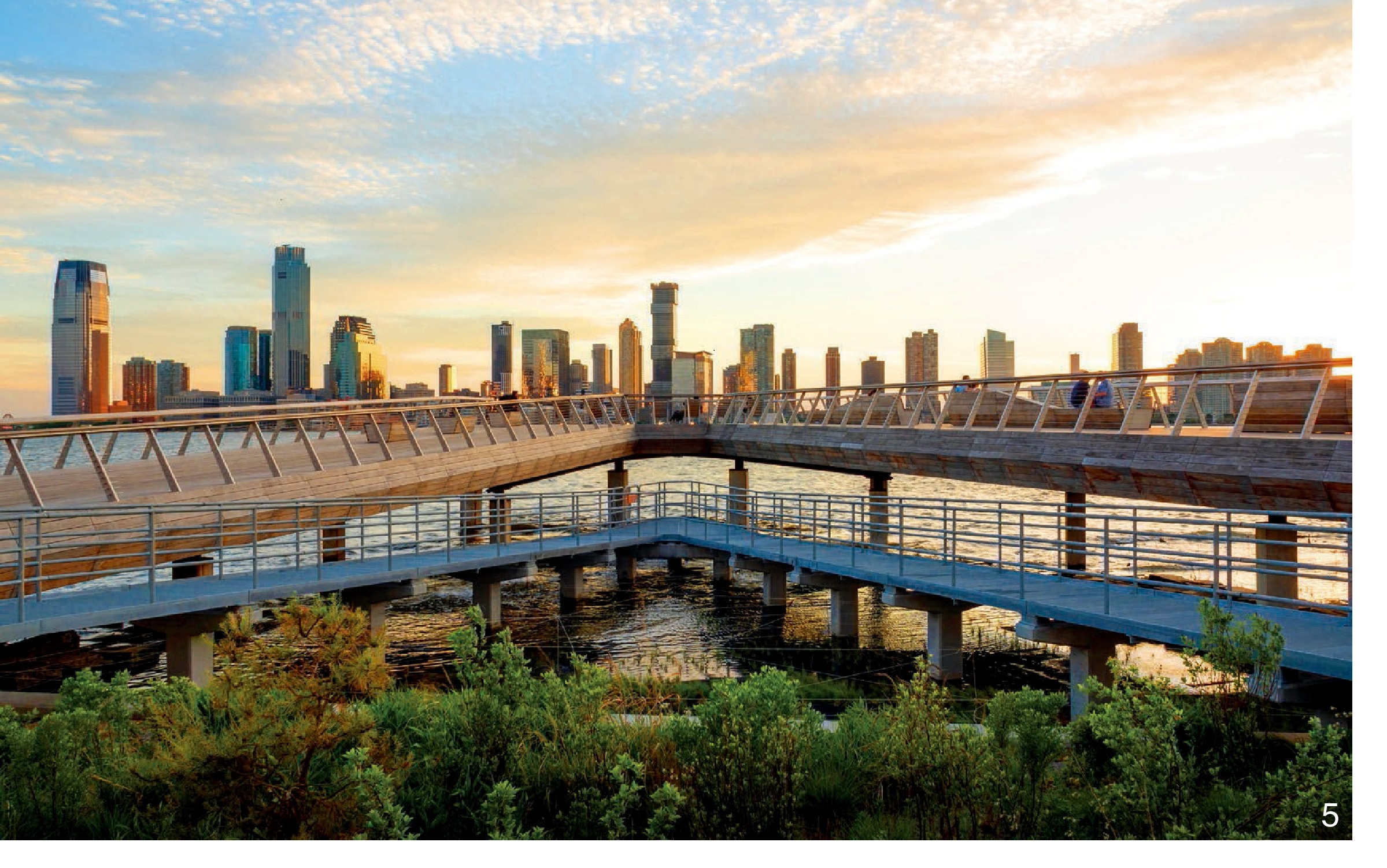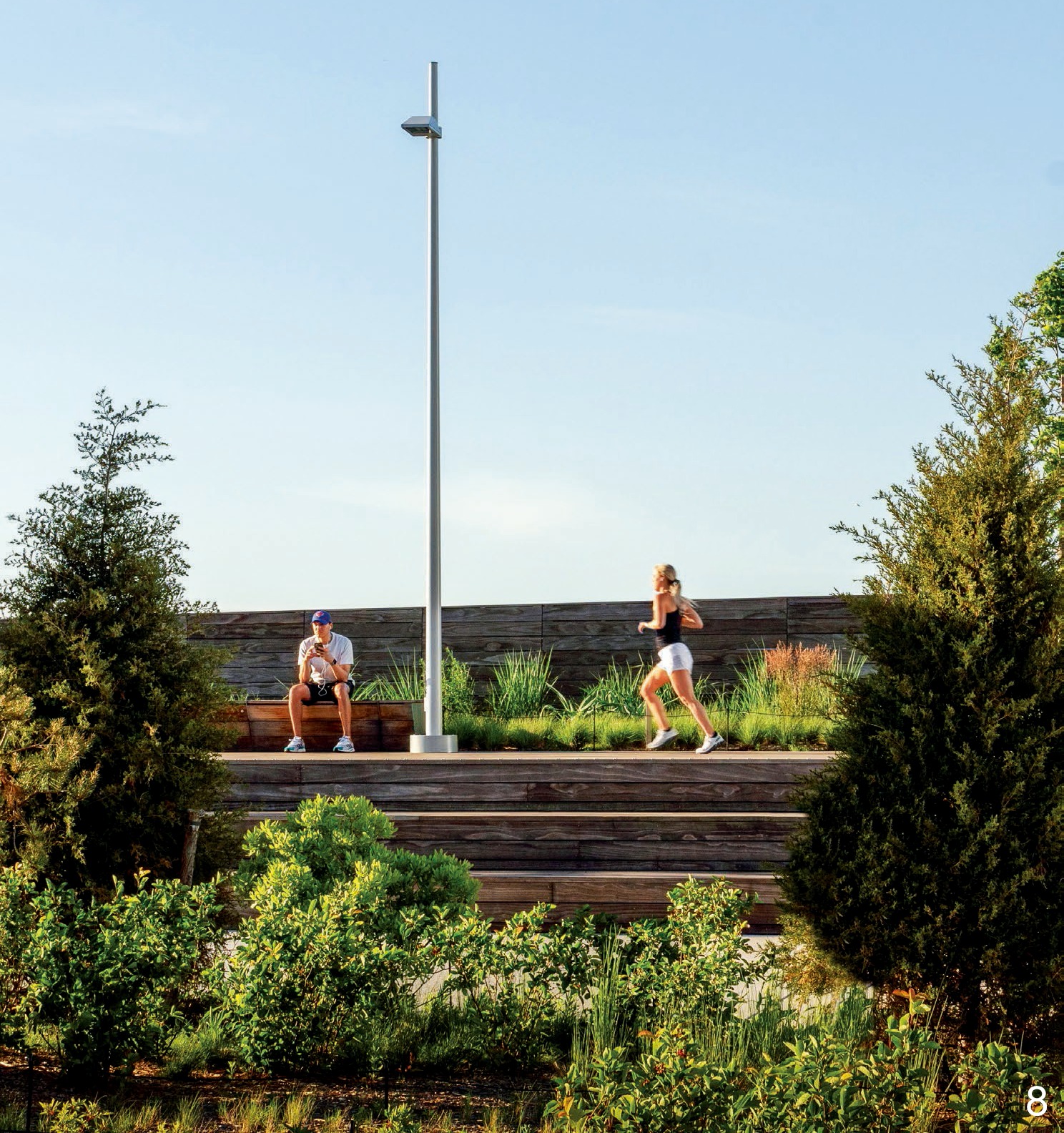 图8 奔向前方。慢跑者在社交甲板上跑步,这个由特殊防腐木制成的巨型结构横跨公园的每个生态区Fig. 8 A run to the end. Joggers run along the Social Deck, a single massive Kebony wood structure that traverses every ecozone in the park |