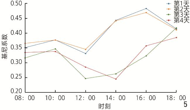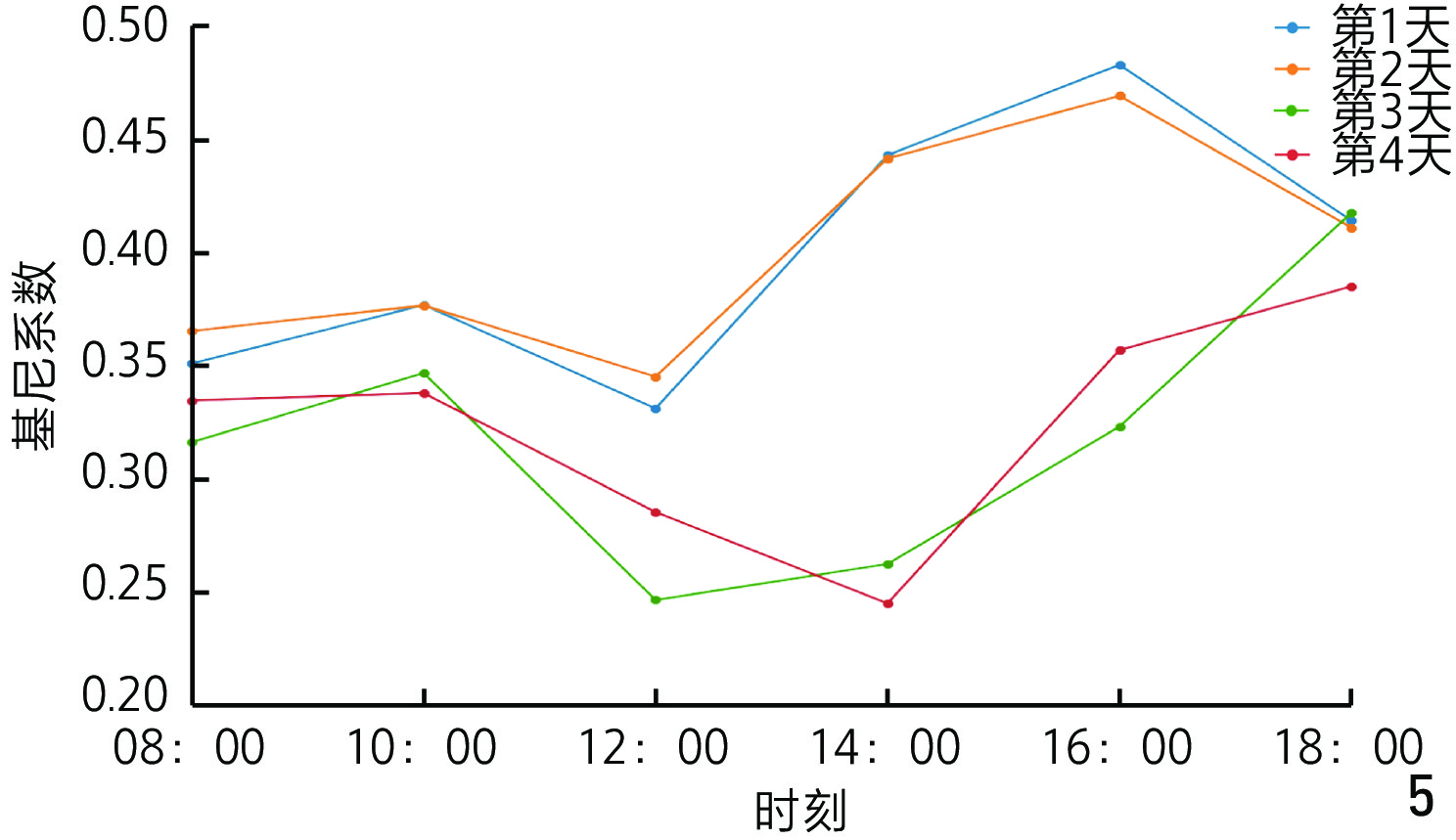 [Results] The temporal analysis results indicate that the overall utilization of Xingfu Forest Belt exhibits a distinct “dual-peak” pattern. On rest days, the number of visitors reaches 2,112 at 10:00 and 3,641 at 16:00, reflecting typical peaks of family and leisure activities. The daily coefficient of variation (CV = 38.67%) is relatively low, suggesting stable visiting patterns with activity concentrated in leisure hours. In contrast, on working days, vitality peaks occur at 10:00 and 18:00, corresponding to post-commuting and after-work relaxation periods, respectively. The higher daily visiting (CV = 55.34%) indicates a more uneven temporal distribution of activities. Notably, 12:00 represents the lowest point of visiting (the minimum number of visitors is only 595, and the average number is 883), implying underutilization of space during midday and suggesting potential opportunities for future facility optimization or time-specific programming. The spatial equilibrium analysis further reveals that during peak hours (14:00 and 16:00), the spatial Gini coefficient reaches 0.44 – 0.48, indicating a strong concentration of vitality in specific functional zones and a pronounced spatial polarization effect. In contrast, the Gini coefficient drops to 0.24 during off-peak periods (08:00 and 12:00), reflecting a more dispersed and evenly distributed use of space. At 18:00, the Gini coefficient remains between 0.38 and 0.41, suggesting a moderate level of aggregation in the evening. Overall, the vitality of Xingfu Forest Belt demonstrates a dynamic pattern of “daytime polarization with evening recovery”. In terms of spatial distribution, vitality hotspots are primarily concentrated along the central and northern segments of the belt, forming localized peaks. The emergence of these core areas is driven by two main factors: 1) the attraction of fixed functional facilities such as children’s play areas, fitness zones, and square-dancing spaces; and 2) the temporal aggregation generated by periodic activities, including weekend family events and morning exercise. At the macro scale, the concentration of residential and educational land uses, high accessibility to bus stops, and the scarcity of comparable recreational facilities jointly reinforce the sustained vitality of the central children’s play area. Maintaining consistently high footfall and strong spatial spillover effects across multiple time periods, this area serves as a key vitality hub within the overall spatial structure of Xingfu Forest Belt.