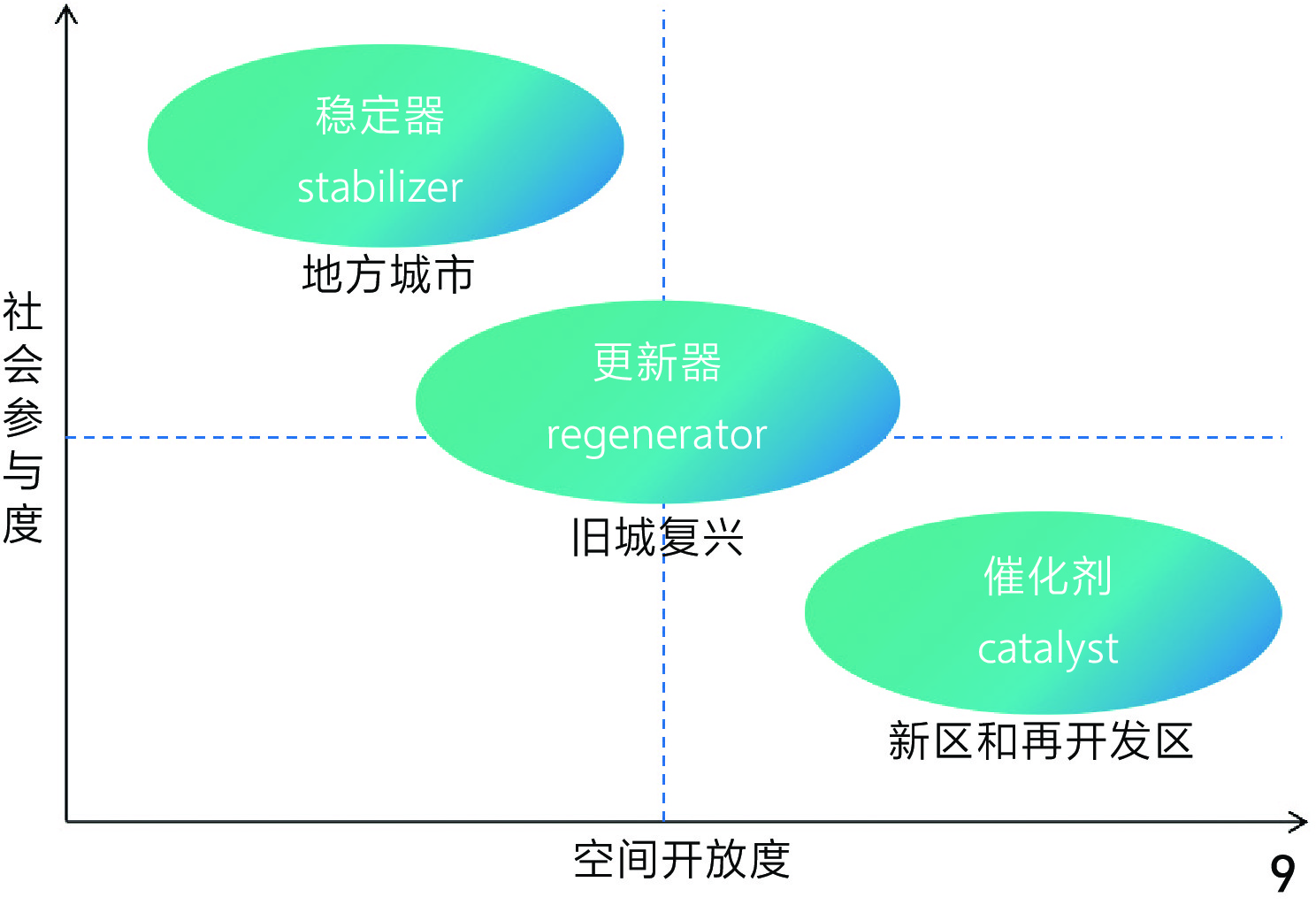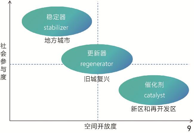 2、构建催化剂、更新器、稳定器3类校园景观策略模式,首次从景观视角阐释高校空间的分层响应逻辑。