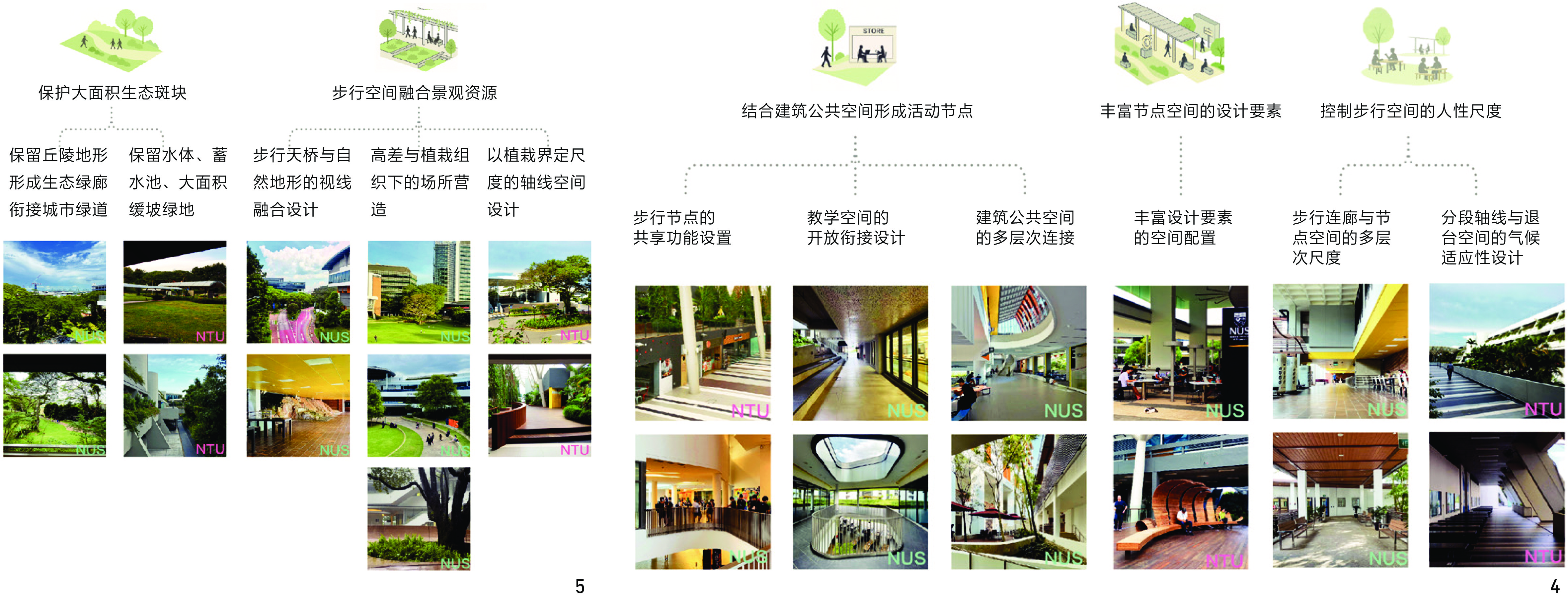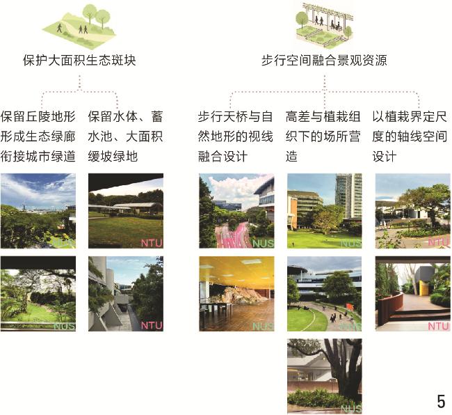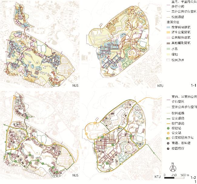 1、界定了校园步行环境的4个关键方面——整体布局、公共空间营造、景观融合与设施构造,系统分析了新加坡2所综合性大学步行空间的组构与设计特征,为大学步行系统的设计与更新提供参照。