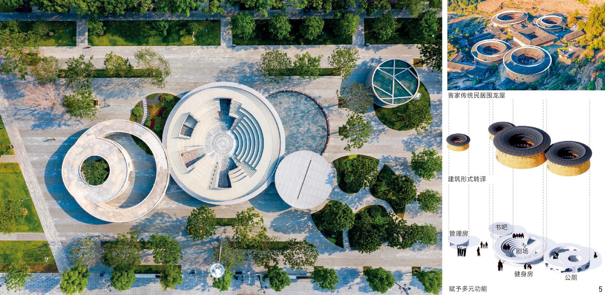 图5 广场的配套建筑设计灵感来源于客家民居围龙屋Fig. 5 The design inspiration for the supporting buildings of the plaza comes from the Hakka folk house known as Weilong House |