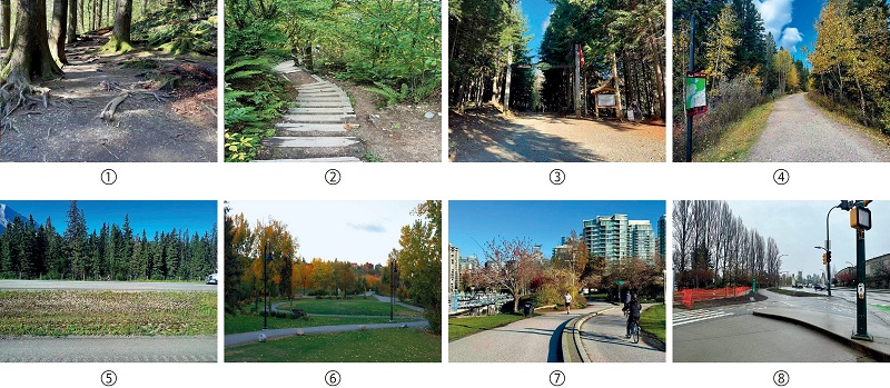 | 城市边缘区域 | 中 | 砂石、混合表面 | 游径 | 本那比市(Burnaby)本那比山保护区(Burnaby Mountain Conservation Area) | 使用木板与砂石等自然材料铺砌步道与台阶 | ② |