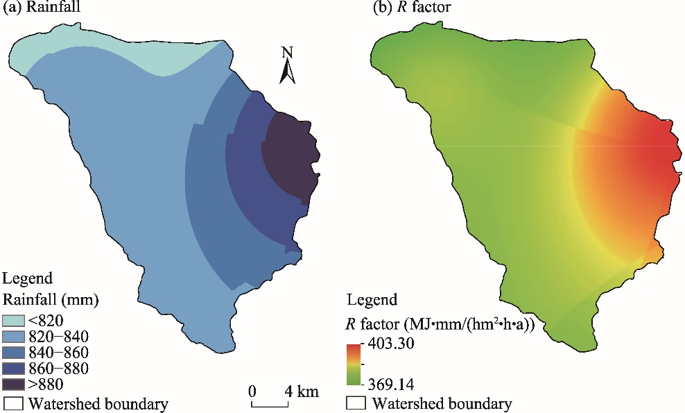 Fig. 3. Spatial distribution of average annual rainfall (a) and R factor (b). |