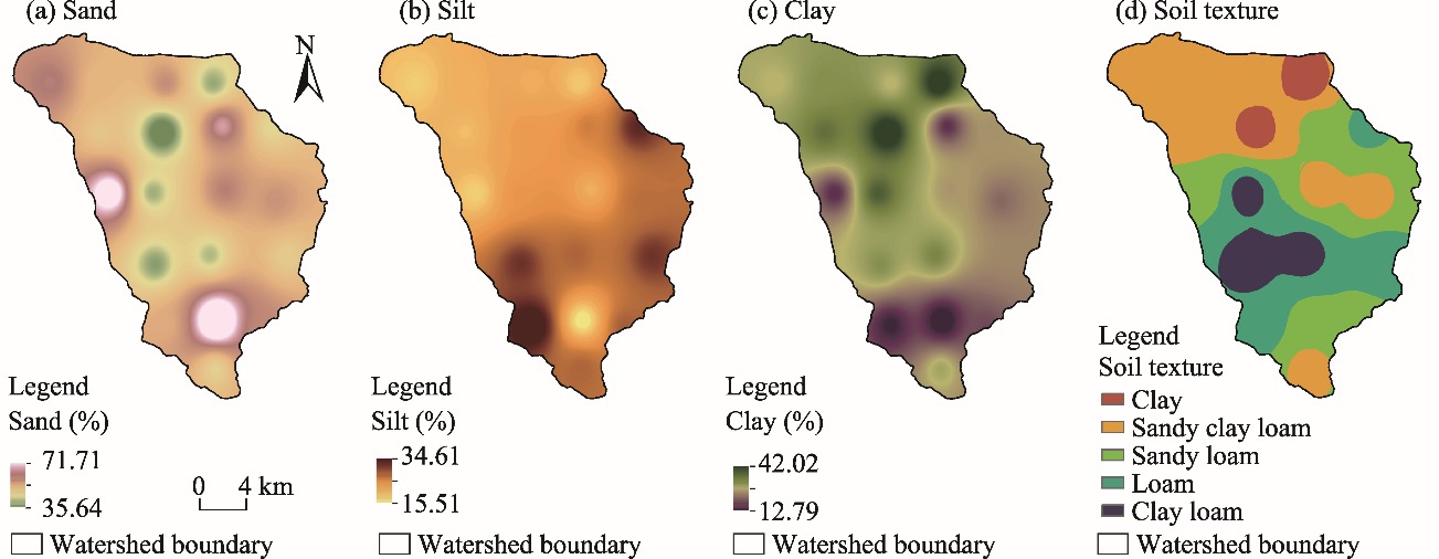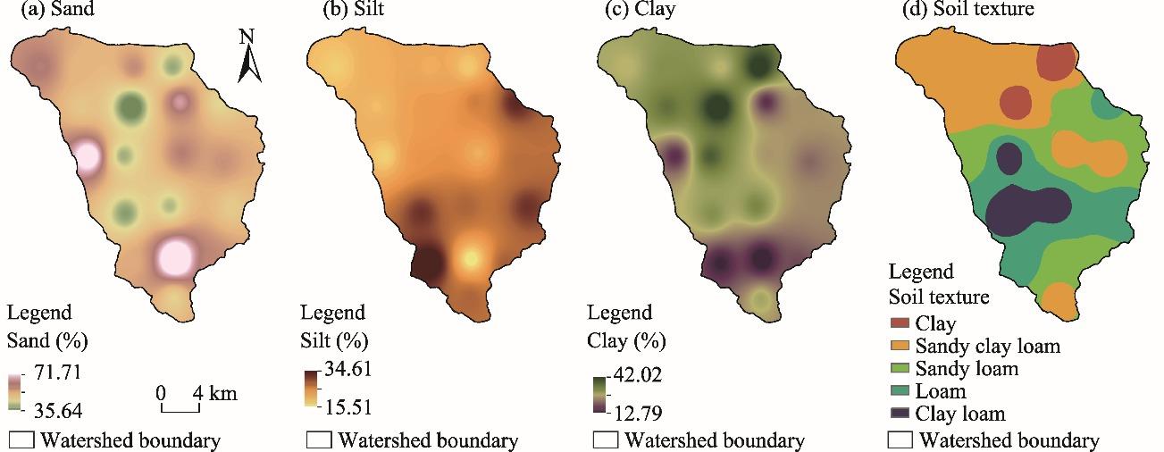 Fig. 5. Spatial distribution of sand (a), silt (b), clay (c), and soil texture (d). |
