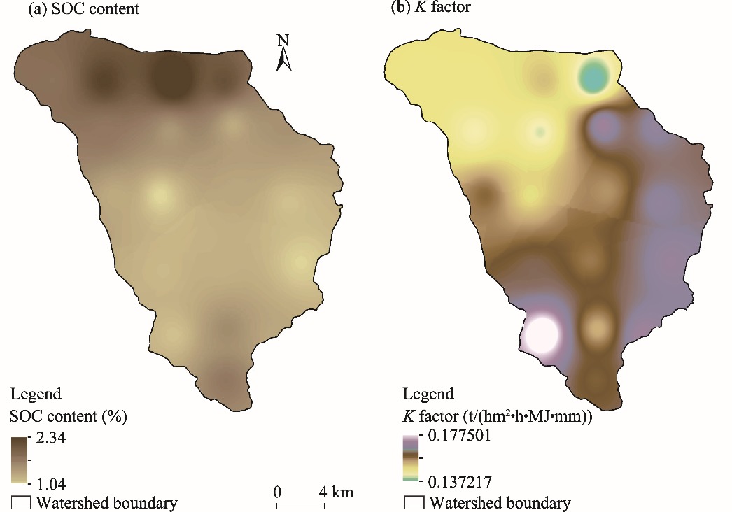 Fig. 6. Spatial distribution of soil organic carbon (SOC) content (a) and the K factor (b). |