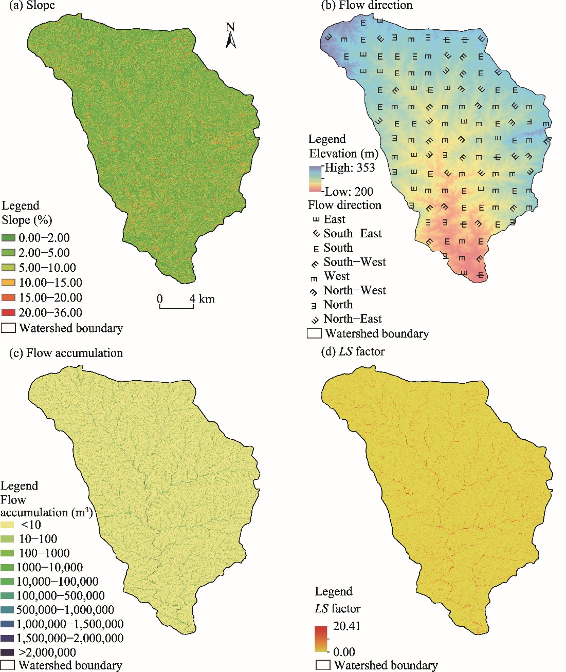Fig. 7. Spatial distribution of slope (a), flow direction (b), flow accumulation (c), and the LS factor (d). |