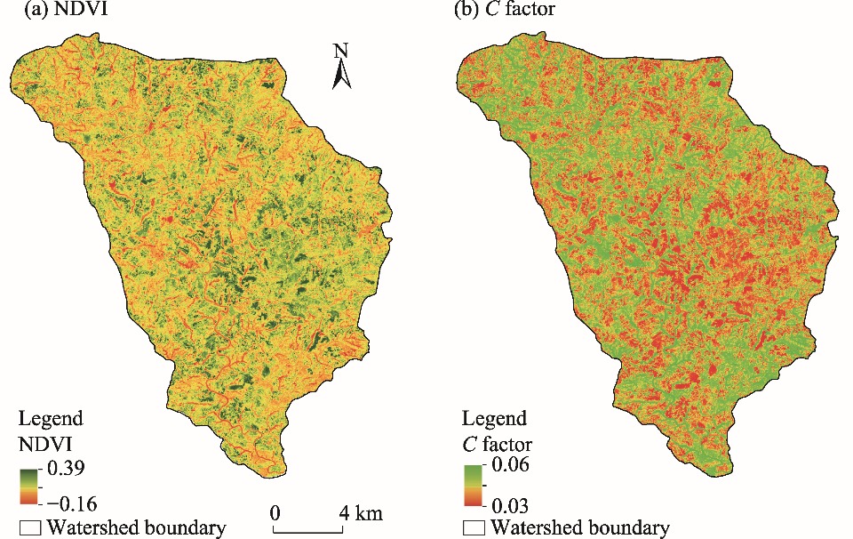 Fig. 8. Spatial distribution of NDVI (a) and the C factor (b). |